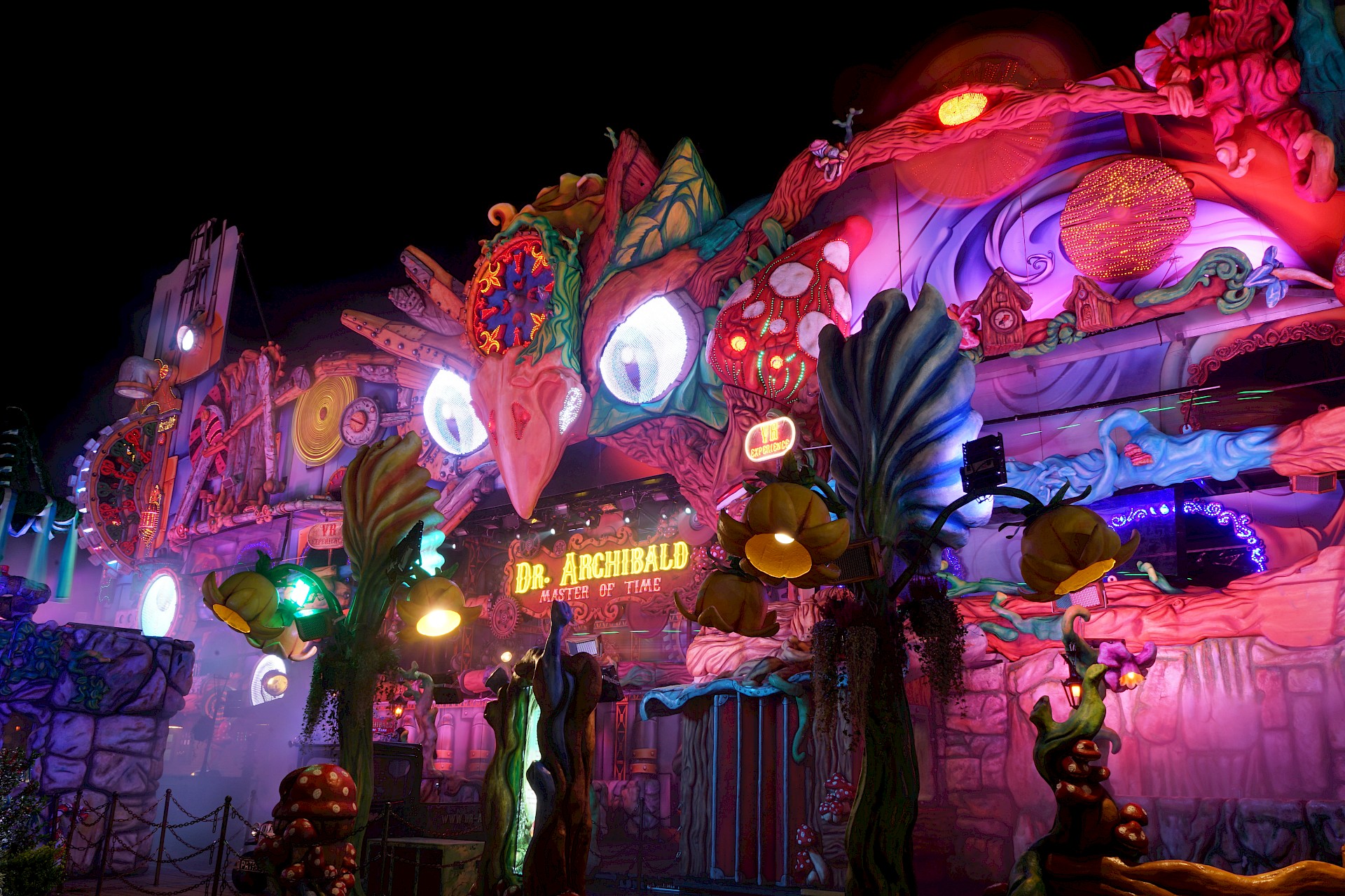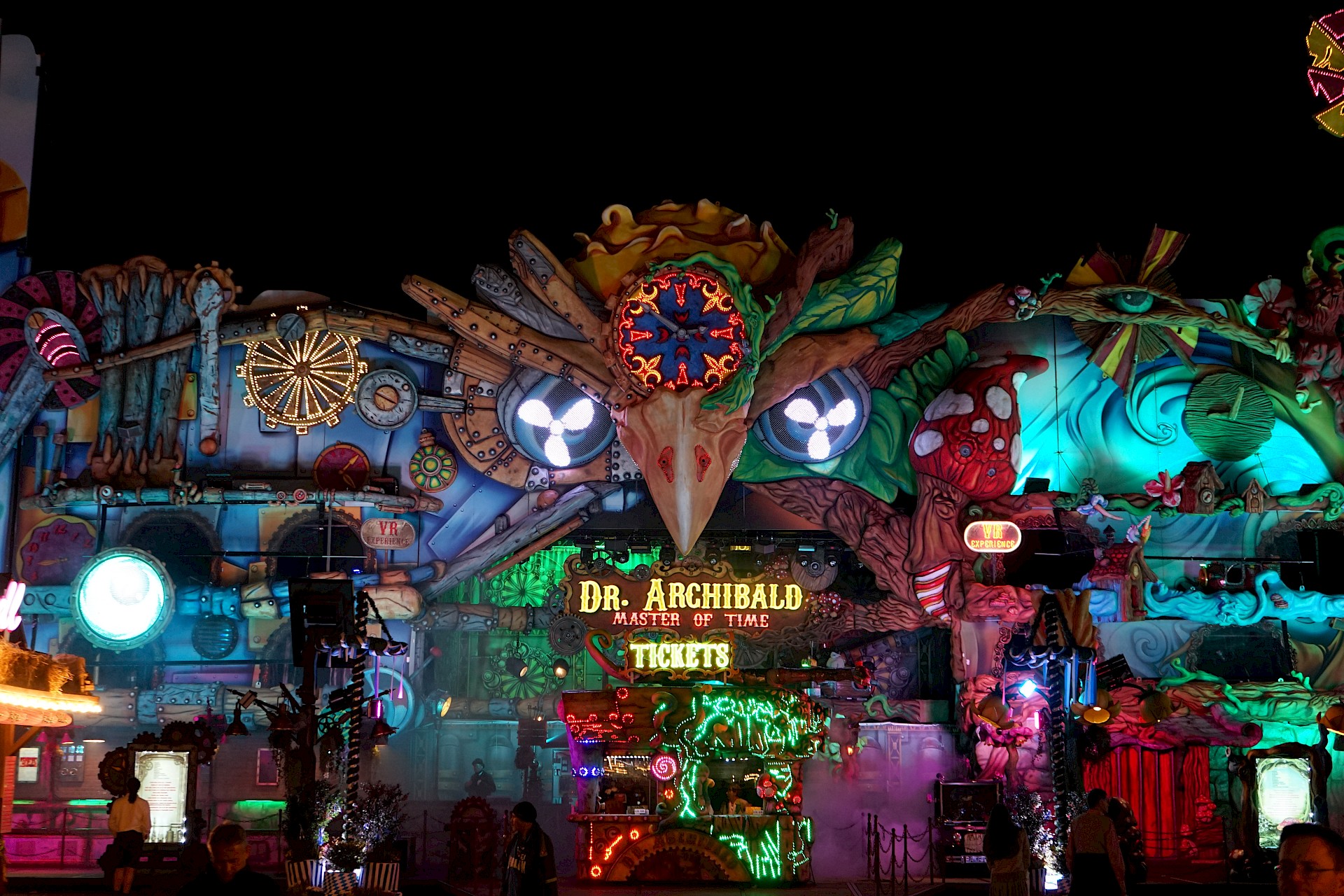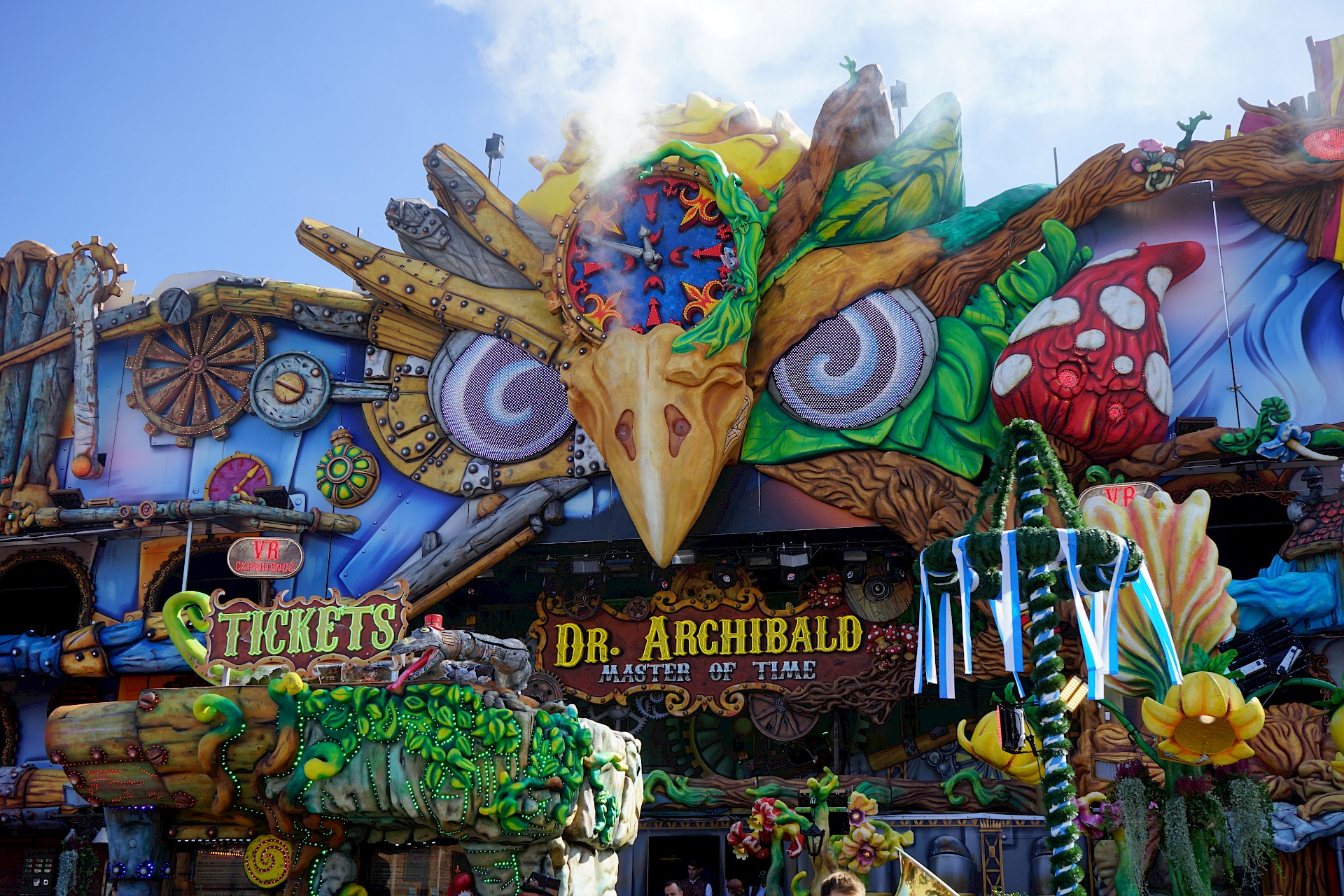 Dr. Archibald ist die erste Virtual-Reality-Attraktion auf der Wiesn. 2023 erhält sie einen zweiten Film. Oft ist, wenn von Neuheiten die Rede ist, im Wesentlichen die Reinkarnation einer bekannten Idee gemeint. Mit Dr. Archibald jedoch kam 2019 ein Fahrgeschäft auf die Wiesn, das tatsächlich ein völlig neues Erlebnis bietet. Und damit ist nicht nur die Tatsache gemeint, dass man hier nicht wie bei einer Geisterbahn an verschiedenen Figuren und im besten Fall Szenen vorbeifährt, sondern stattdessen dank einer Videobrille eine digitale Zeit- und Weltenreise erlebt. Denn auch die die Bahn umgebende Präsentation ist ungewohnt beeindruckend. Das beginnt, für jeden sofort ersichtlich, mit der halbwegs eingängig thematisierten, plastischen Fassade, und geht im Inneren weiter. Die Fahrt selber ist gefällig, auch wenn manche der wenigen echten Effekte leider nicht so sehr passen wollen. So bläst einem beispielsweise der Wind entgegen, wenn man in den Keller hinunterfährt, der voll von Feuerquellen ist. Hierbei verschenkt die Bahn bedauerlicherweise viel Überraschungspotential. Die VR-Brillen könnten einige Pixel mehr vertragen, die Synchronisation mit der Fahrt ist dafür großteils in Ordnung. Insgesamt ist Dr. Archibald ein für eine transportable Attraktion wahrhaft herausragendes Erlebnis mit etwas Luft nach oben. Auf der Wiesn 2023 feiert ein zweiter Film Premiere. Laut Kirmesparkrevue soll der neue Horrorfilm nach 20 Uhr gezeigt werden, außer man wünscht sich an der Kasse den alten Film.
