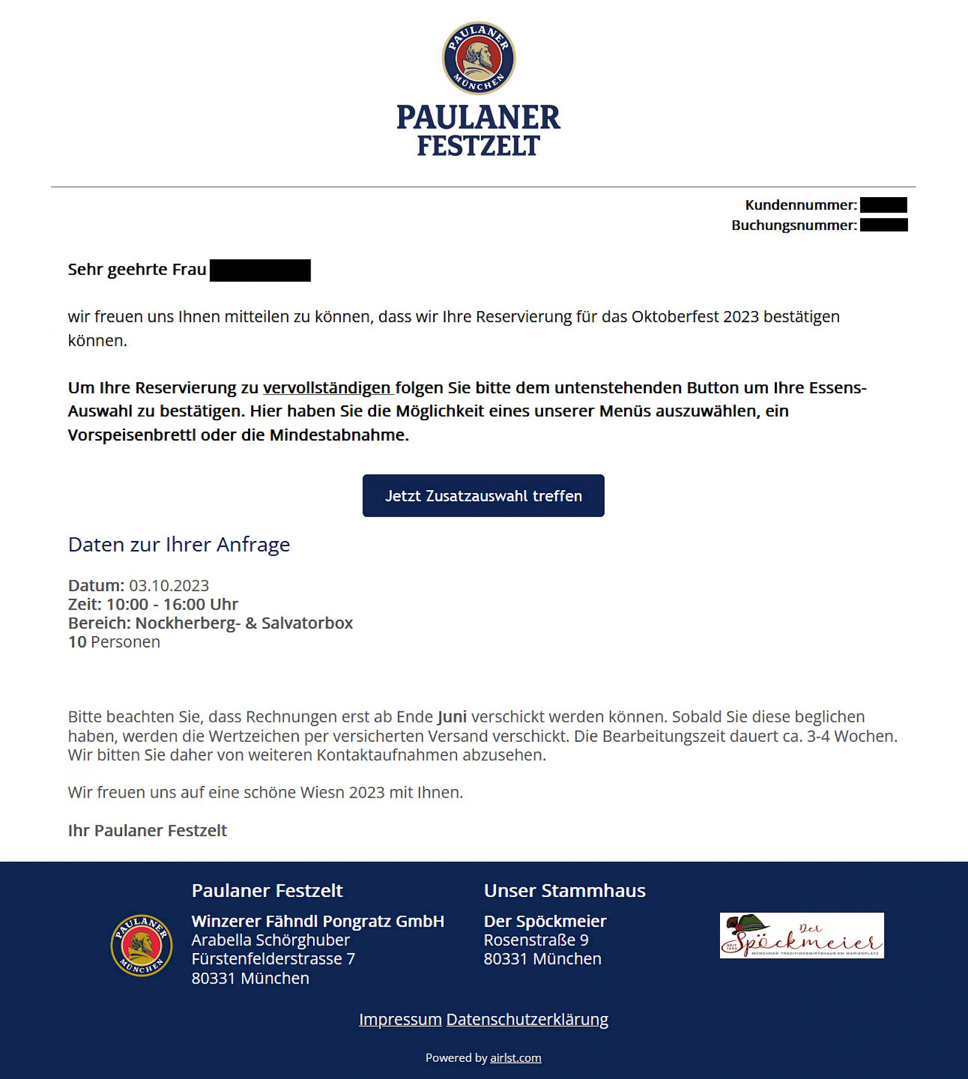 Noch einen Gang höher schaltet das Festzelt der Paulanerbrauerei. Der Betreff der Reservierungsbestätigung heißt missverständlicherweise, “Bitte vervollständigen Sie Ihre Buchung”. In der E-Mail selber ist die Nachricht über die Bestätigung der Reservierung dünn gedruckt, die direkt darunterstehende Aufforderung zur Vervollständigung hingegen deutlich hervorgehoben. Impliziert, wer zur Vervollständigung der Reservierung aufruft, nicht, dass sie bislang unvollständig ist? Vom Himmel fällt eine solch eigenartige Art der Reservierungsbestätigung jedenfalls nicht.