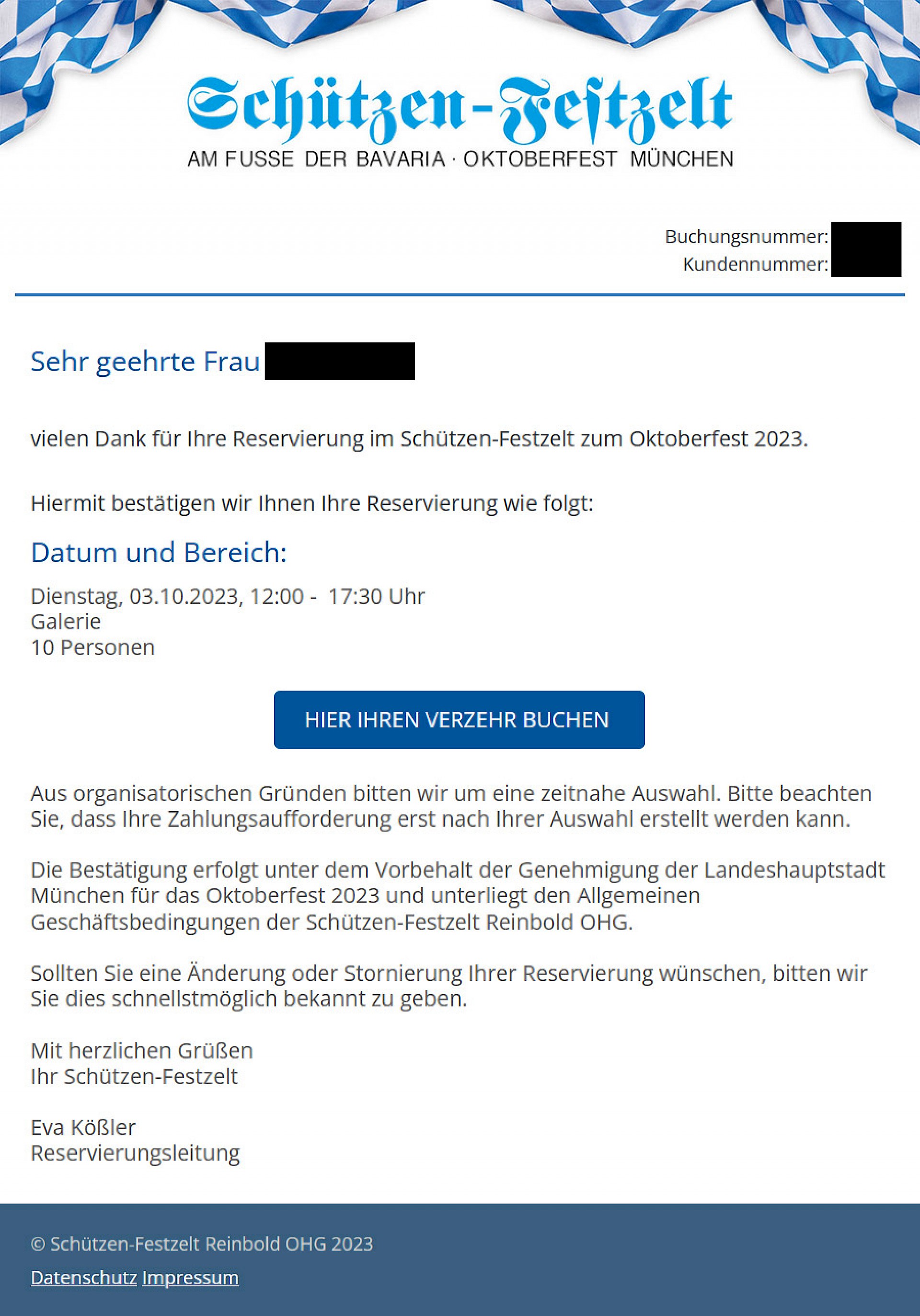 Während uns der Verbleib von Menüs in den Reservierungsformularen überrascht hat, war die Abfrage von Zusatzwünschen via E-Mail erwartbar. Interessant finden wir hierbei zwei Fälle. Beim Schützenfestzelt bekommt man nach der Bestellung des Mindestverzehrs eine Reservierungsbestätigung mit der Aufforderung den Verzehr zu buchen, obwohl man das doch bereits getan hat.