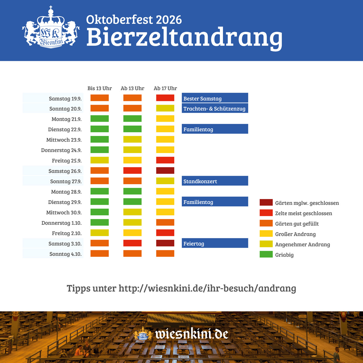 Deshalb gibt die Stadt München alljährlich das Wiesnbarometer heraus, damit der Andrang nach Tag und Tageszeit besser abgeschätzt werden kann. Wir haben untenstehend dieses Konzept abgewandelt, um den Andrang in den Bierzelten abzuschätzen. Schließlich unterscheidet sich dieser in der Regel stark vom Andrang auf den Straßen.