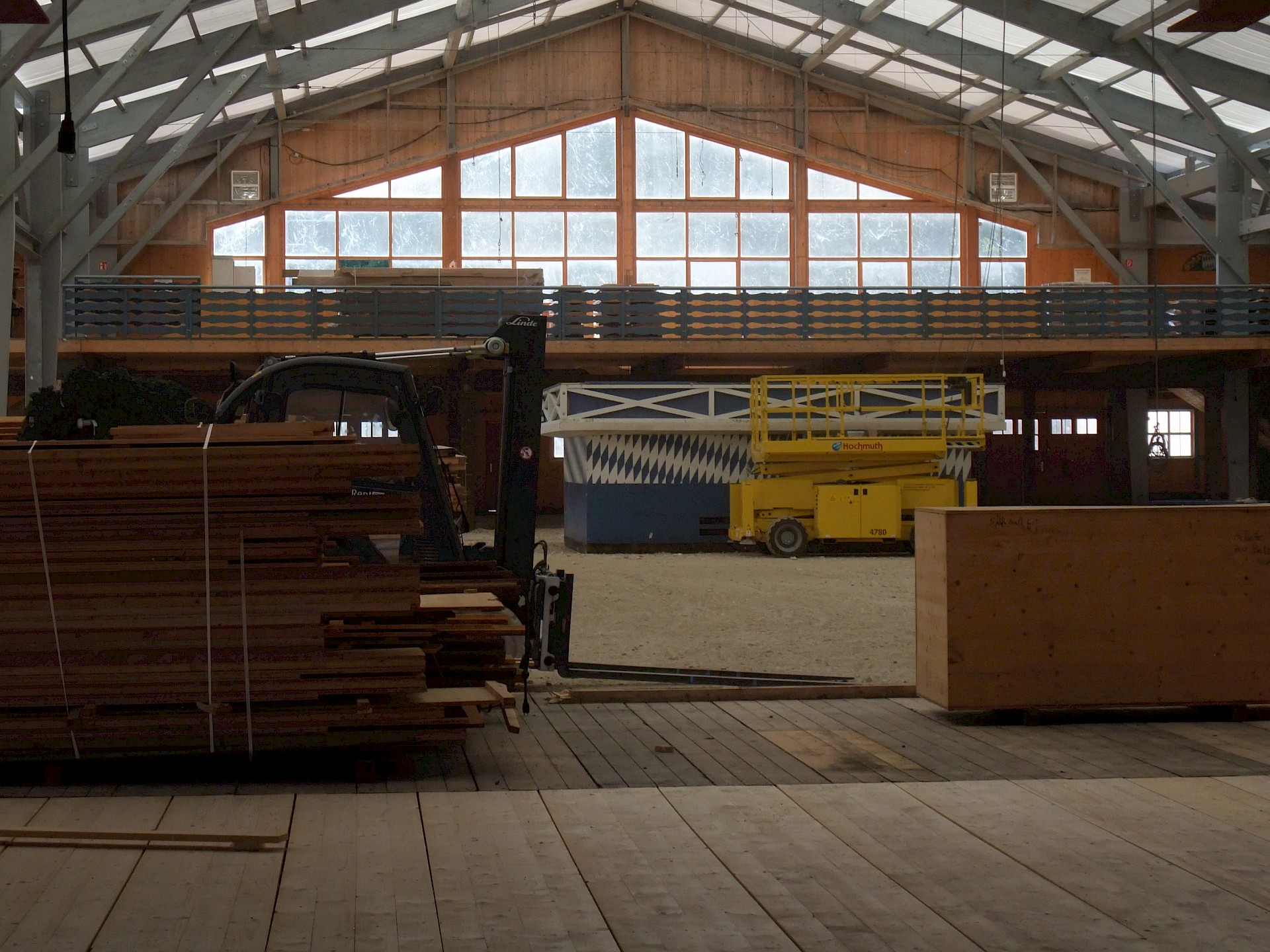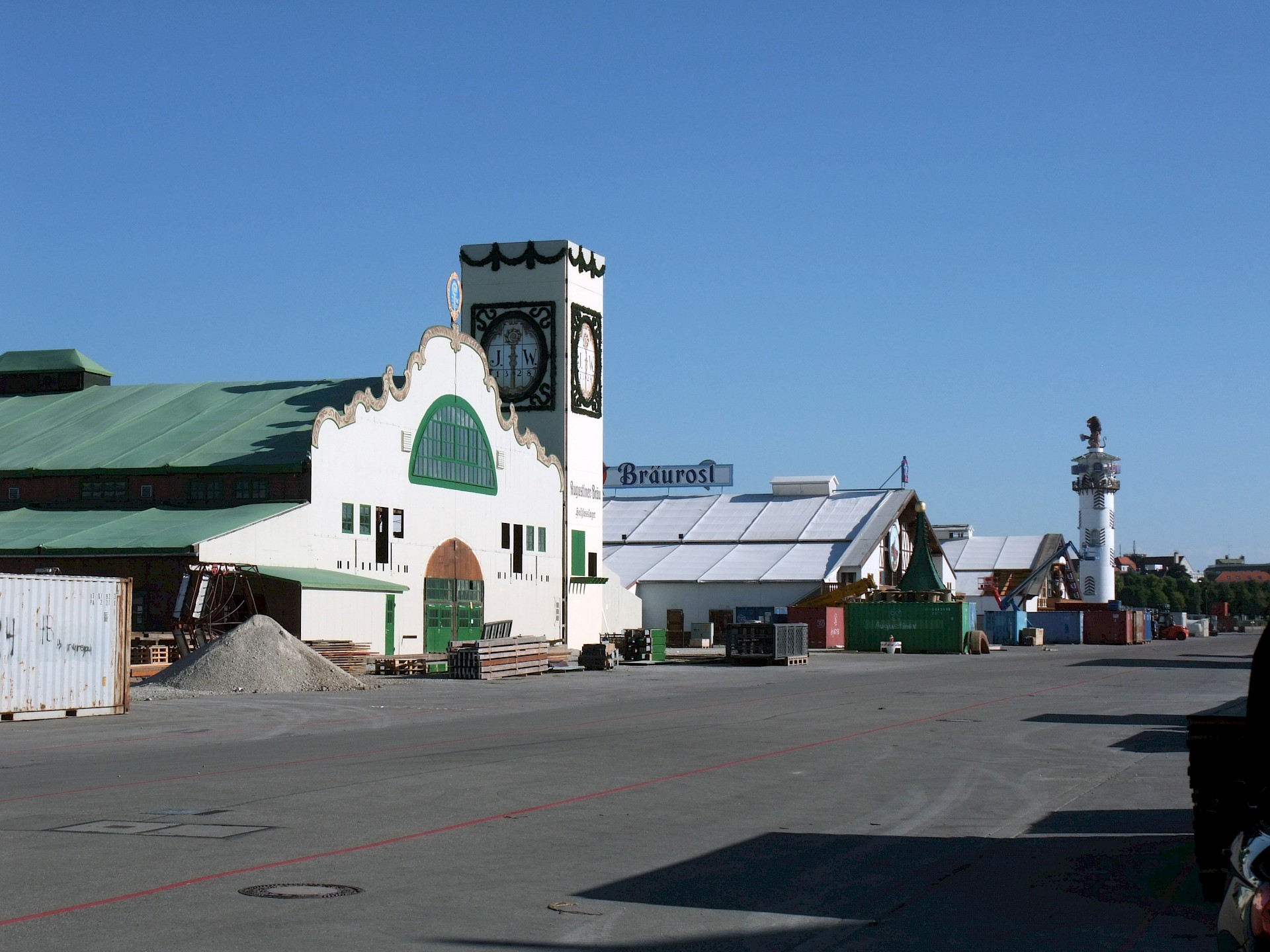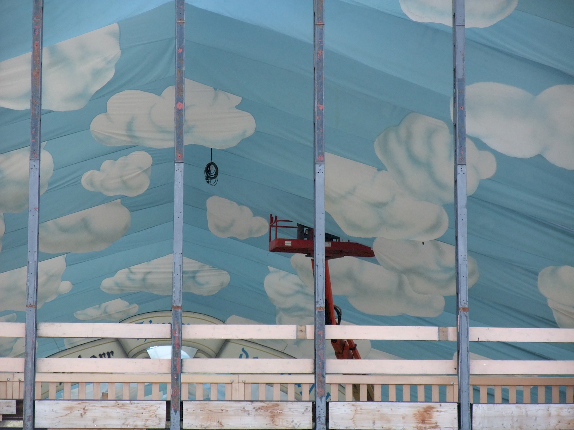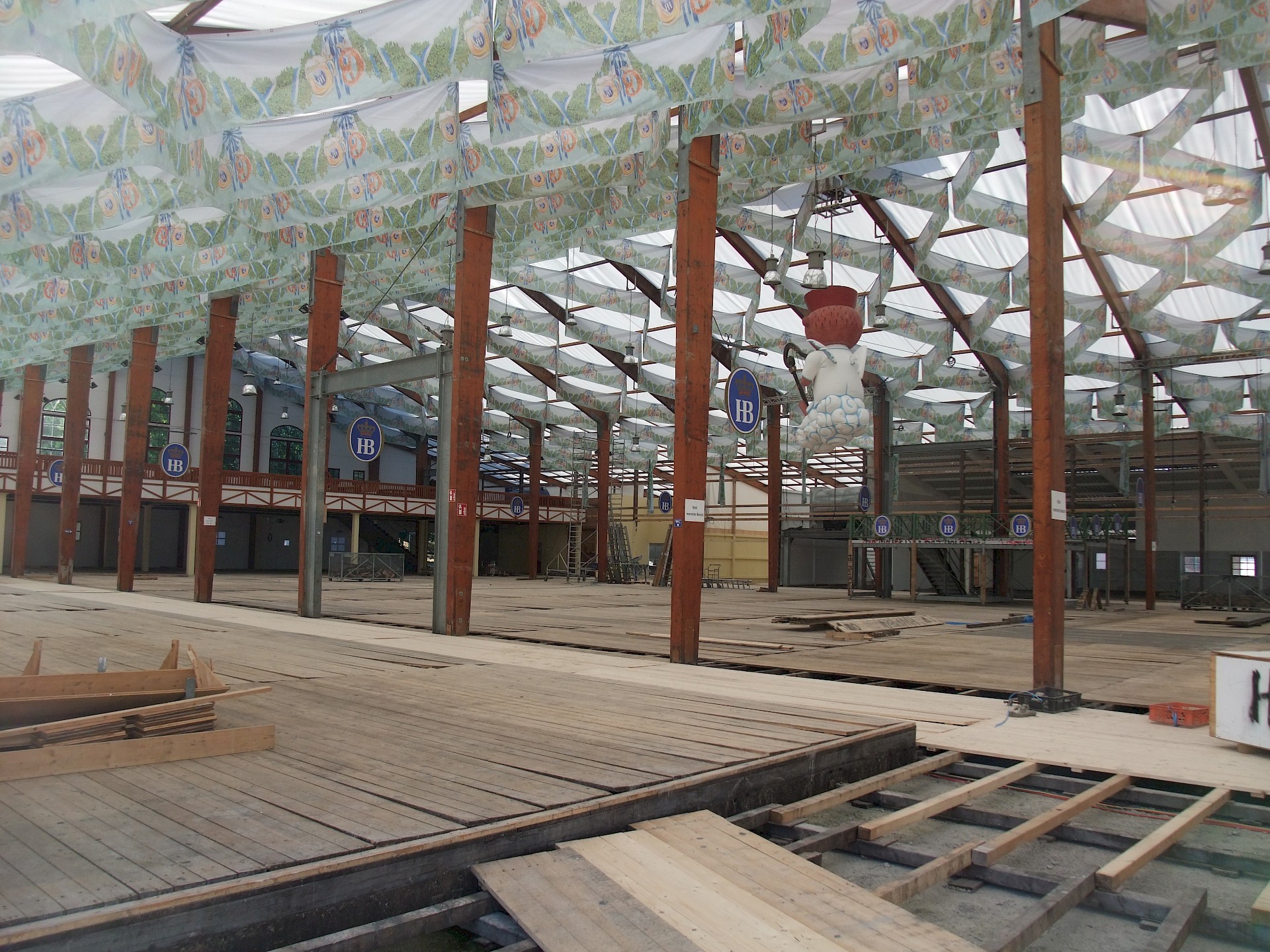 Während das Hofbräuzelt inzwischen seine Krönung erfahren hat und auch der Aloisius bereits über den Innenausbau wacht, hat die Fischer-Vroni noch nicht einmal eine Front. Auch beim Winzerer-Fähndl ist an Dekoration noch nicht zu denken. Der Löwenbräu-Löwe vermisst doch tatsächlich einen Arm – glücklicherweise nicht den wichtigen Trinkarm. Das Schützenzelt schmeißt sich schön langsam in seine bekannten Tücher. Auch der Raucherbalkon und die Dimensionen der Galerie werden deutlicher.