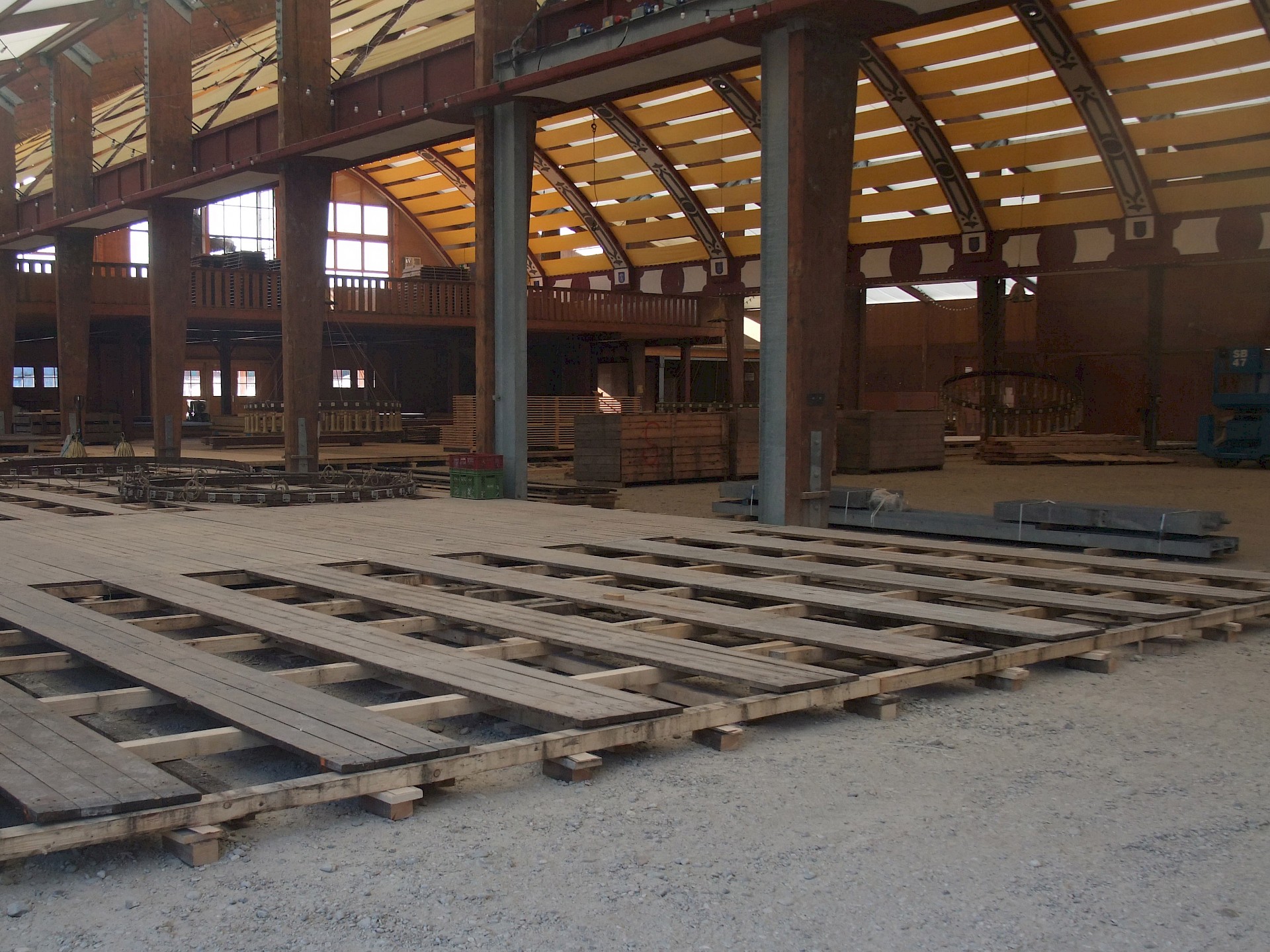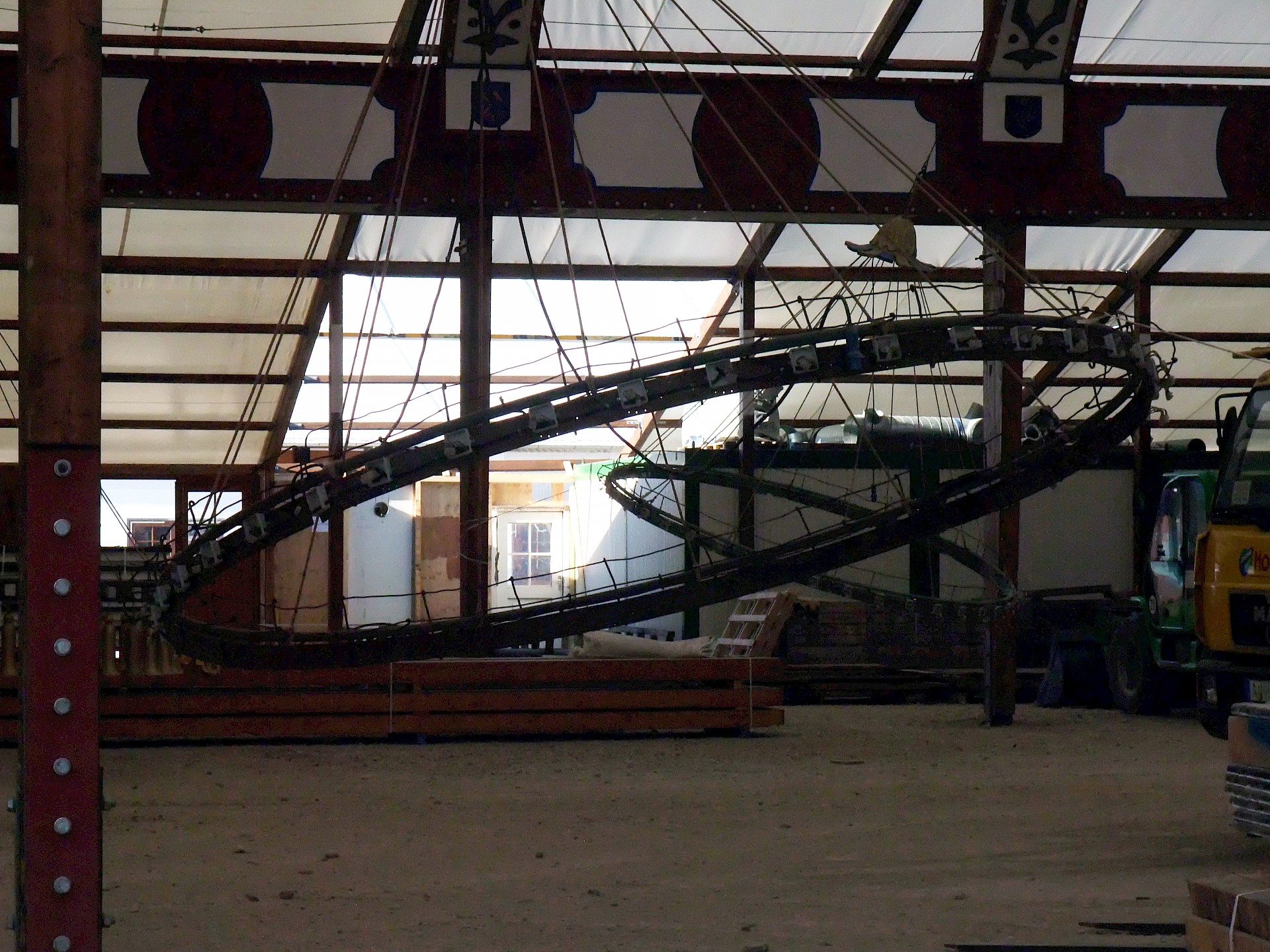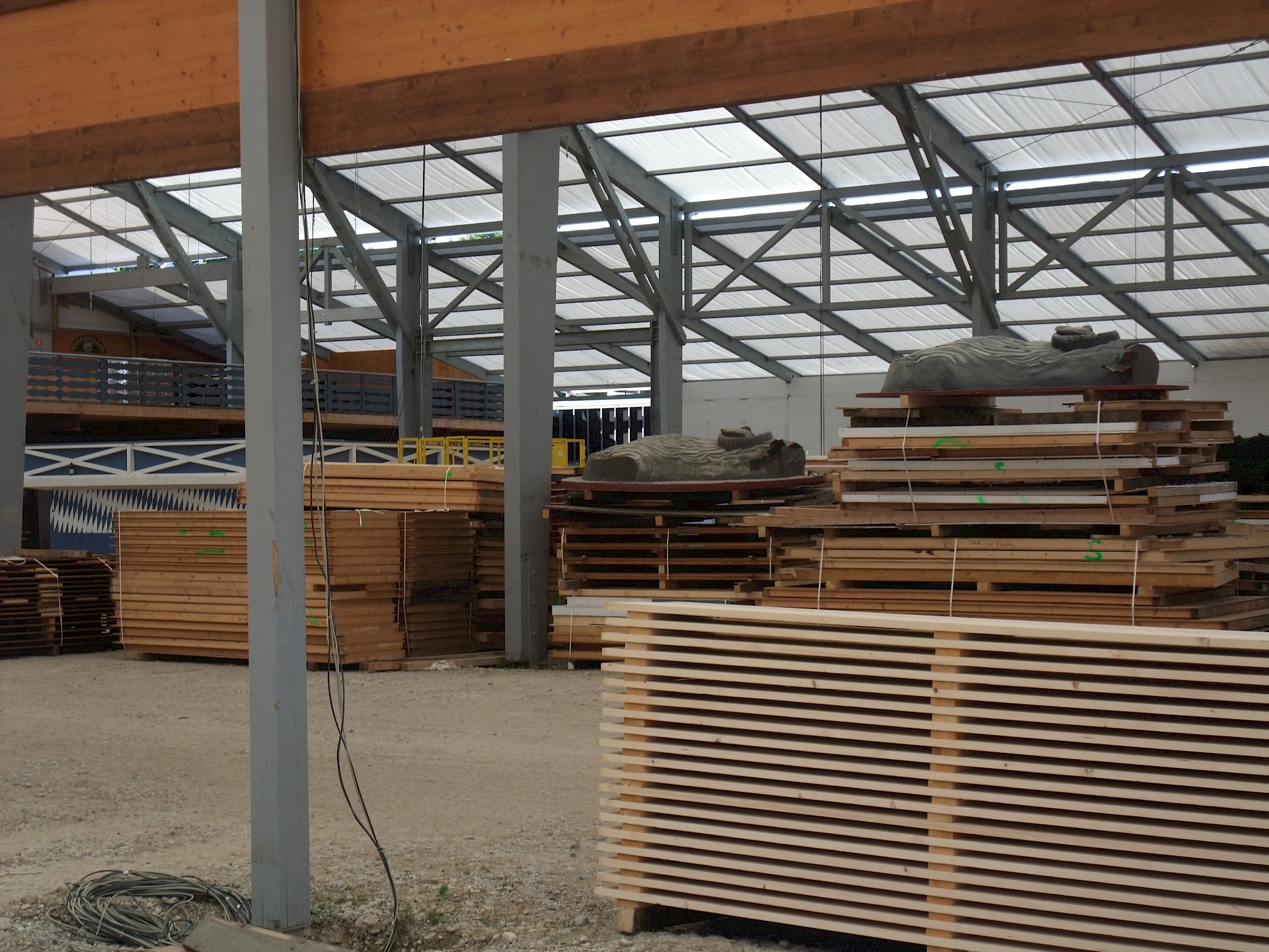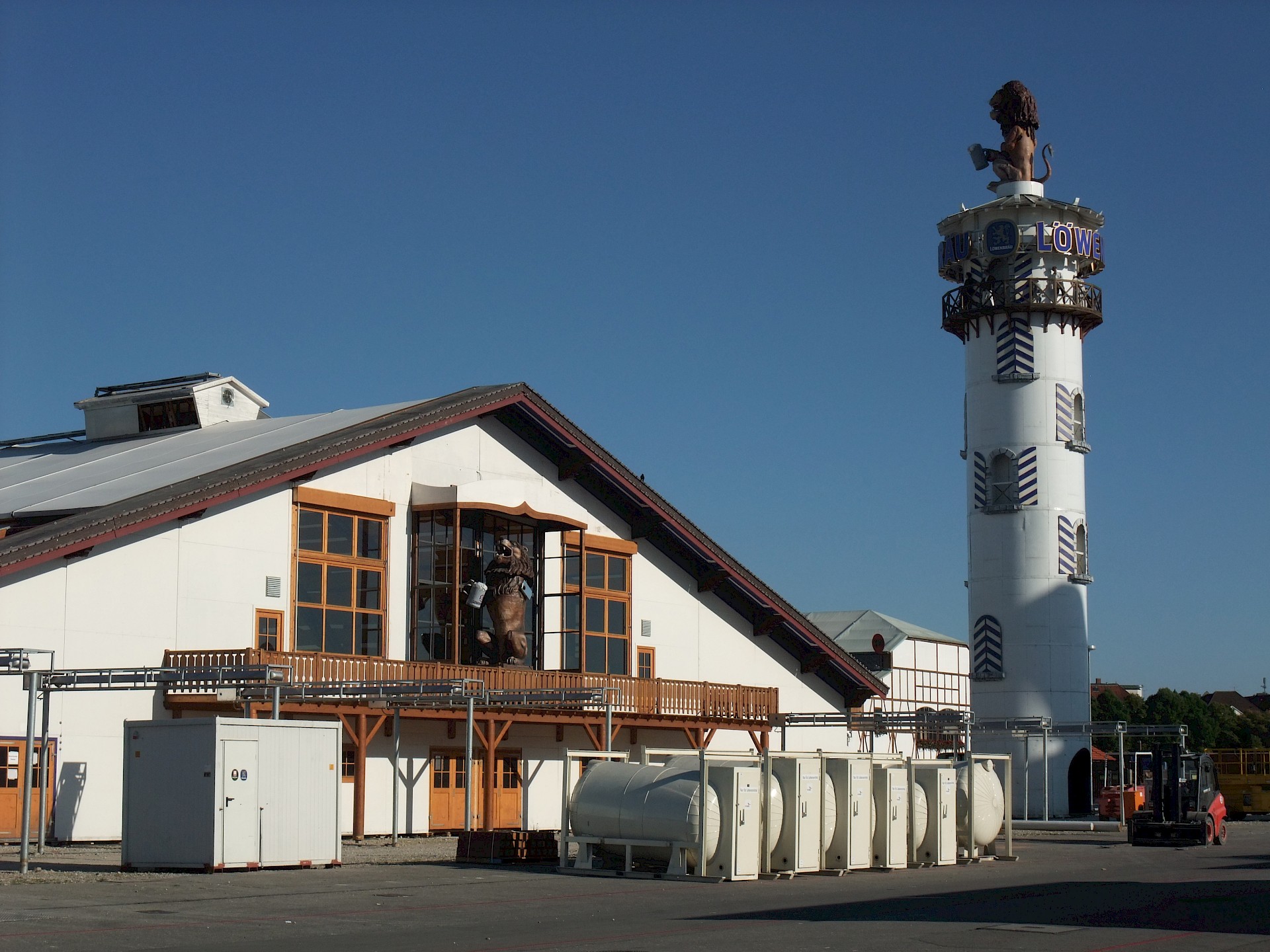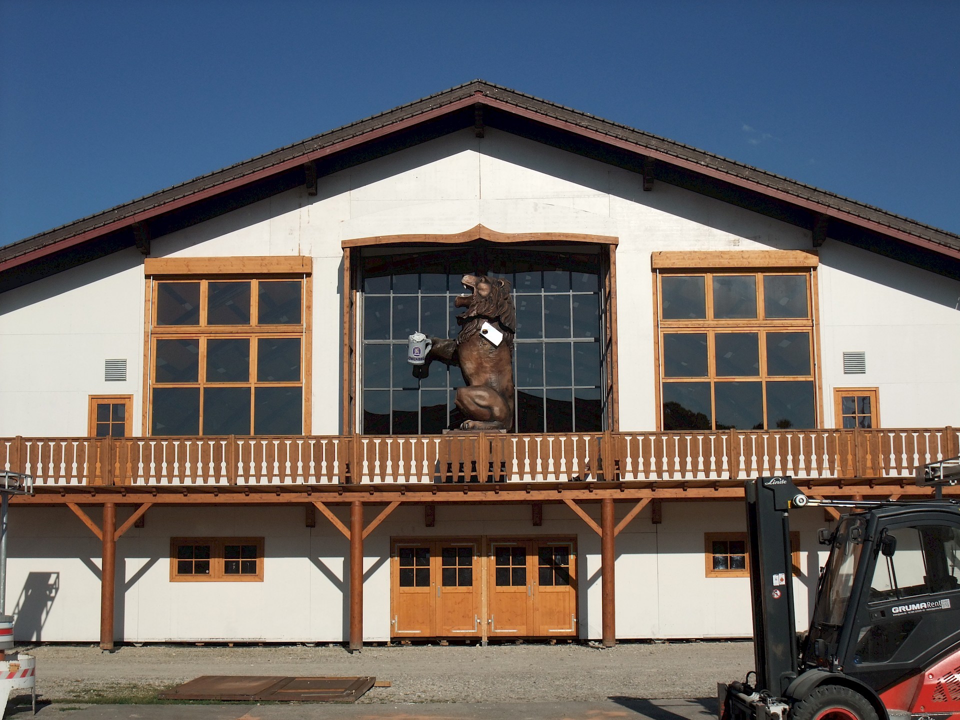 Während das Hofbräuzelt inzwischen seine Krönung erfahren hat und auch der Aloisius bereits über den Innenausbau wacht, hat die Fischer-Vroni noch nicht einmal eine Front. Auch beim Winzerer-Fähndl ist an Dekoration noch nicht zu denken. Der Löwenbräu-Löwe vermisst doch tatsächlich einen Arm – glücklicherweise nicht den wichtigen Trinkarm. Das Schützenzelt schmeißt sich schön langsam in seine bekannten Tücher. Auch der Raucherbalkon und die Dimensionen der Galerie werden deutlicher.