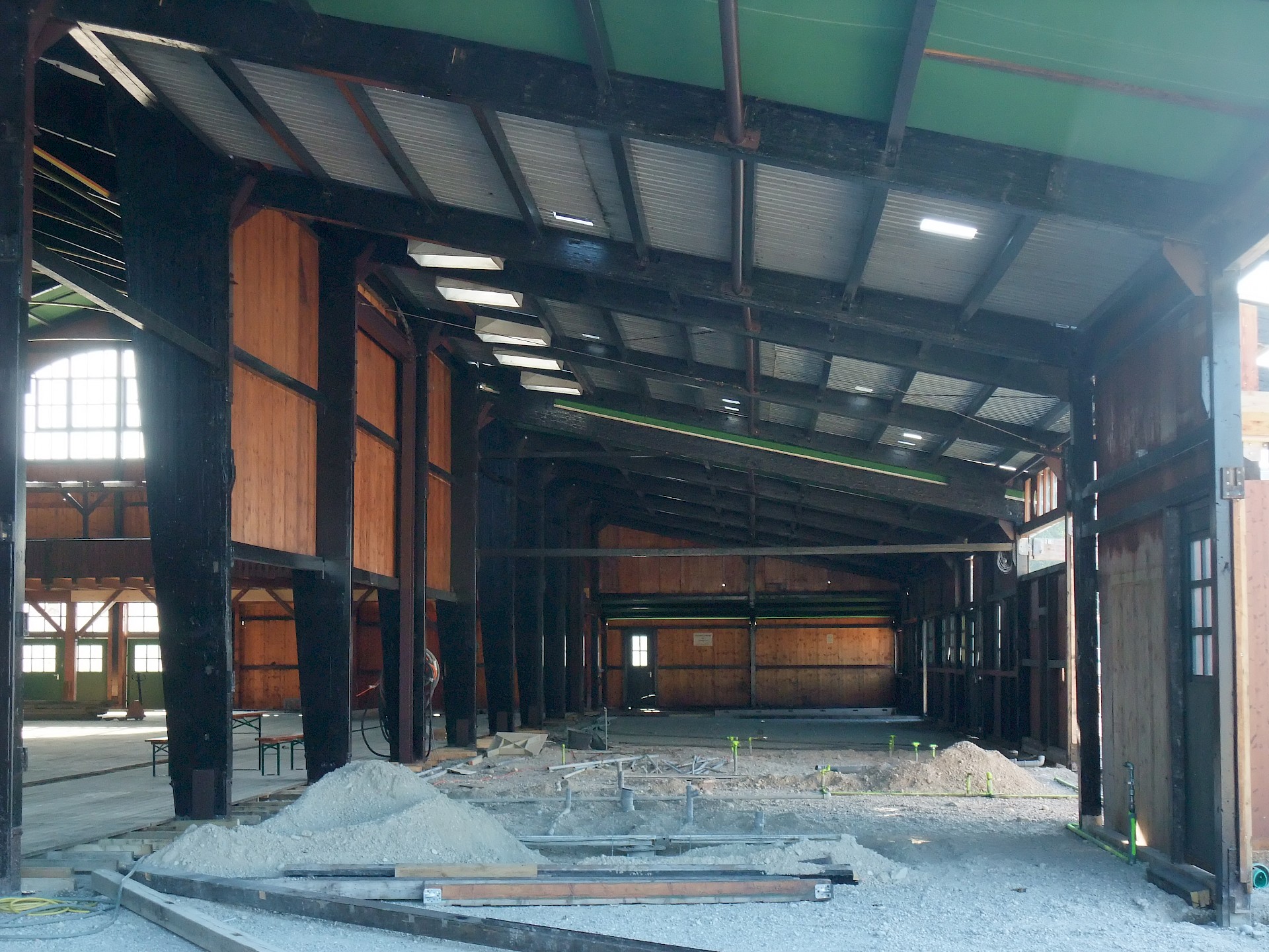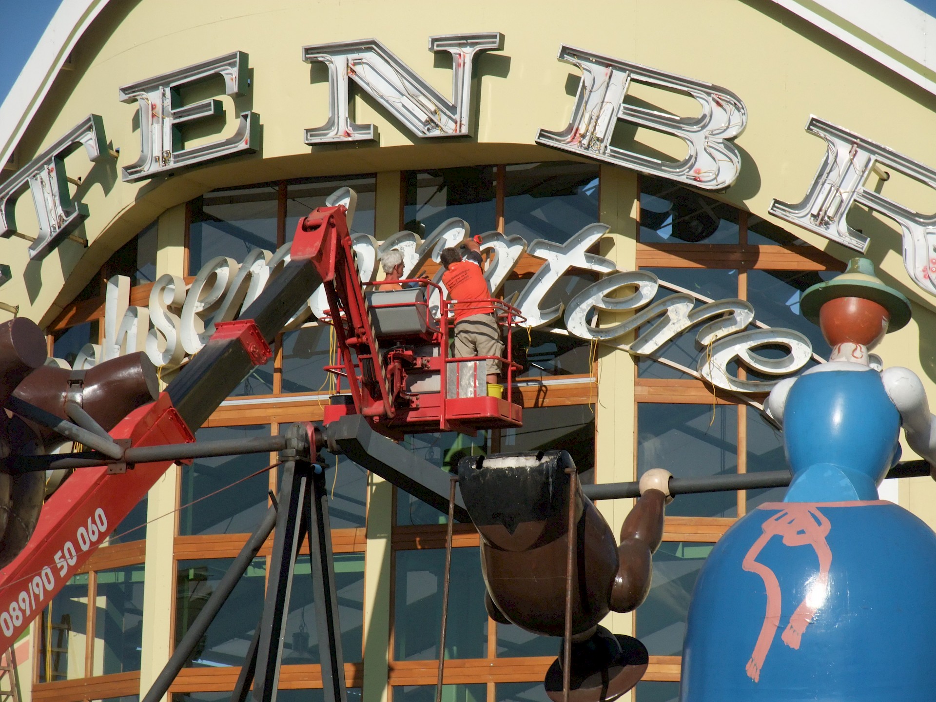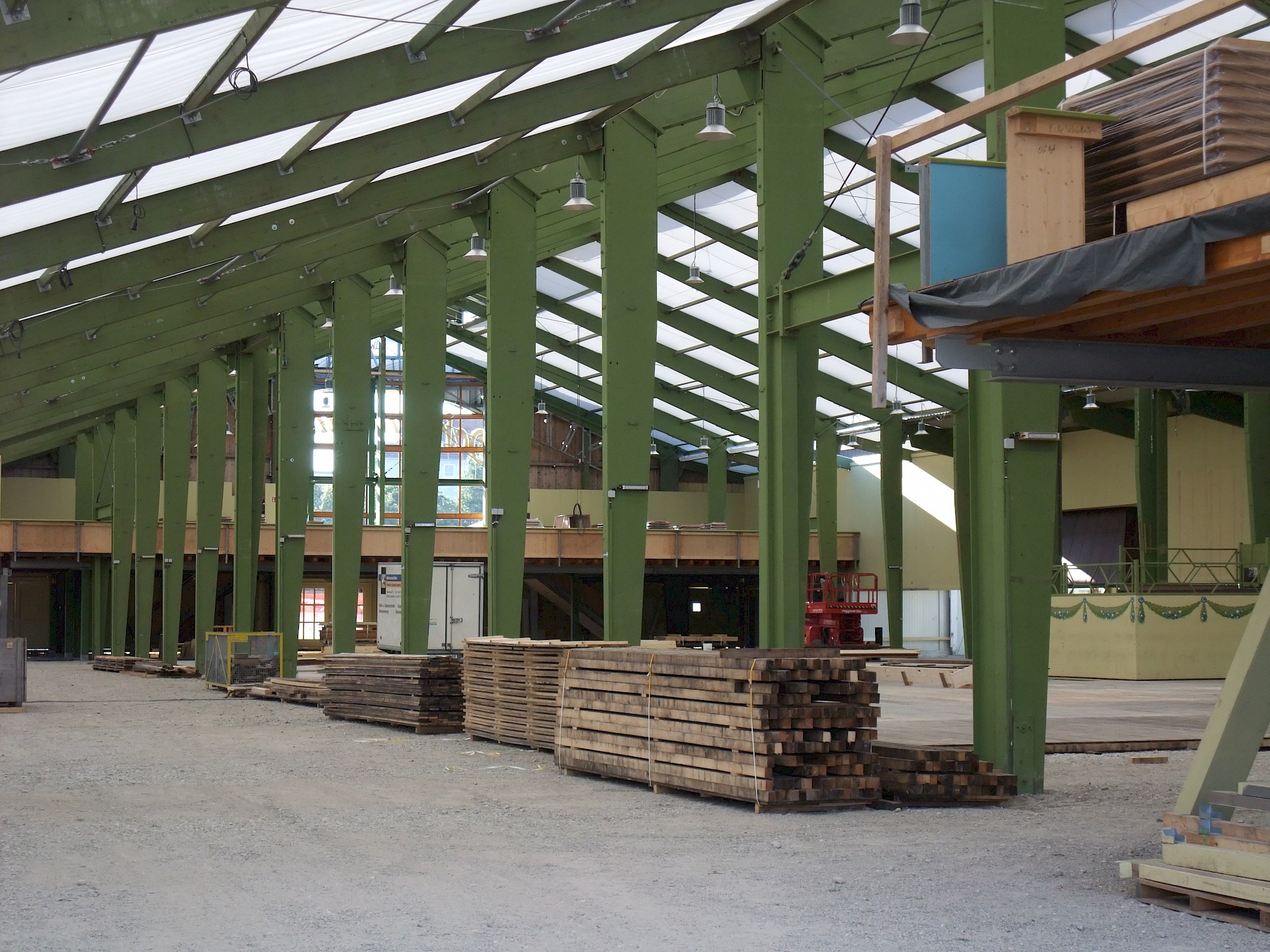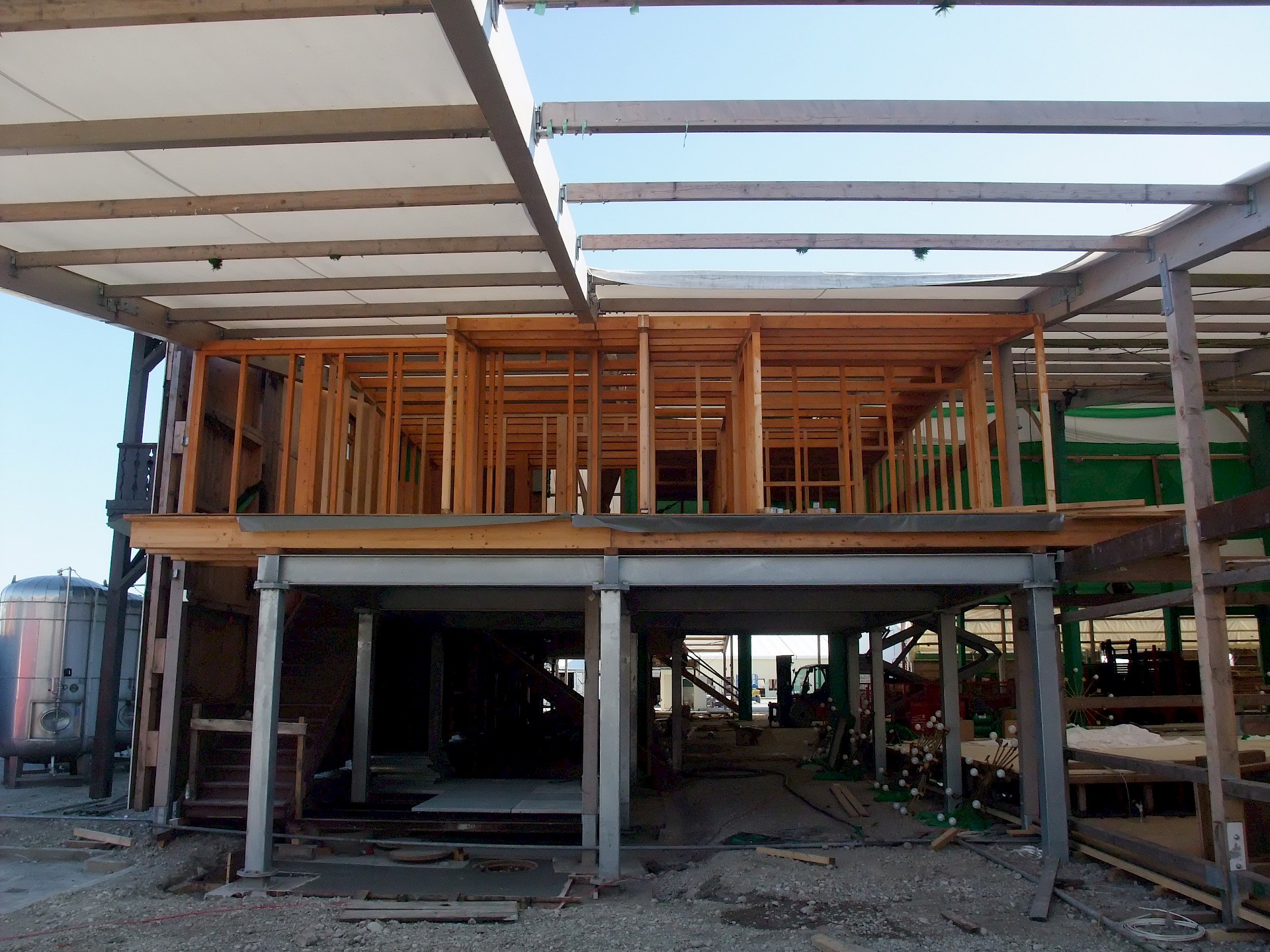 Während das Hofbräuzelt inzwischen seine Krönung erfahren hat und auch der Aloisius bereits über den Innenausbau wacht, hat die Fischer-Vroni noch nicht einmal eine Front. Auch beim Winzerer-Fähndl ist an Dekoration noch nicht zu denken. Der Löwenbräu-Löwe vermisst doch tatsächlich einen Arm – glücklicherweise nicht den wichtigen Trinkarm. Das Schützenzelt schmeißt sich schön langsam in seine bekannten Tücher. Auch der Raucherbalkon und die Dimensionen der Galerie werden deutlicher.