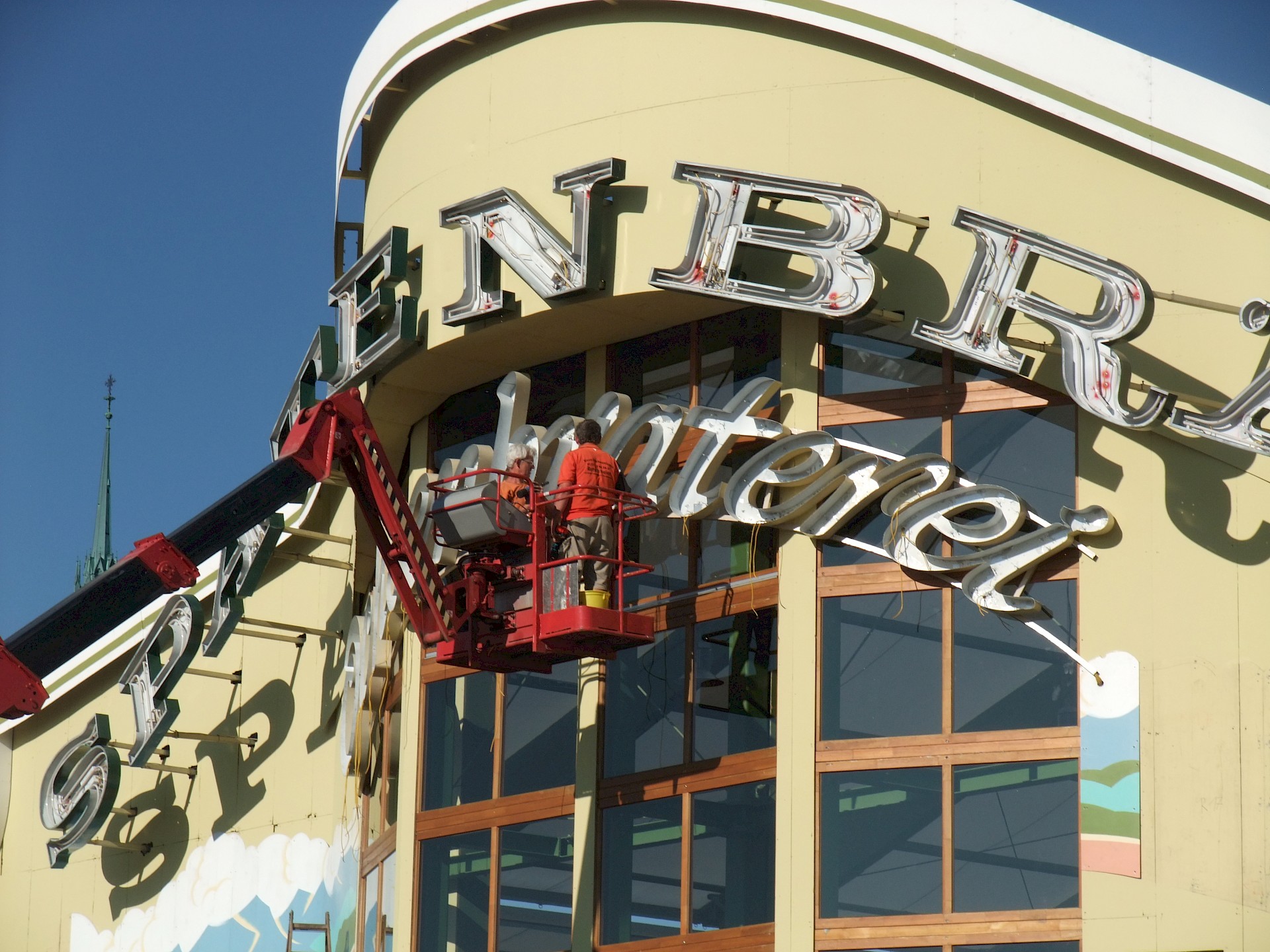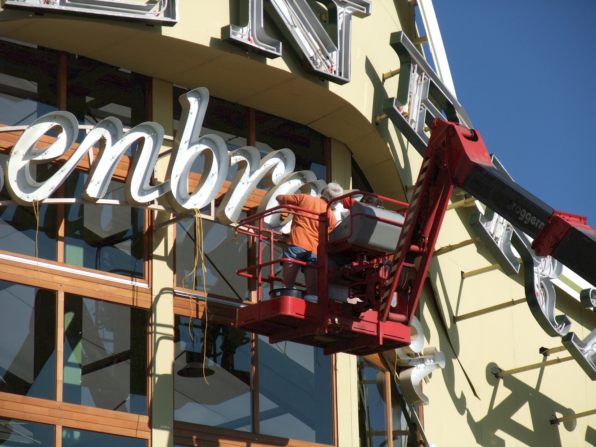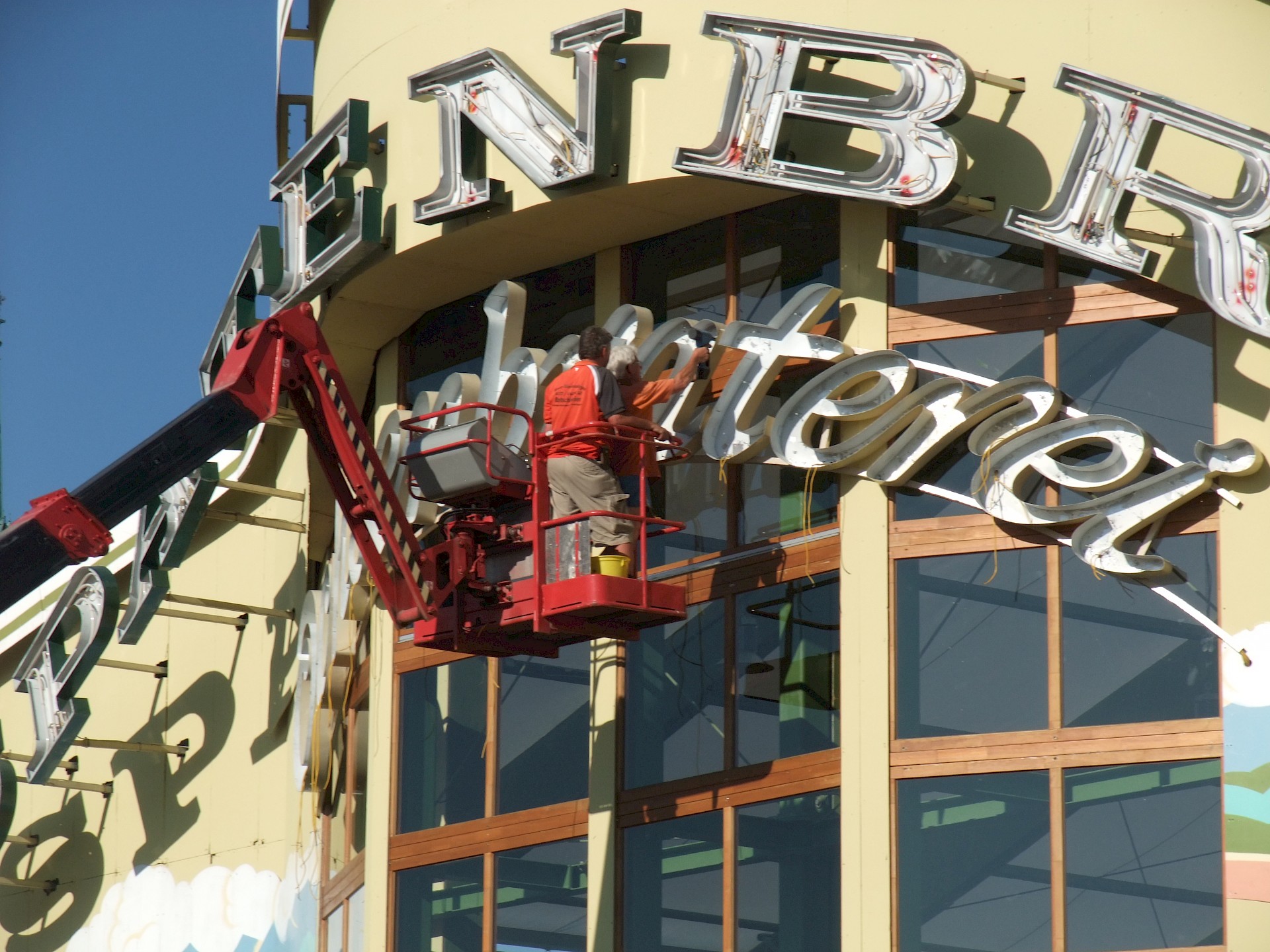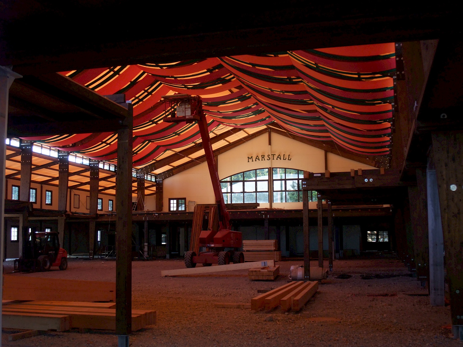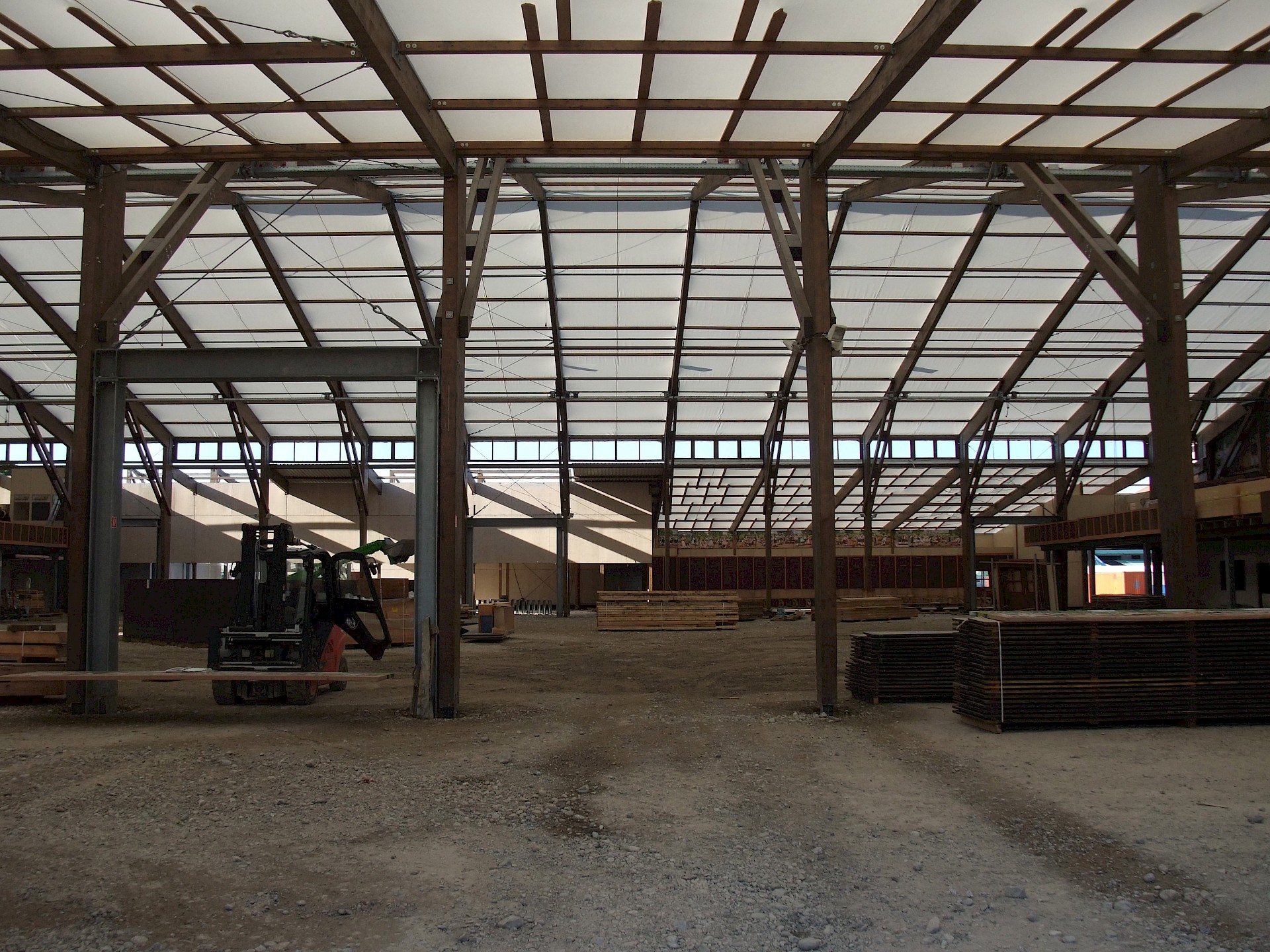 Während das Hofbräuzelt inzwischen seine Krönung erfahren hat und auch der Aloisius bereits über den Innenausbau wacht, hat die Fischer-Vroni noch nicht einmal eine Front. Auch beim Winzerer-Fähndl ist an Dekoration noch nicht zu denken. Der Löwenbräu-Löwe vermisst doch tatsächlich einen Arm – glücklicherweise nicht den wichtigen Trinkarm. Das Schützenzelt schmeißt sich schön langsam in seine bekannten Tücher. Auch der Raucherbalkon und die Dimensionen der Galerie werden deutlicher.
