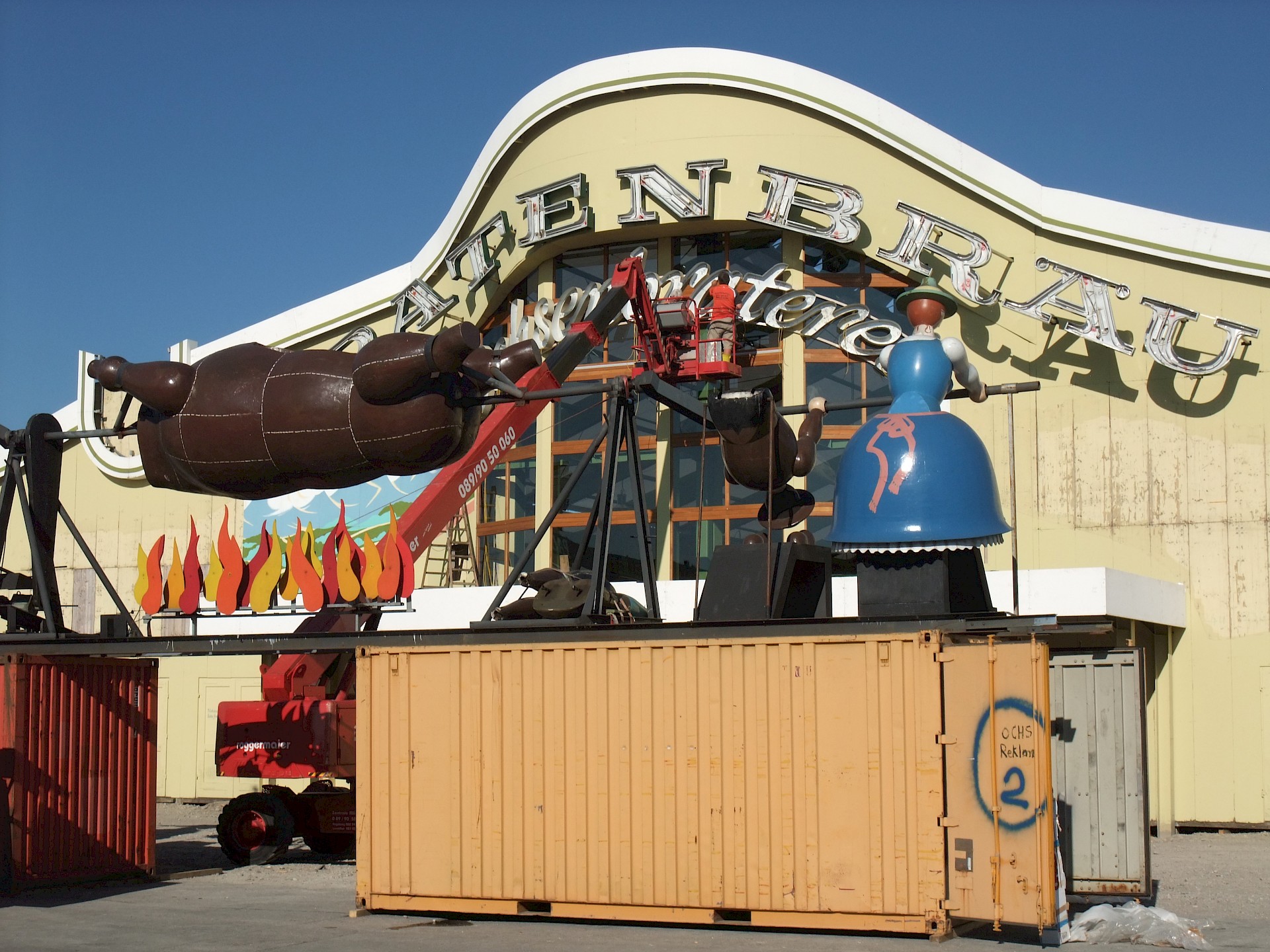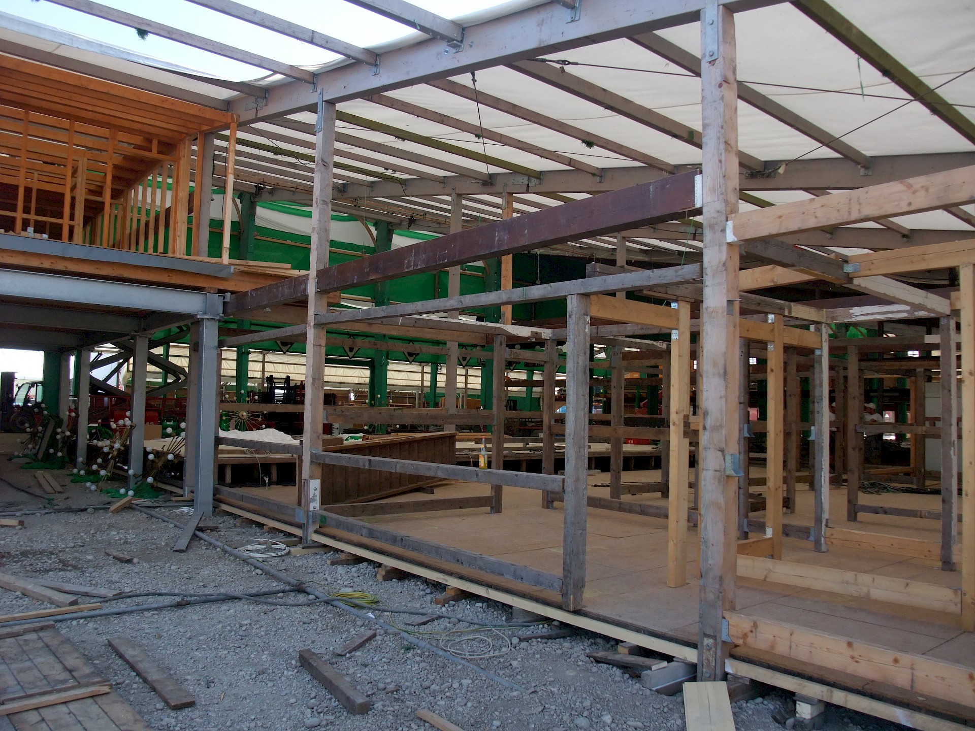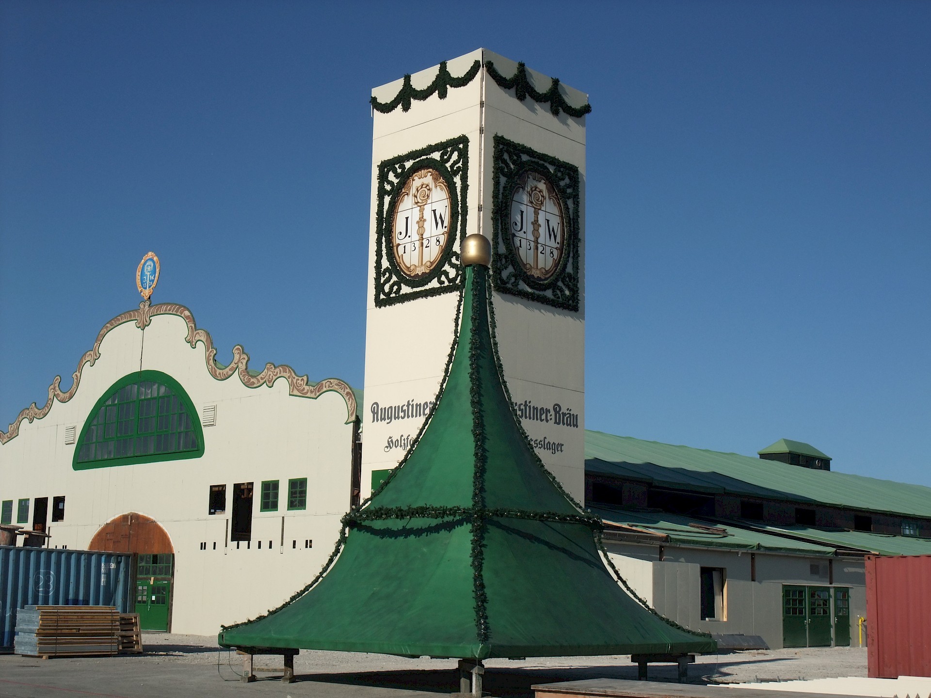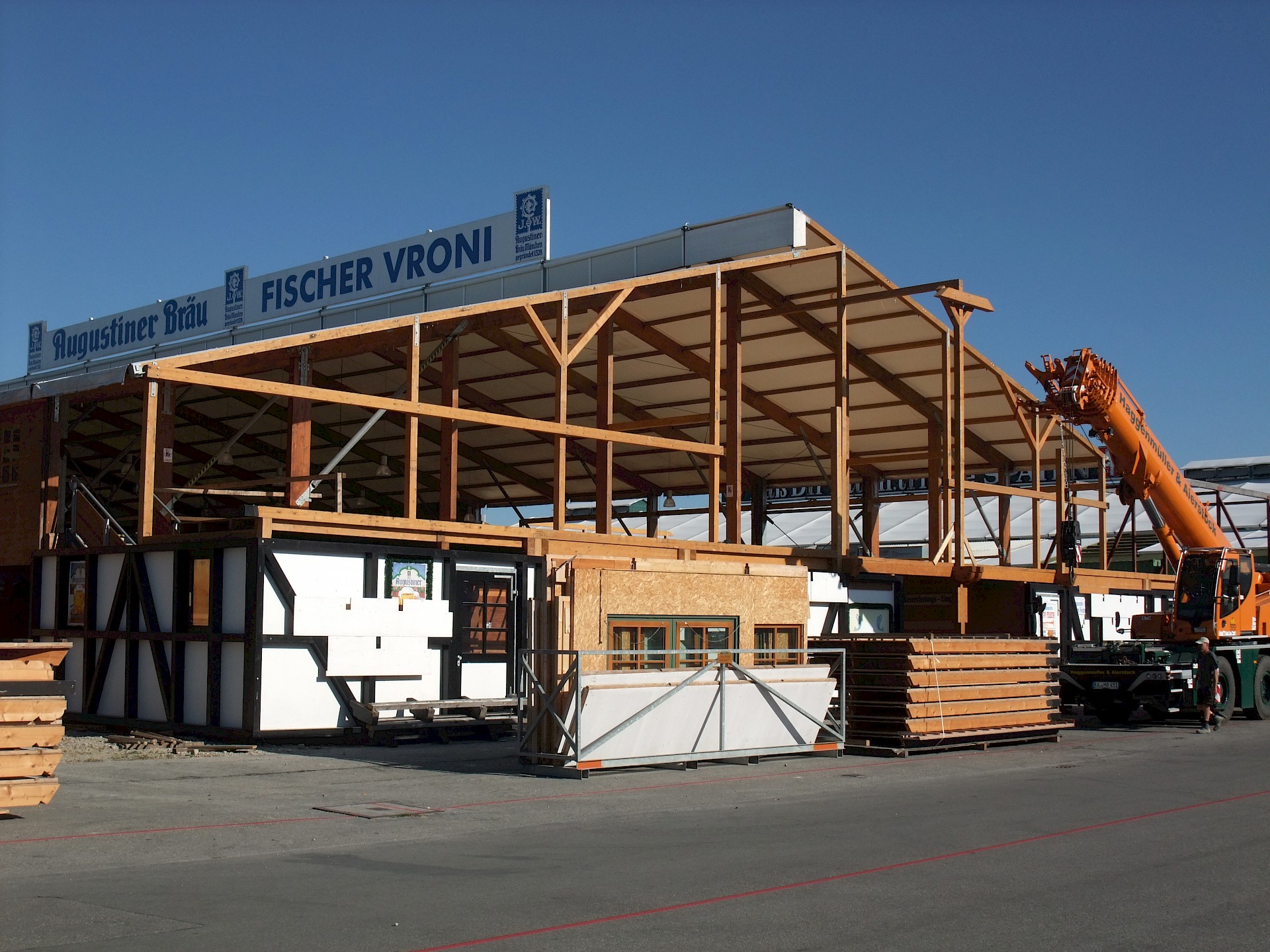Während das Hofbräuzelt inzwischen seine Krönung erfahren hat und auch der Aloisius bereits über den Innenausbau wacht, hat die Fischer-Vroni noch nicht einmal eine Front.