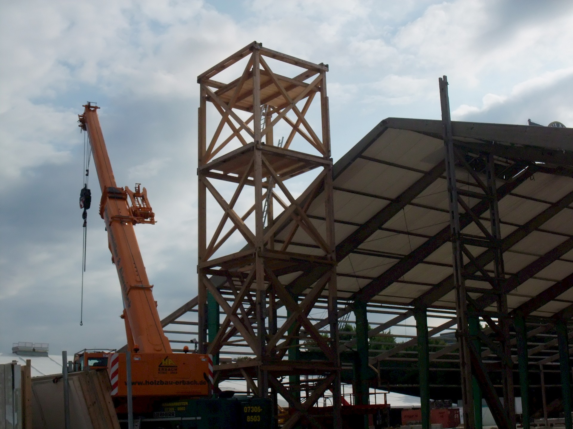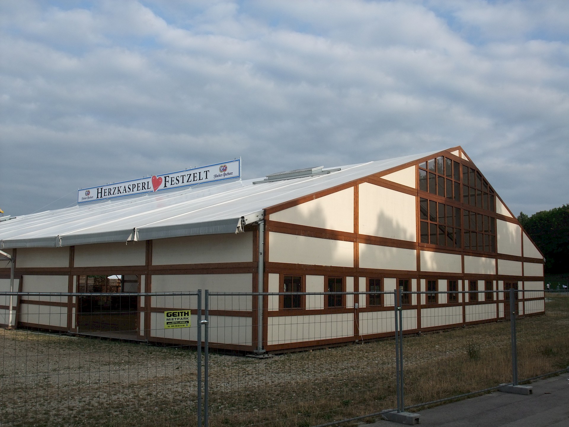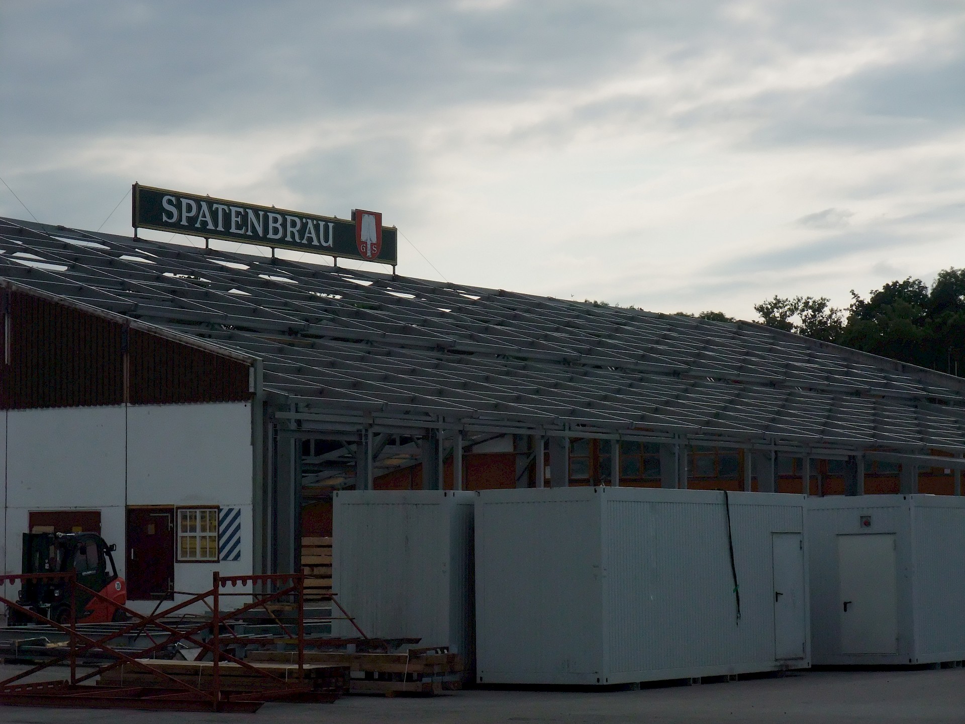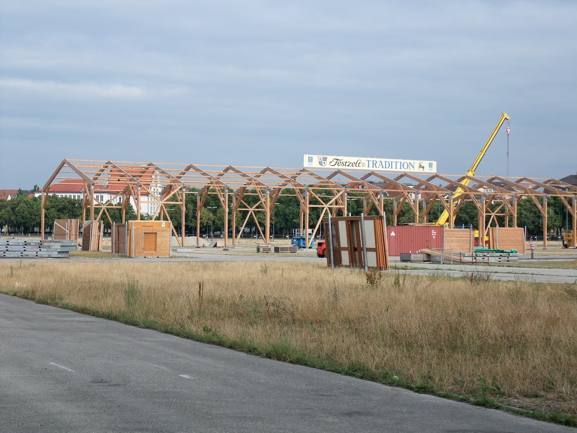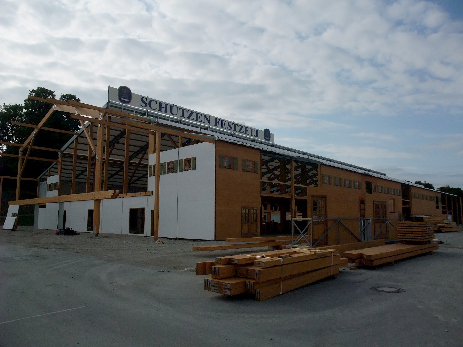 In der zweiten Aufbauwoche nimmt das neue Schützenzelt Form an und wirkt recht wuchtig. Ab heuer gehört es schließlich auch zu den ganz Großen.