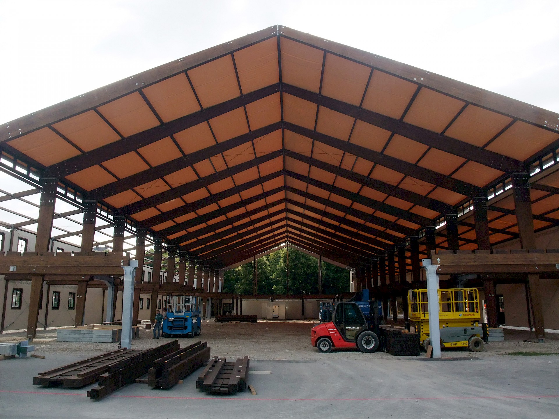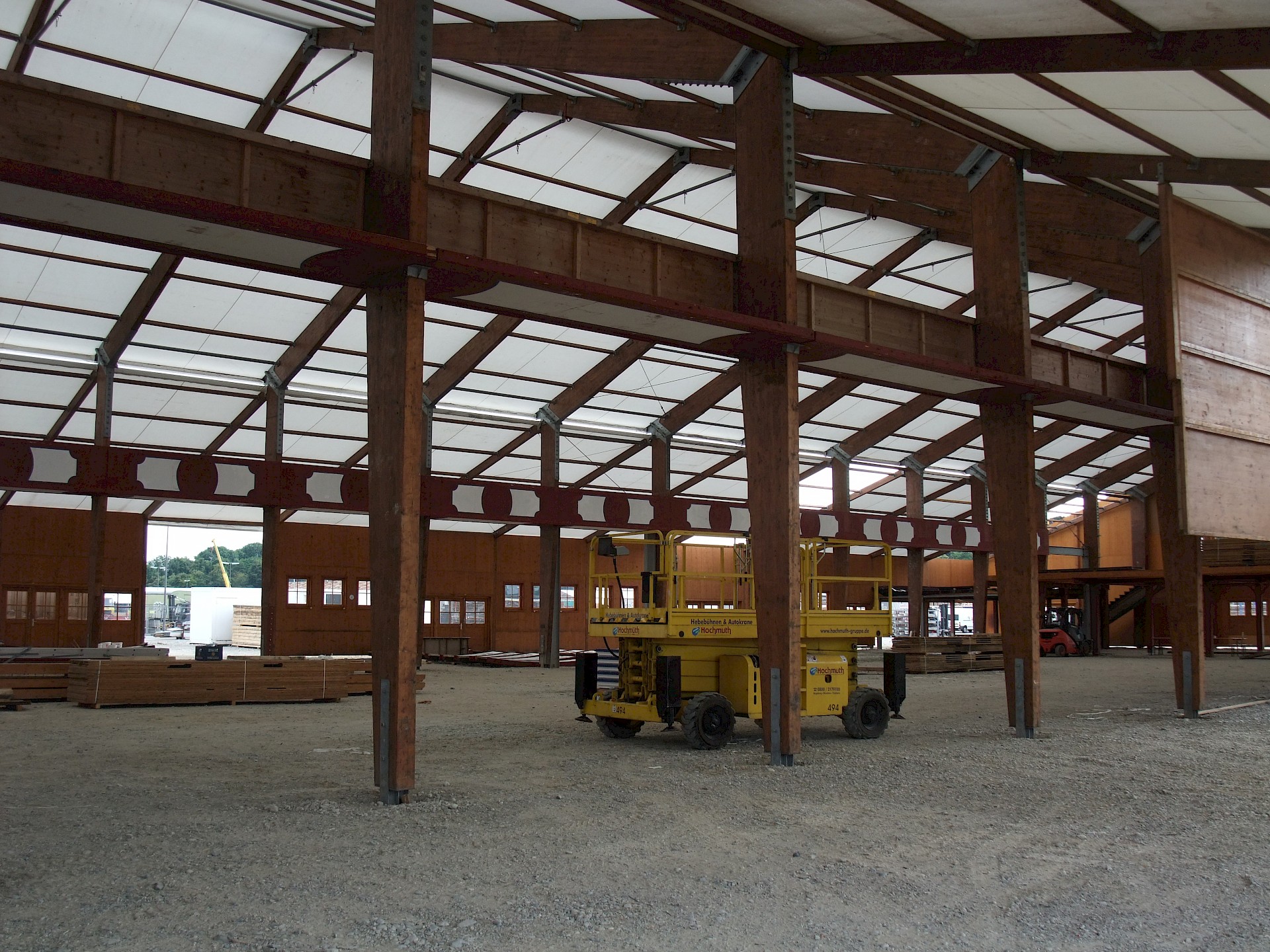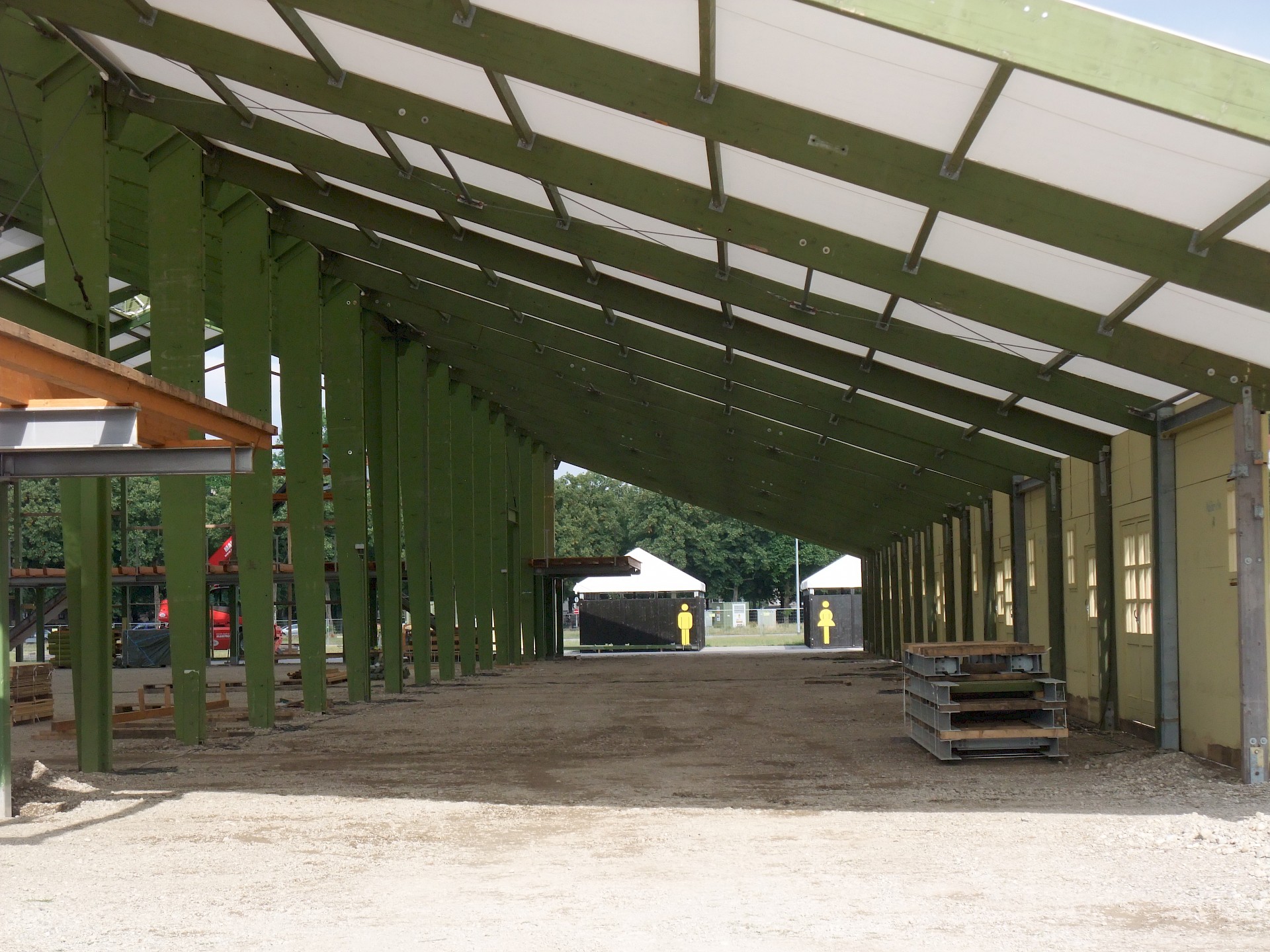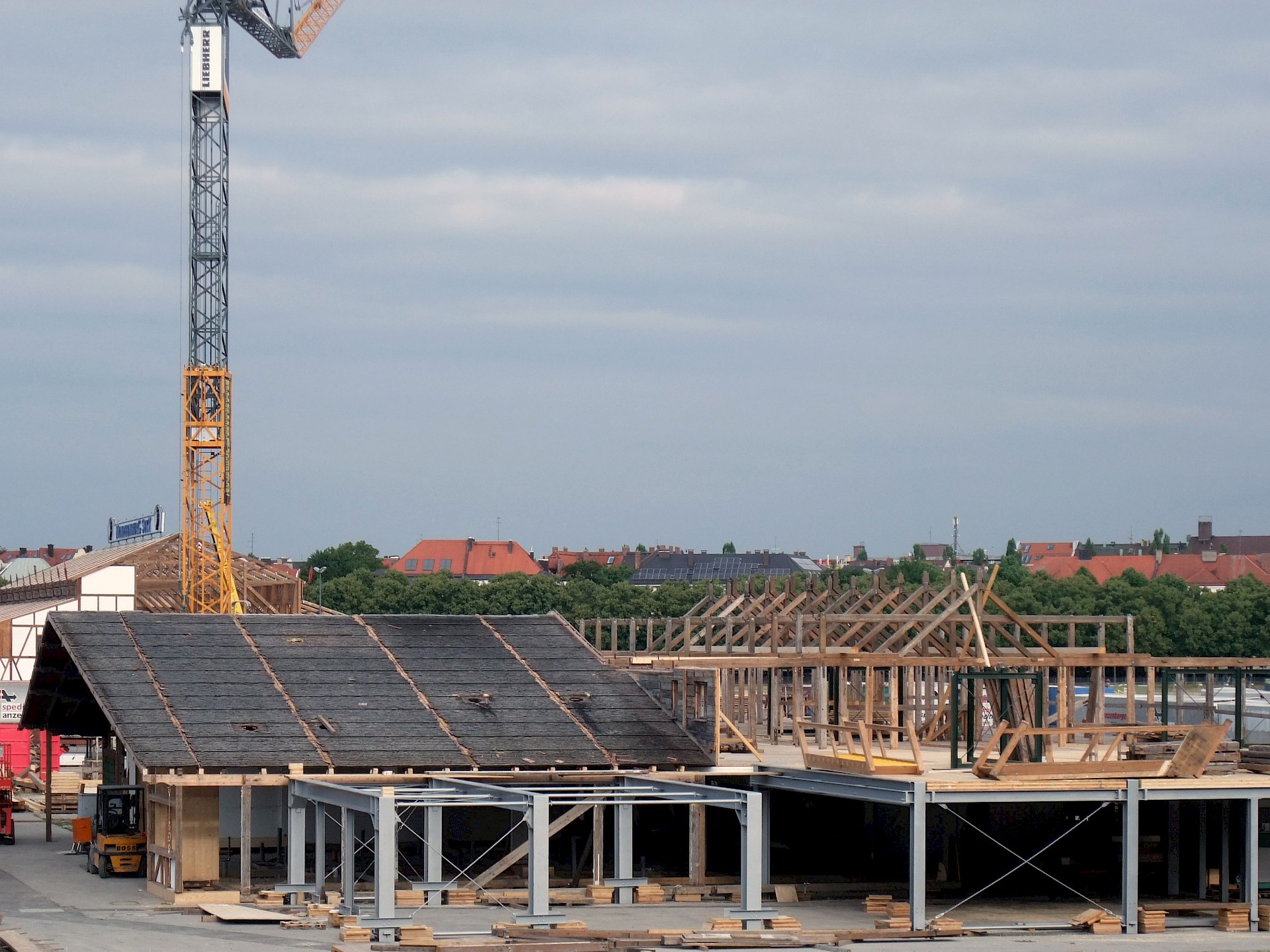 In der zweiten Aufbauwoche nimmt das neue Schützenzelt Form an und wirkt recht wuchtig. Ab heuer gehört es schließlich auch zu den ganz Großen.