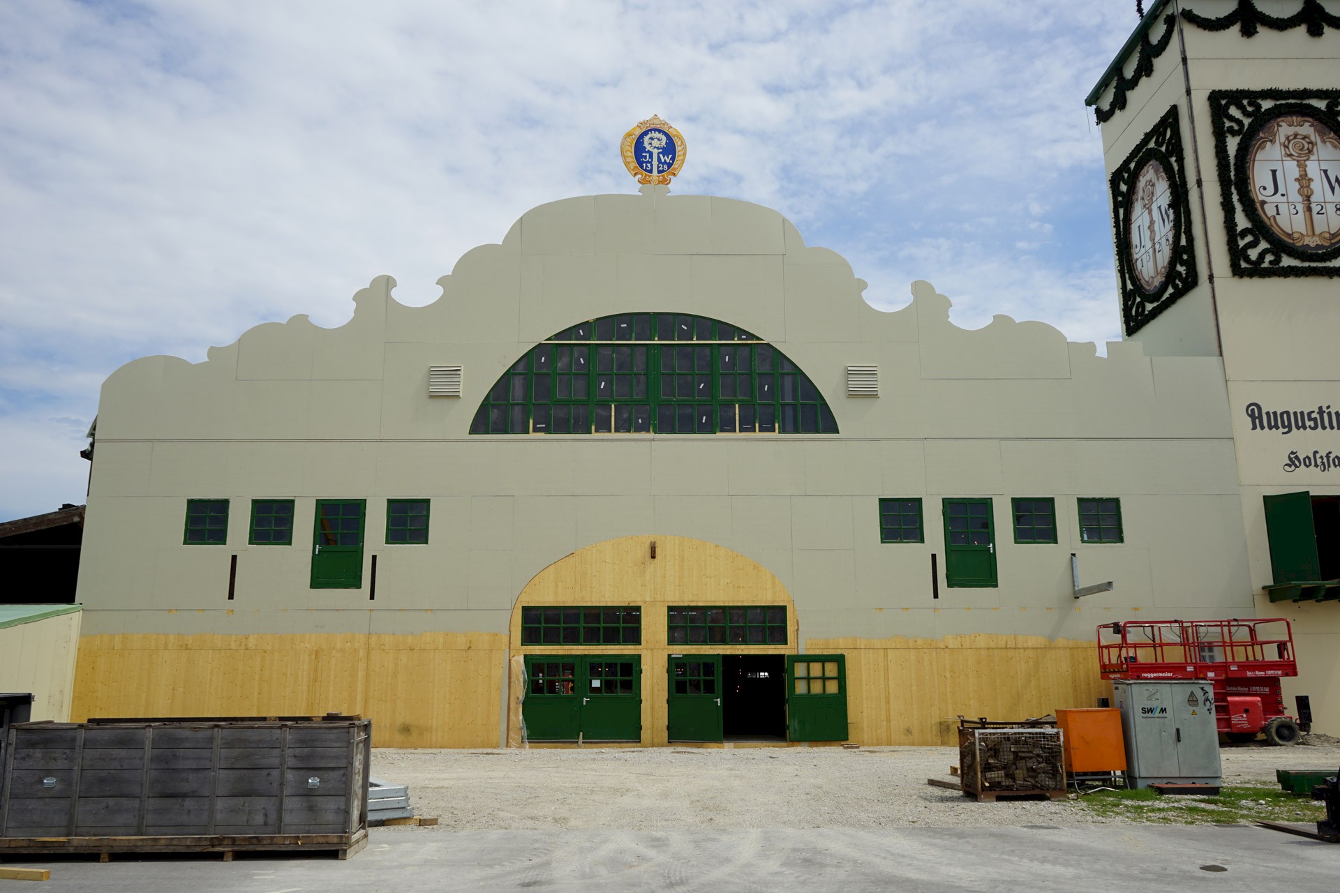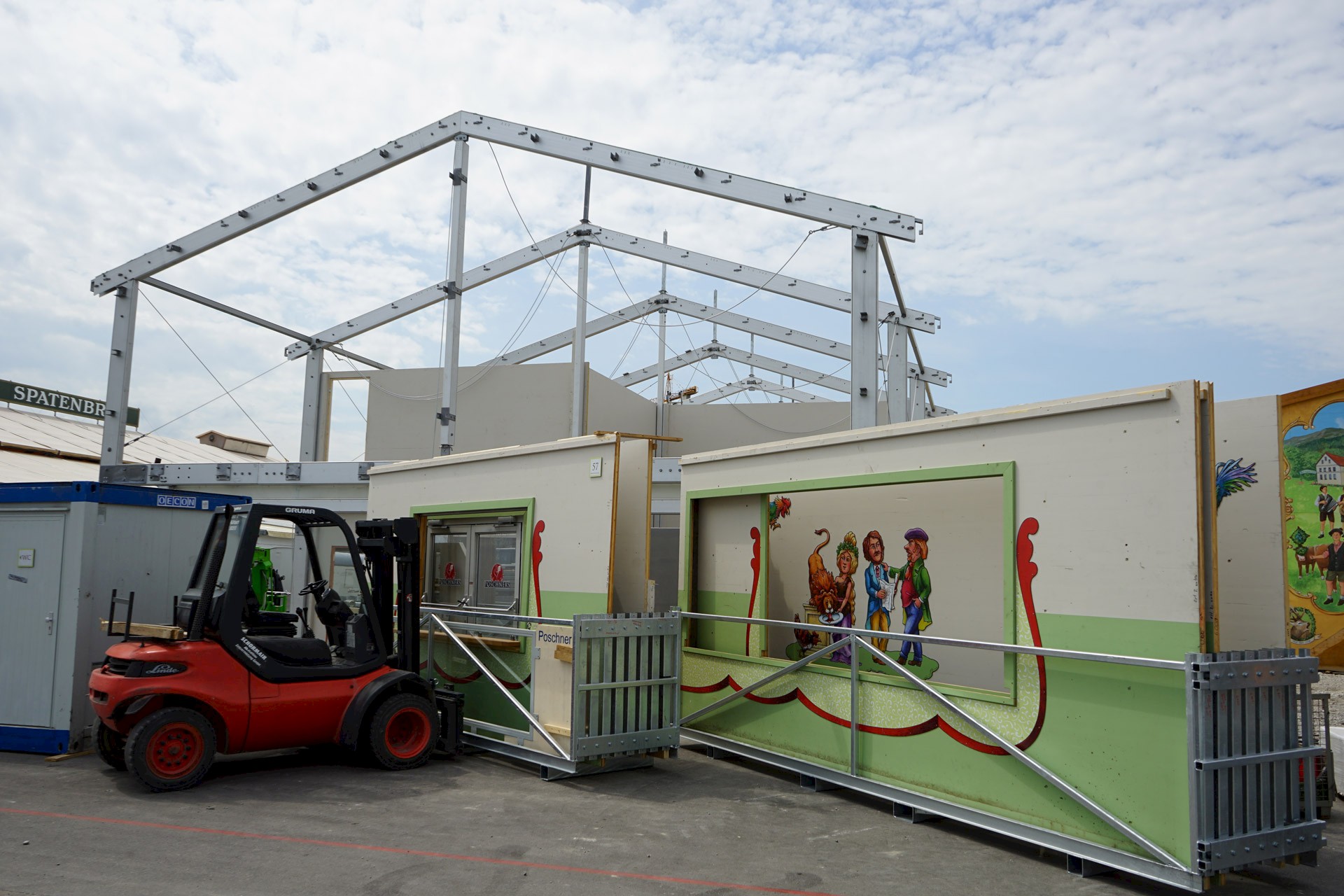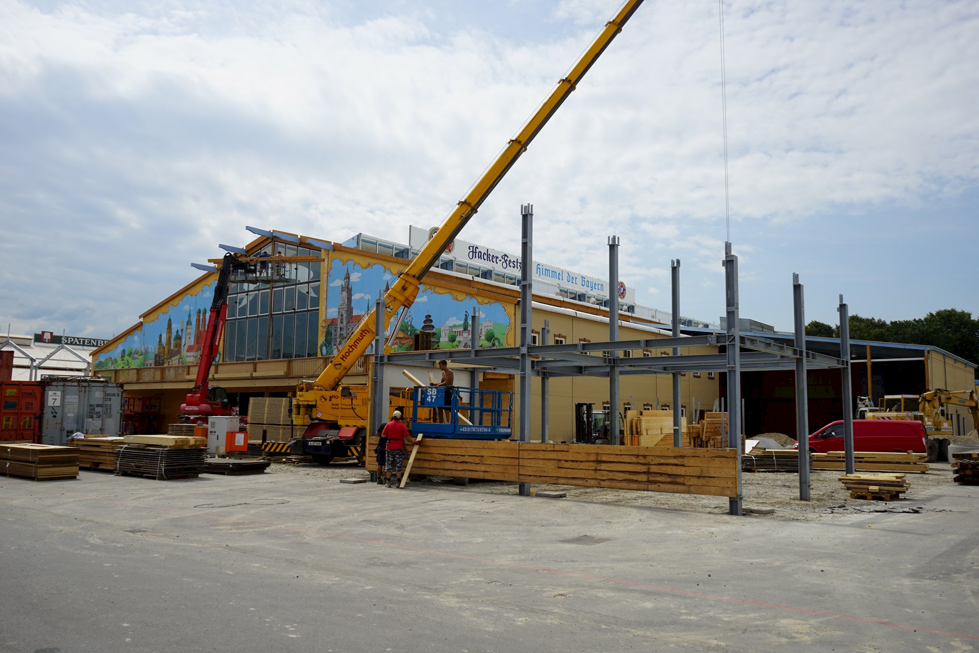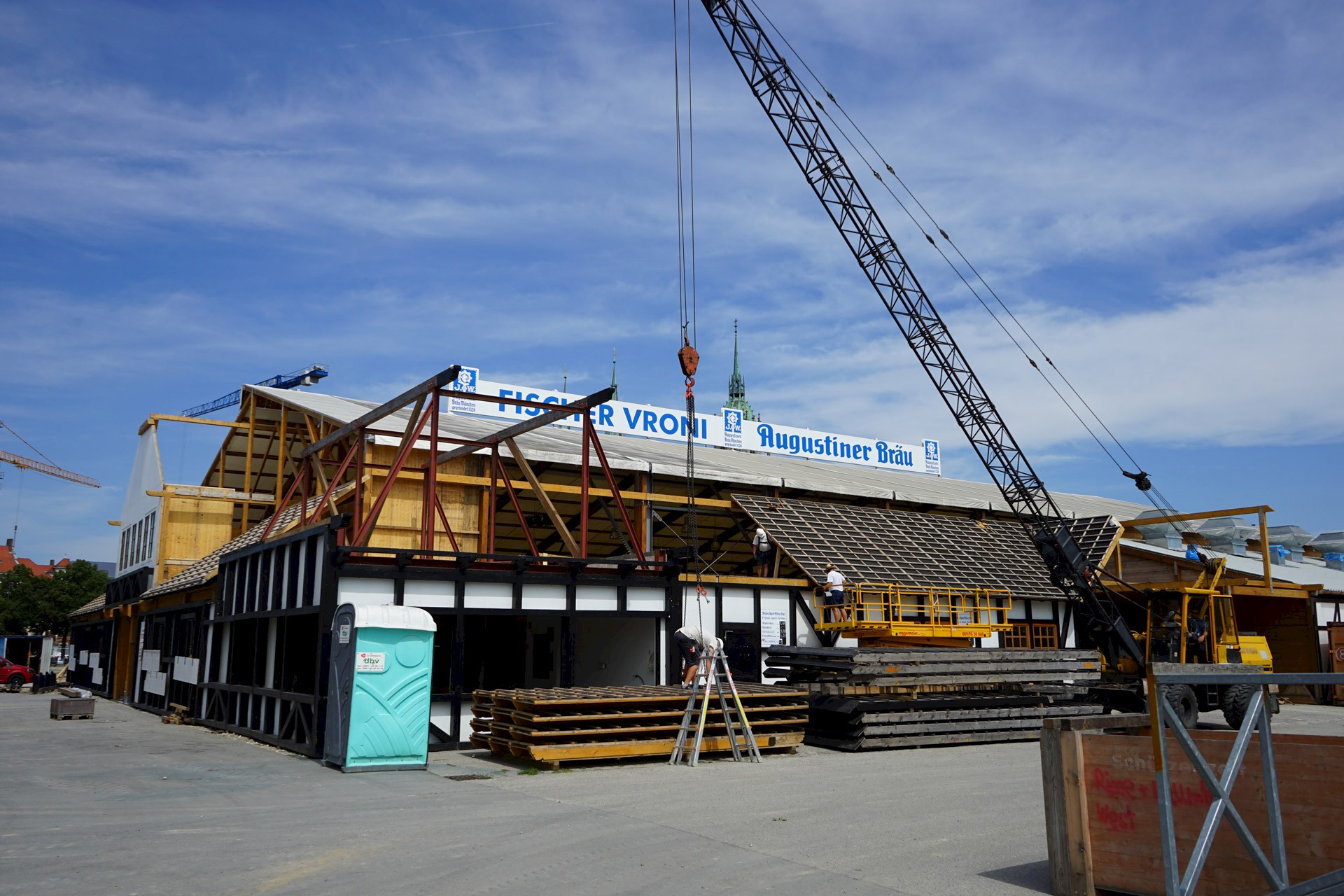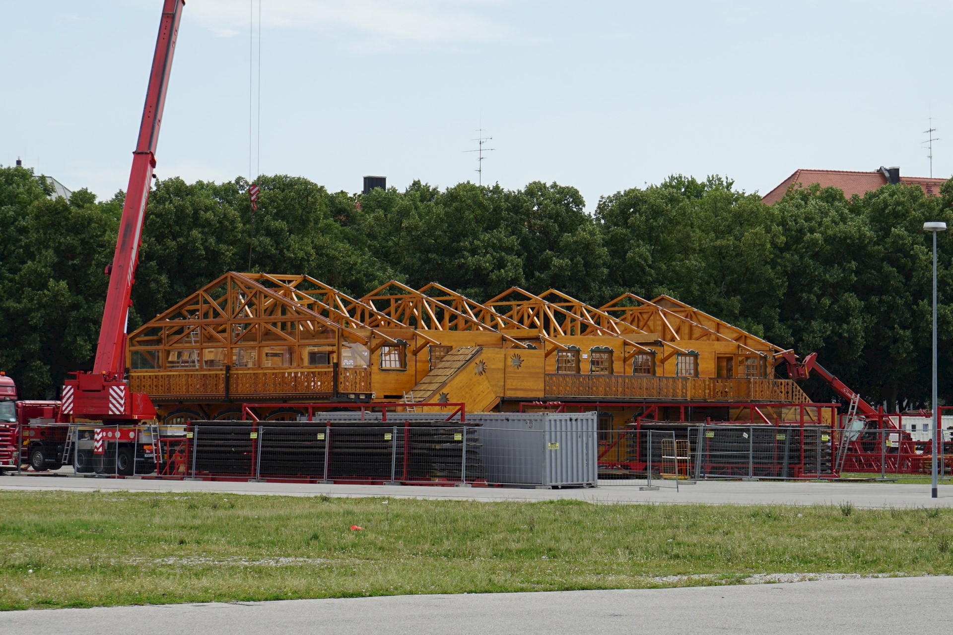Seit Montag dürfen auch die kleinen Wiesnzelte mit dem Aufbau beginnen. Von den Hendlbratereien Ammer, Poschner und Goldener Hahn ist dies auch bereits genutzt worden. Die wenig traditionellen Container der Wildstuben sind bereits am zweiten Aufbautag zum größten Teil zusammengesteckt worden. Der Neubau der Ochsenbraterei (zur Webcam) lässt schön langsam erahnen, wie die Fassade ausschauen wird. Immerhin der geschwungene Schriftzug scheint wiederzukehren.