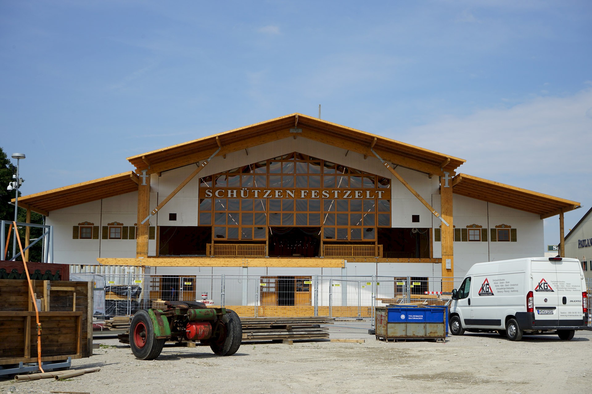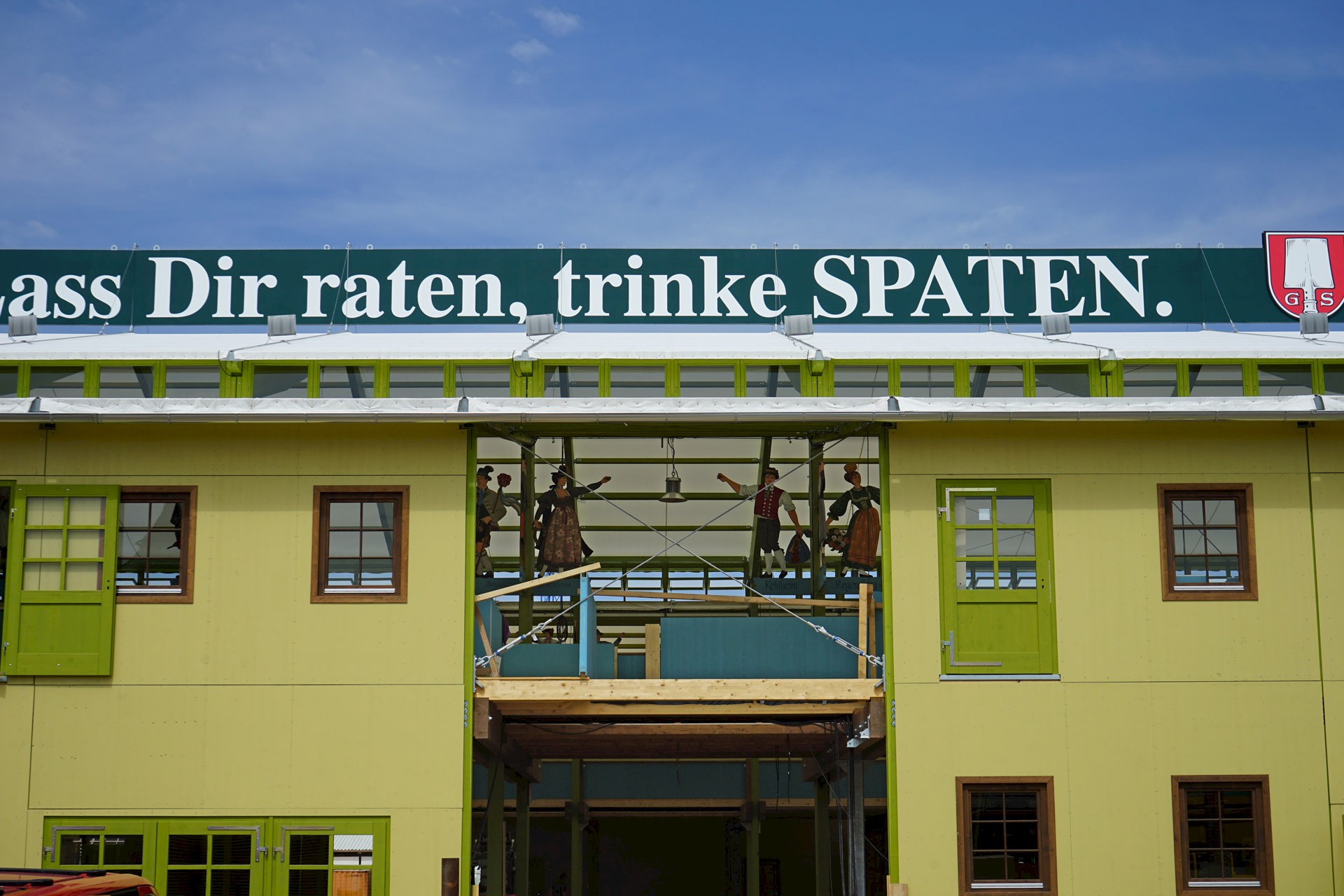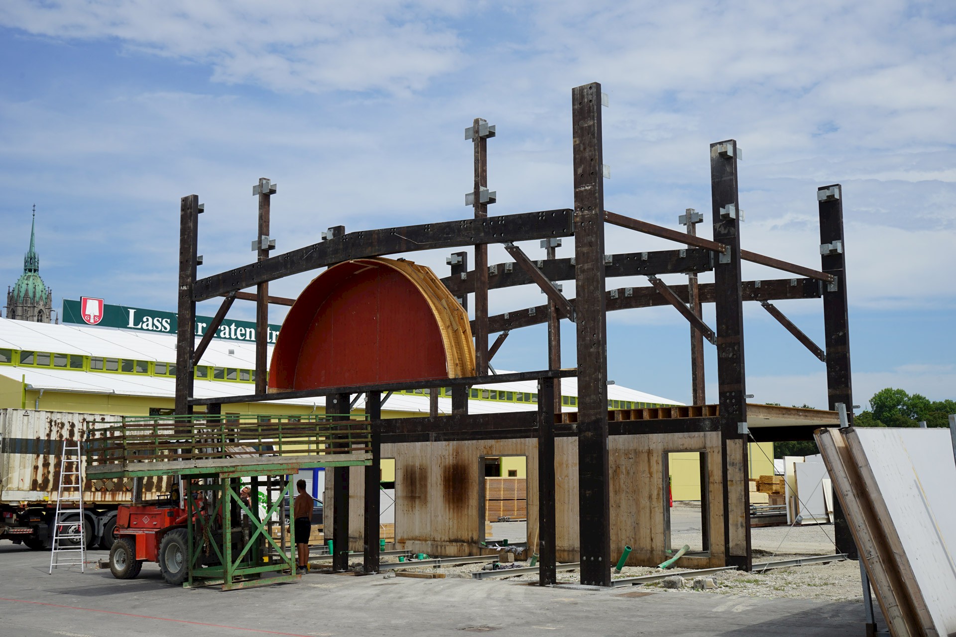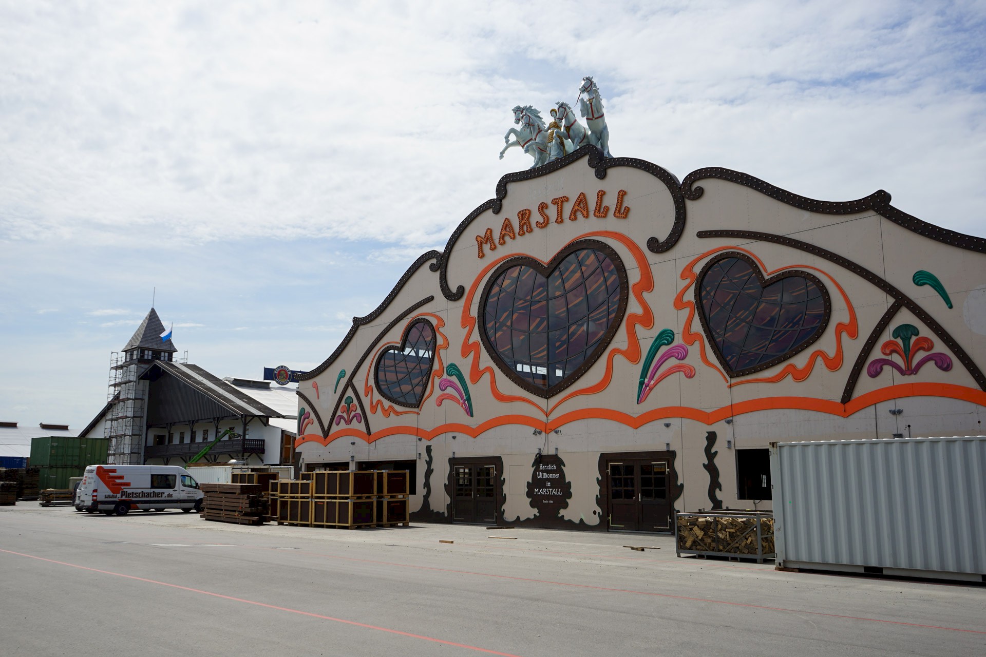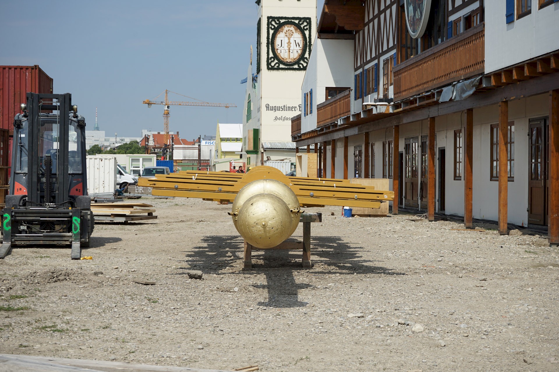 Seit Montag dürfen auch die kleinen Wiesnzelte mit dem Aufbau beginnen. Von den Hendlbratereien Ammer, Poschner und Goldener Hahn ist dies auch bereits genutzt worden. Die wenig traditionellen Container der Wildstuben sind bereits am zweiten Aufbautag zum größten Teil zusammengesteckt worden. Der Neubau der Ochsenbraterei (zur Webcam) lässt schön langsam erahnen, wie die Fassade ausschauen wird. Immerhin der geschwungene Schriftzug scheint wiederzukehren.