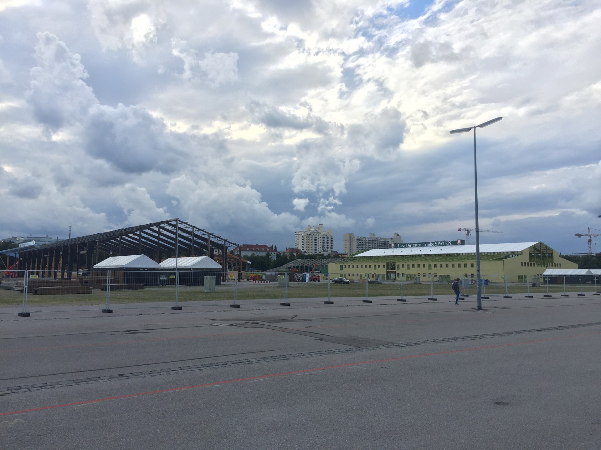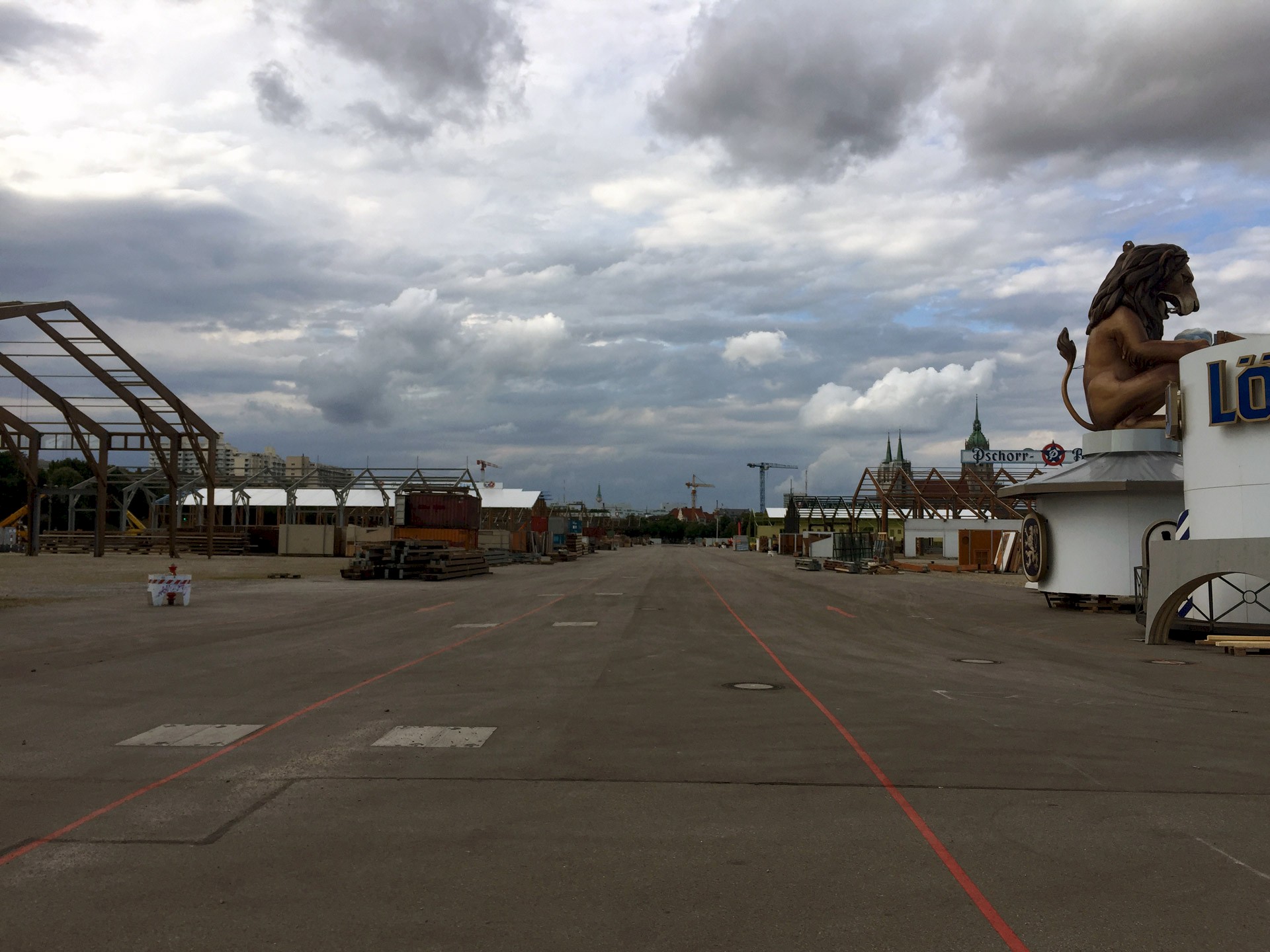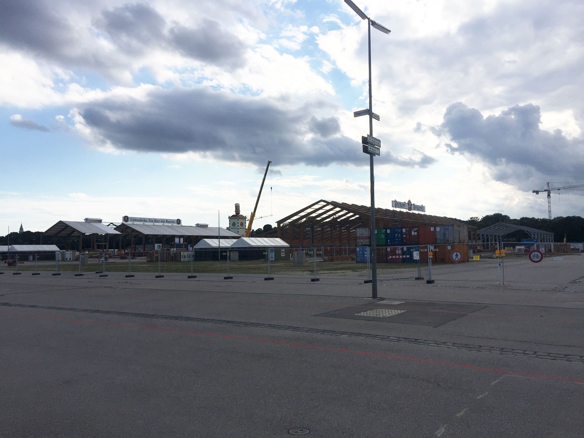 Zum Ende der ersten offiziellen Woche des Oktoberfest-Aufbaus 2017 wird beim Neubau der Ochsenbraterei sowie beim Schützenzelt und dem Löwenbräuzelt bereits am Dach gearbeitet, während bei anderen Zelten das Mittelschiff noch nicht einmal steht.