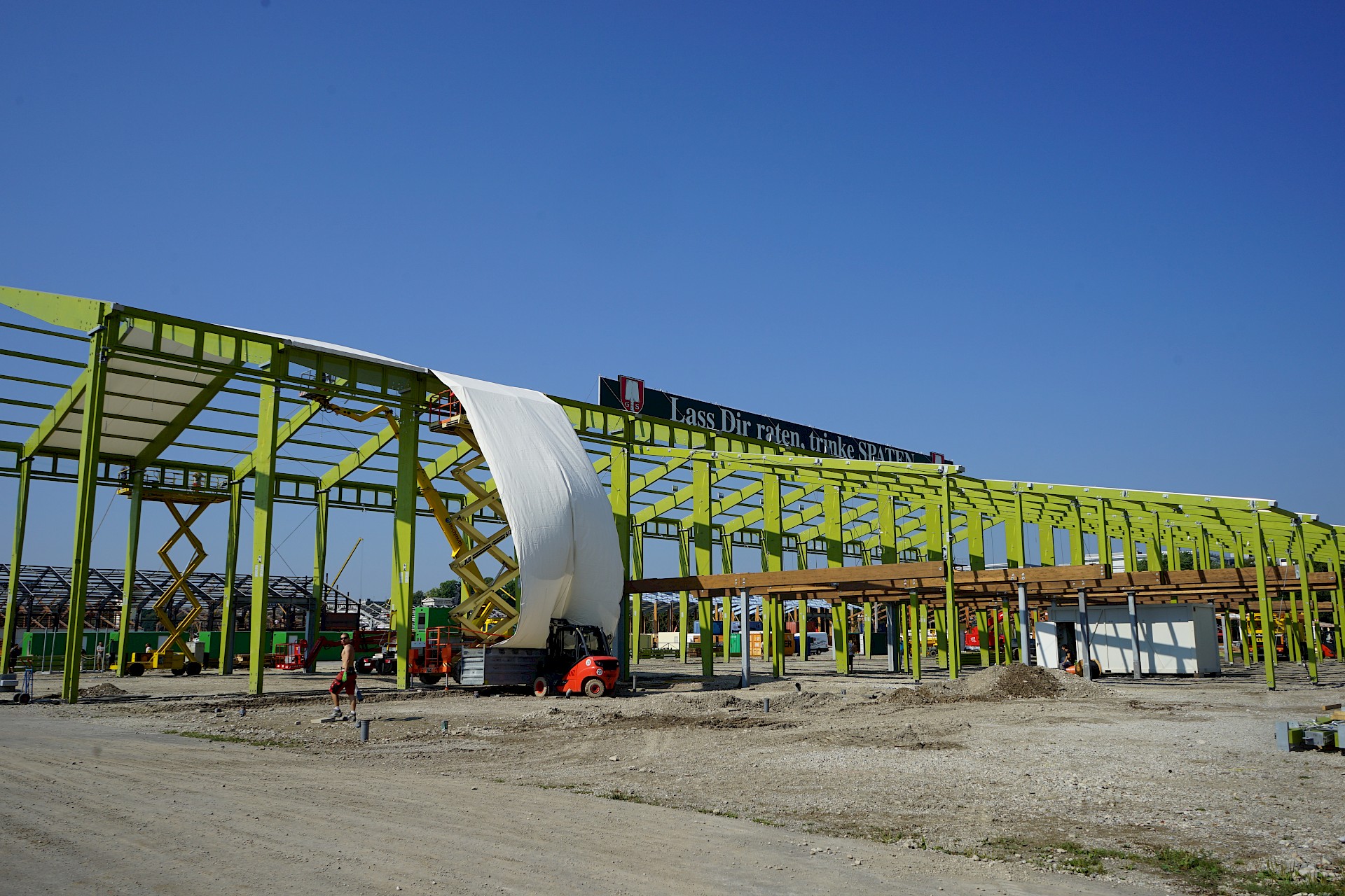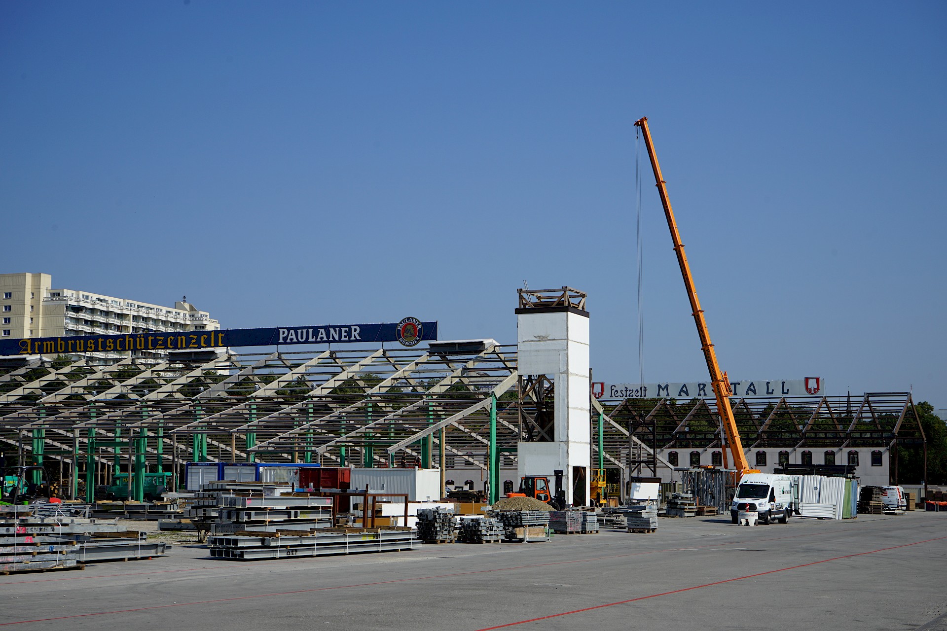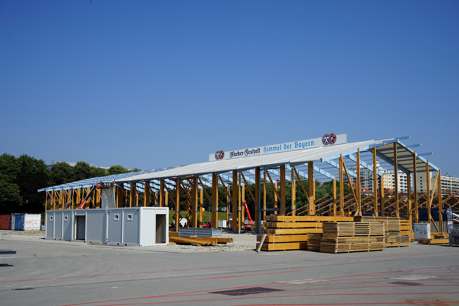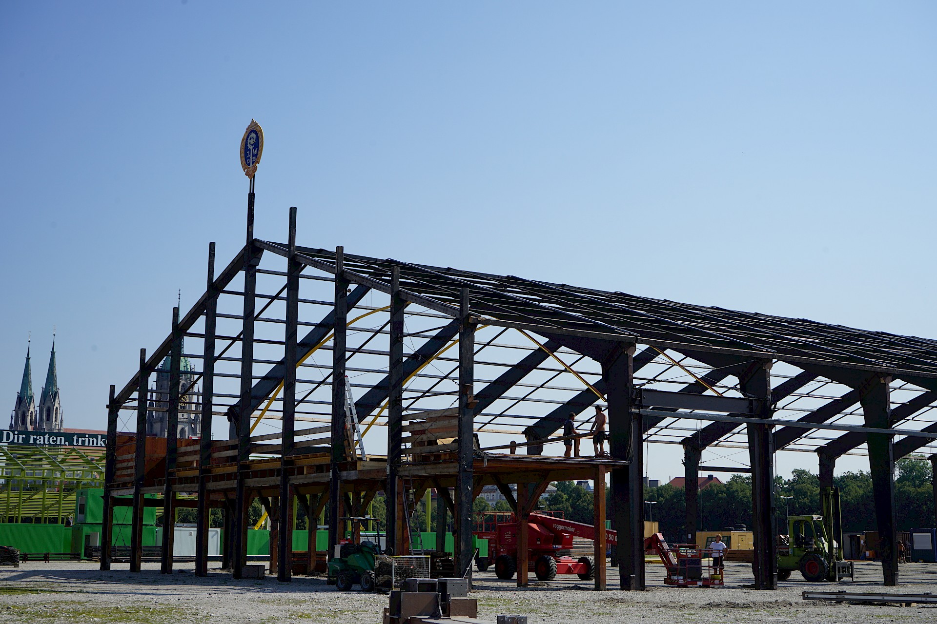 In der offiziell zweiten Aufbauwoche des Oktoberfestes 2018 zeigt sich das gewohnt Bild. Während einige Zelte erst ihr Mittelschiff präsentieren, sind andere bereits teilweise mit Außenwänden oder gar Zeltplanen versehen.