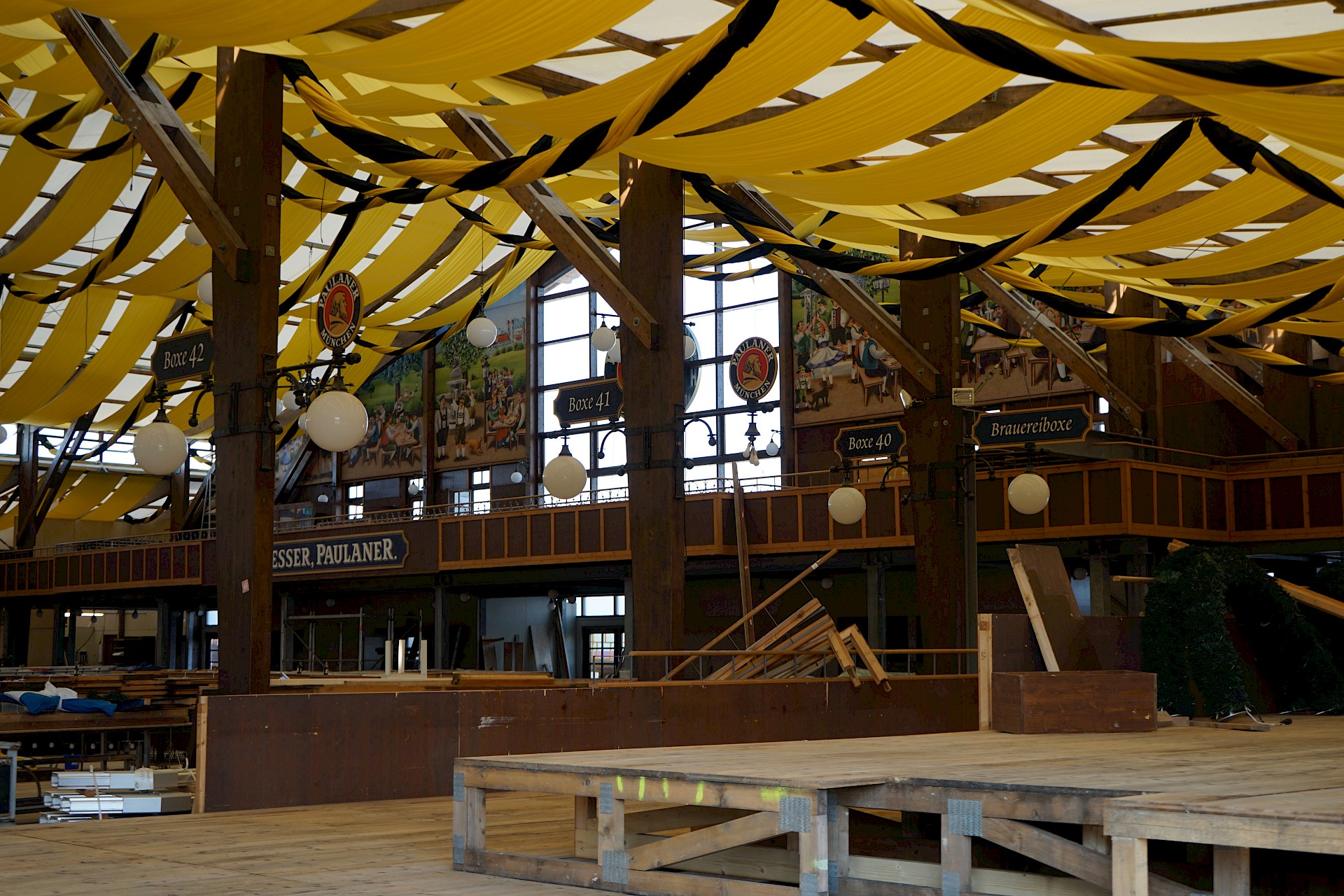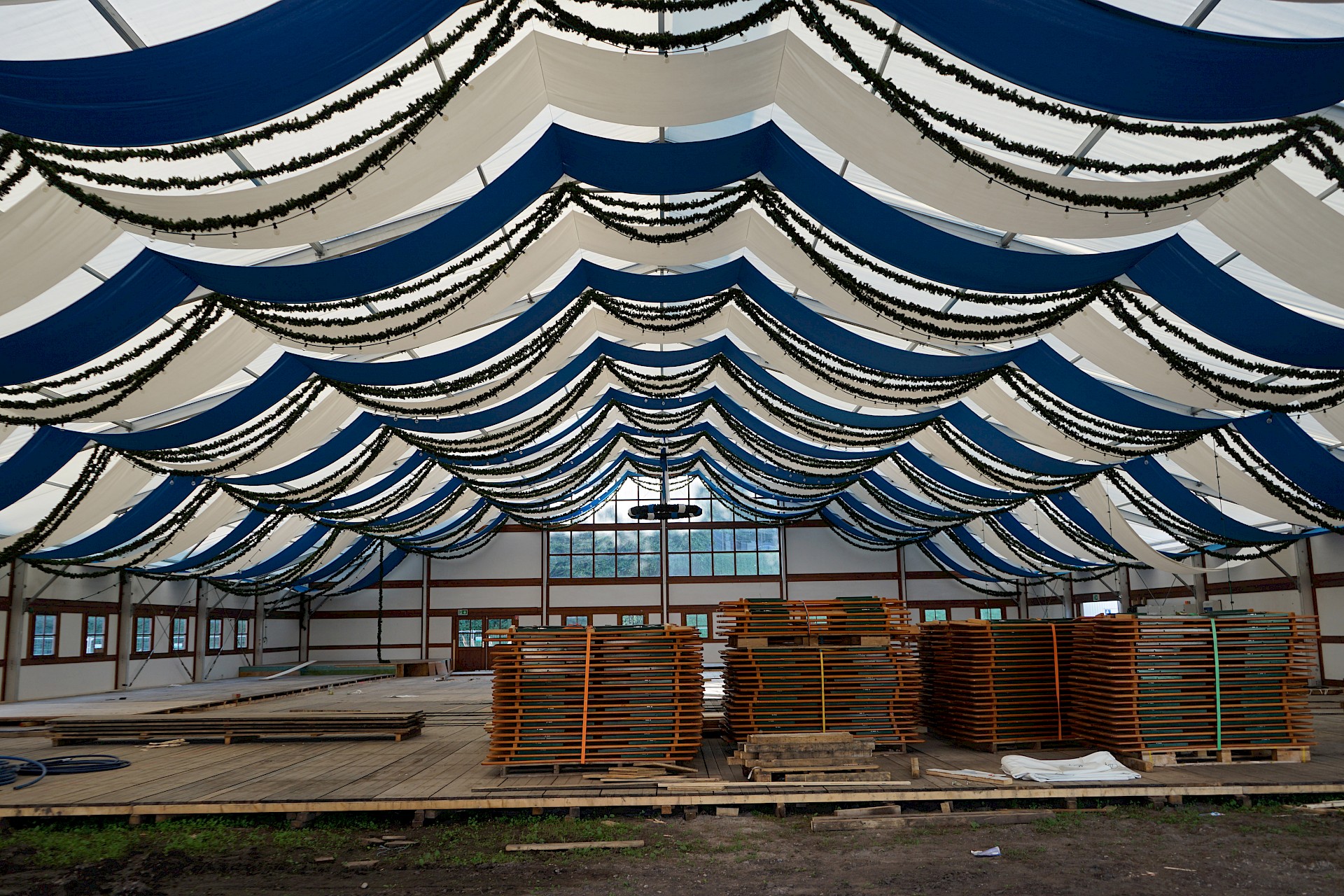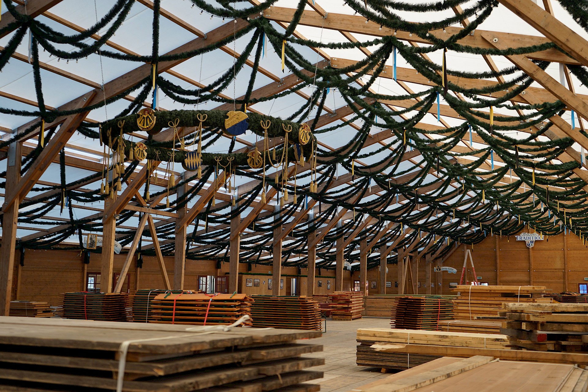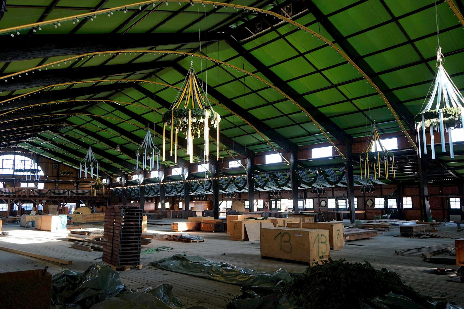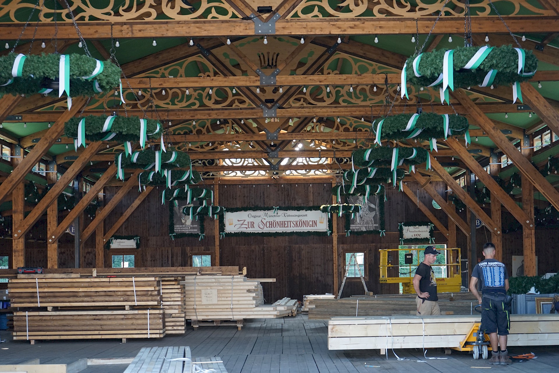 Auf der Oidn Wiesn sind alle vier Zelte im Aufbau, wobei noch nicht einmal die Böden vollständig sind. Im Traditionszelt sieht man immerhin schon ansehnliche neue Kränze.
