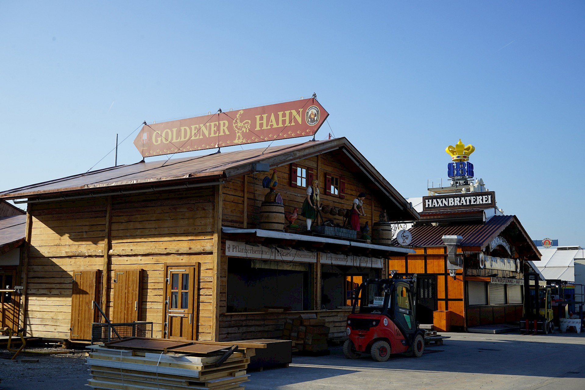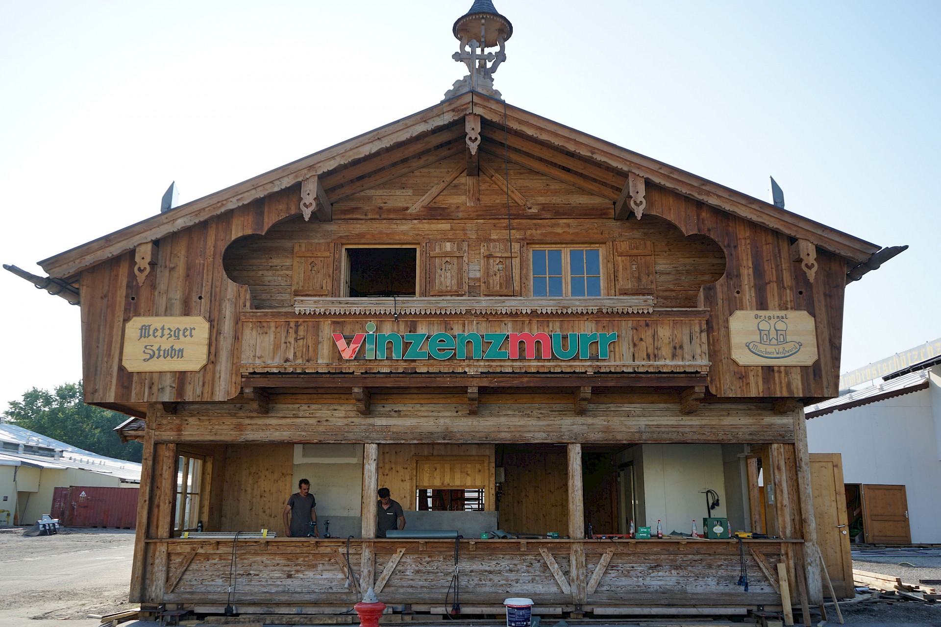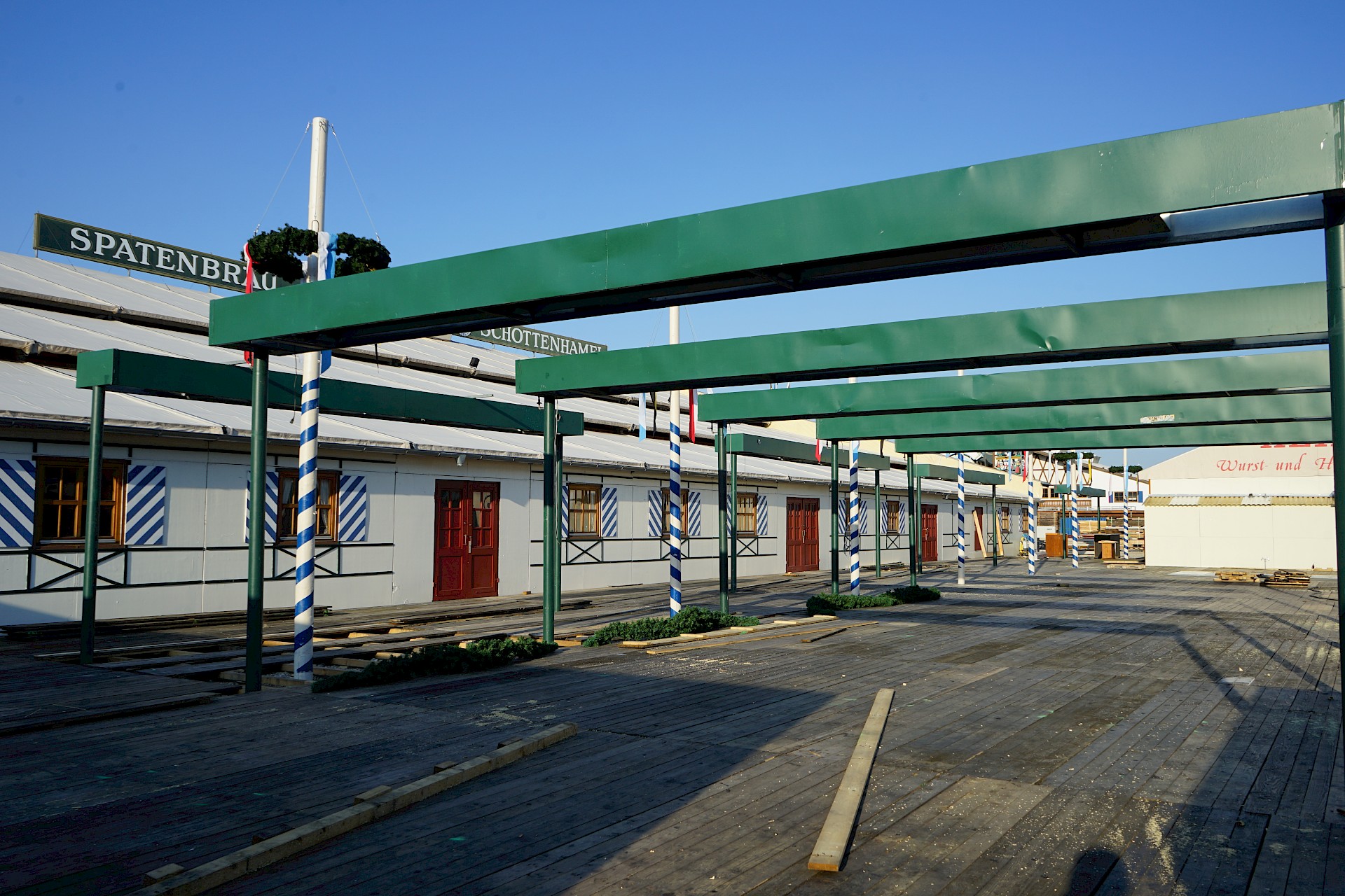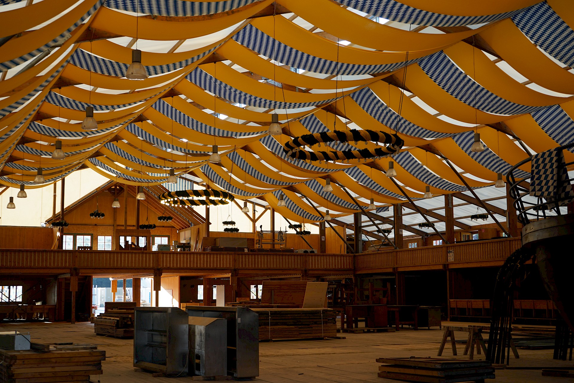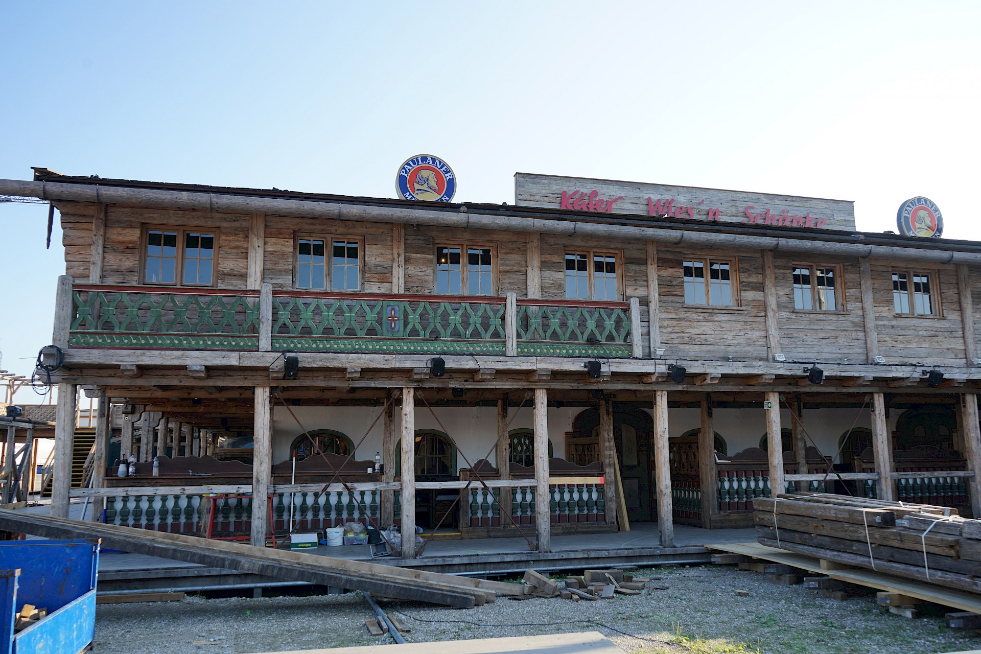 Auf der Oidn Wiesn sind alle vier Zelte im Aufbau, wobei noch nicht einmal die Böden vollständig sind. Im Traditionszelt sieht man immerhin schon ansehnliche neue Kränze.