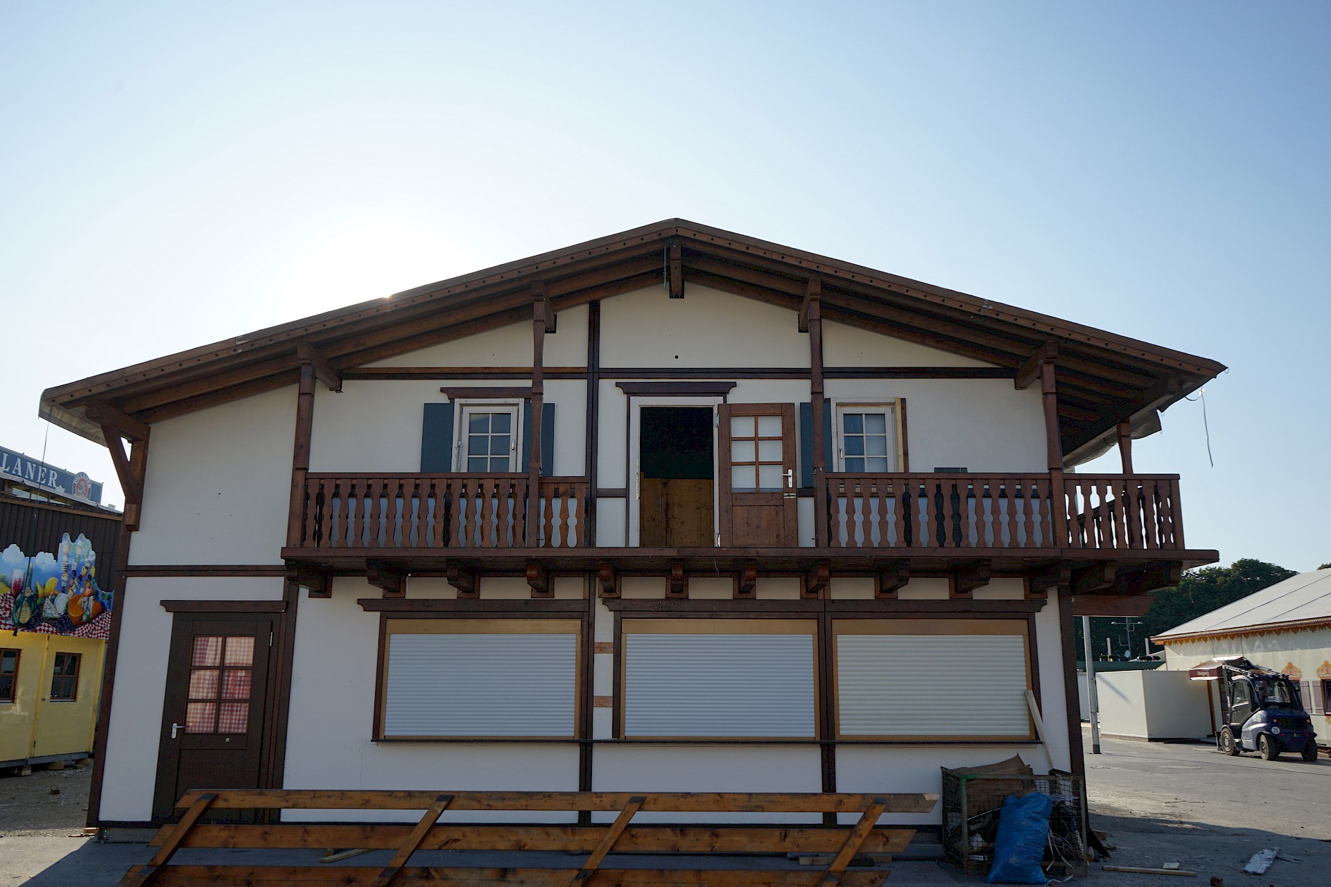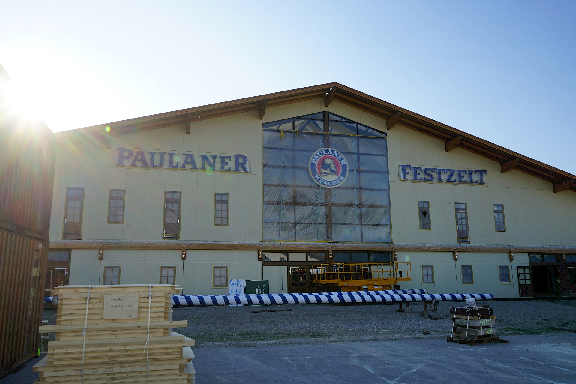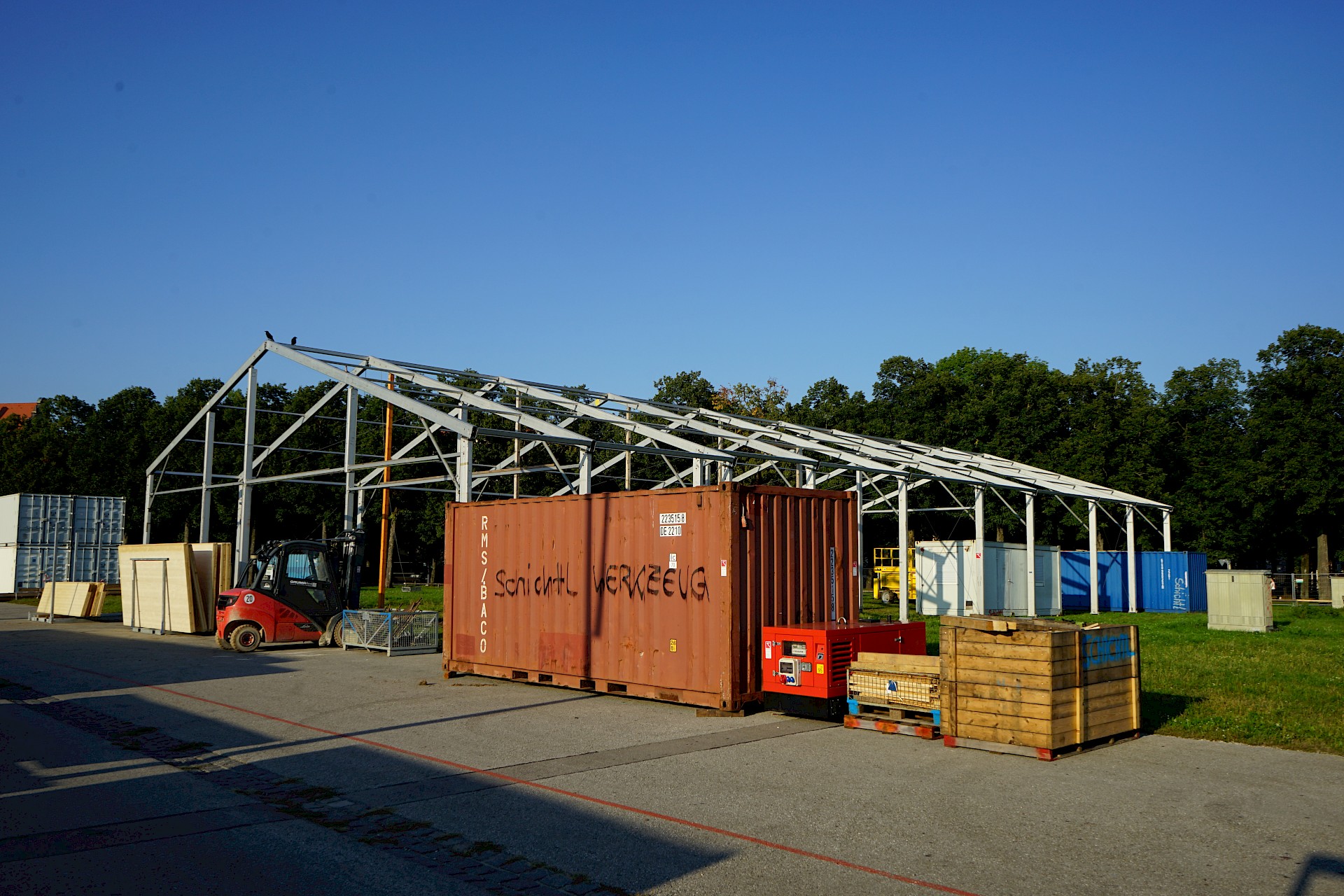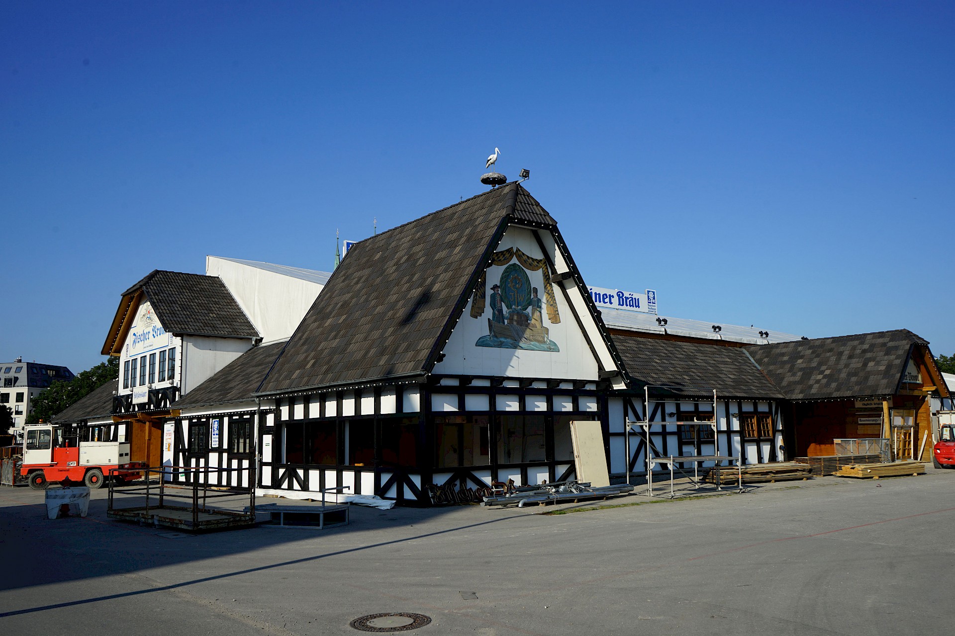 Auf der Oidn Wiesn sind alle vier Zelte im Aufbau, wobei noch nicht einmal die Böden vollständig sind. Im Traditionszelt sieht man immerhin schon ansehnliche neue Kränze.