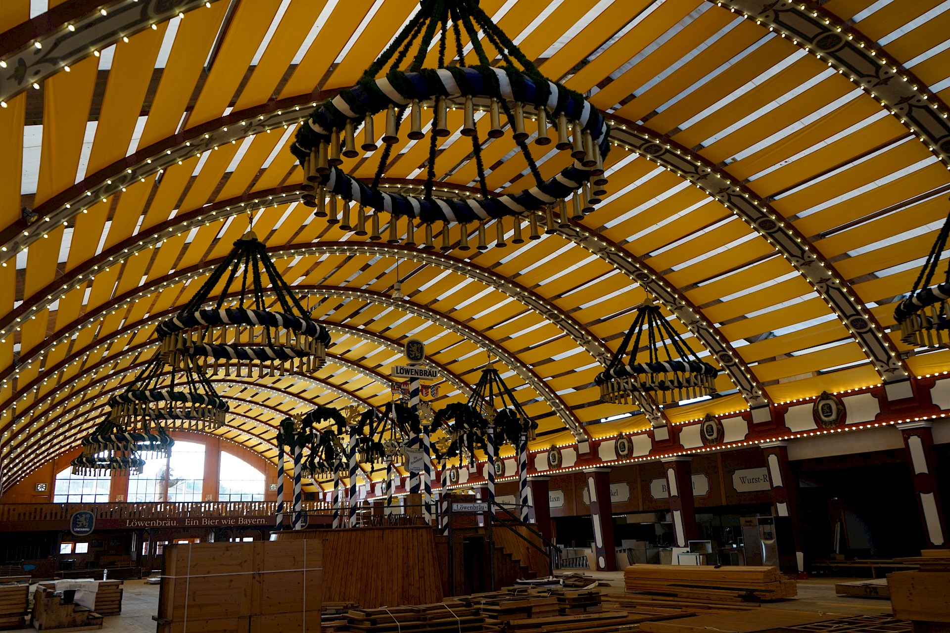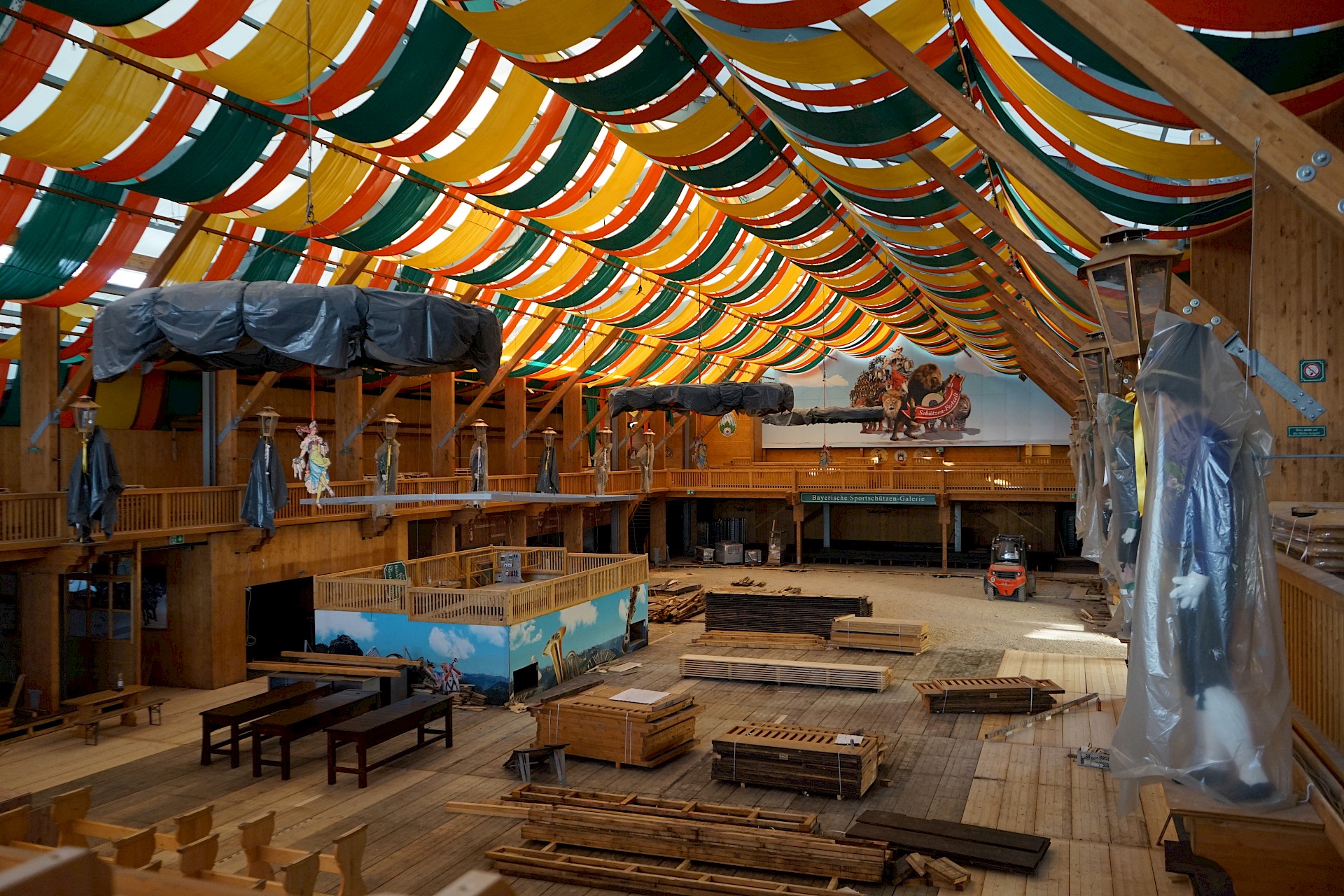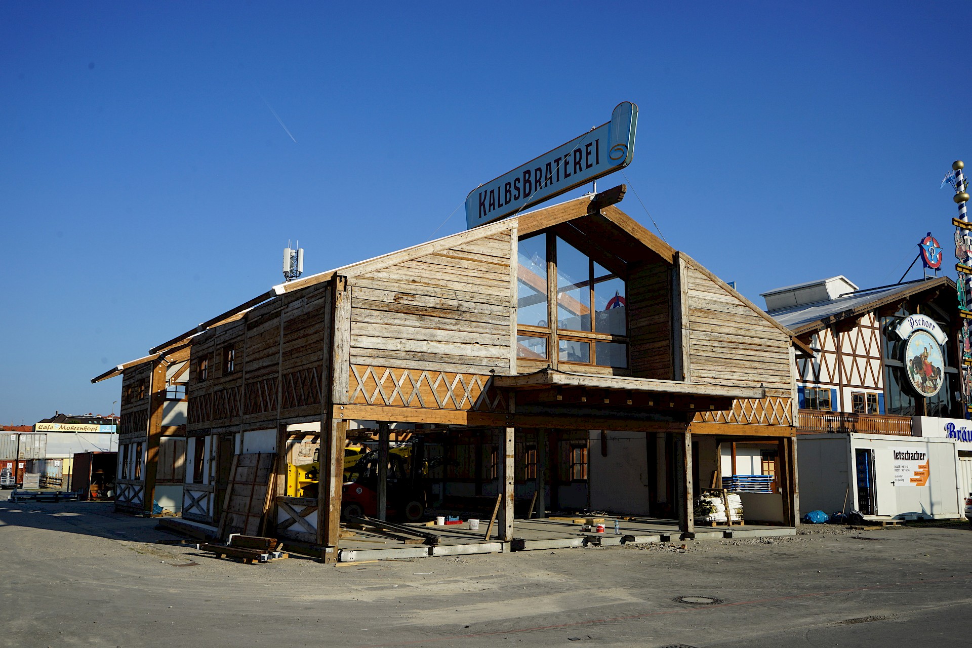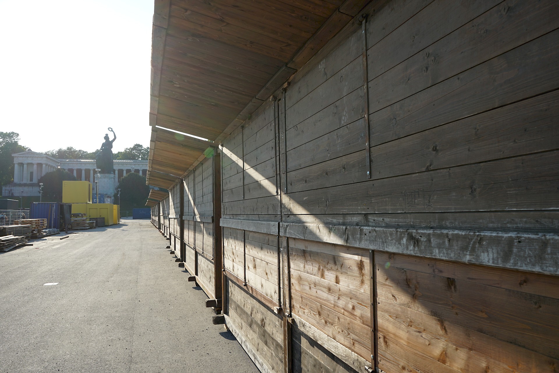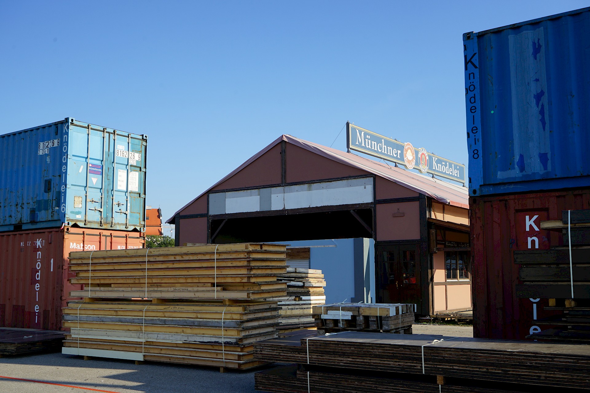 Auf der Oidn Wiesn sind alle vier Zelte im Aufbau, wobei noch nicht einmal die Böden vollständig sind. Im Traditionszelt sieht man immerhin schon ansehnliche neue Kränze.
