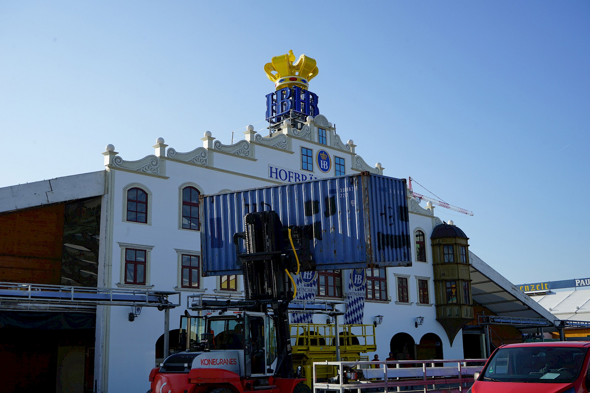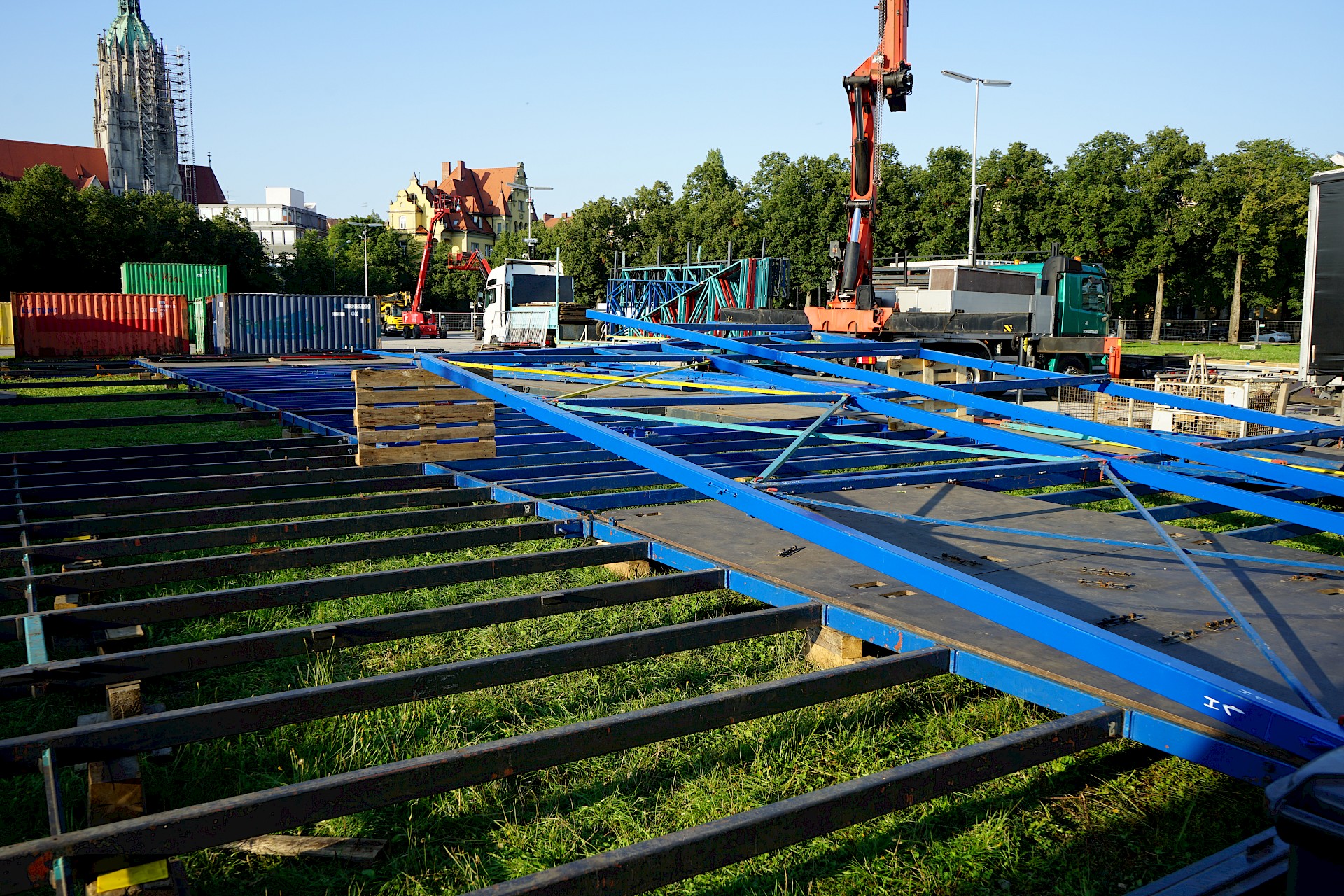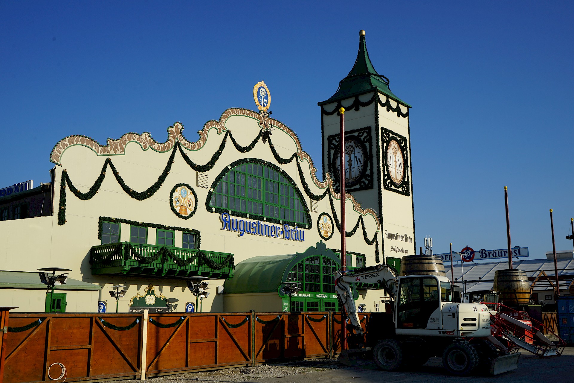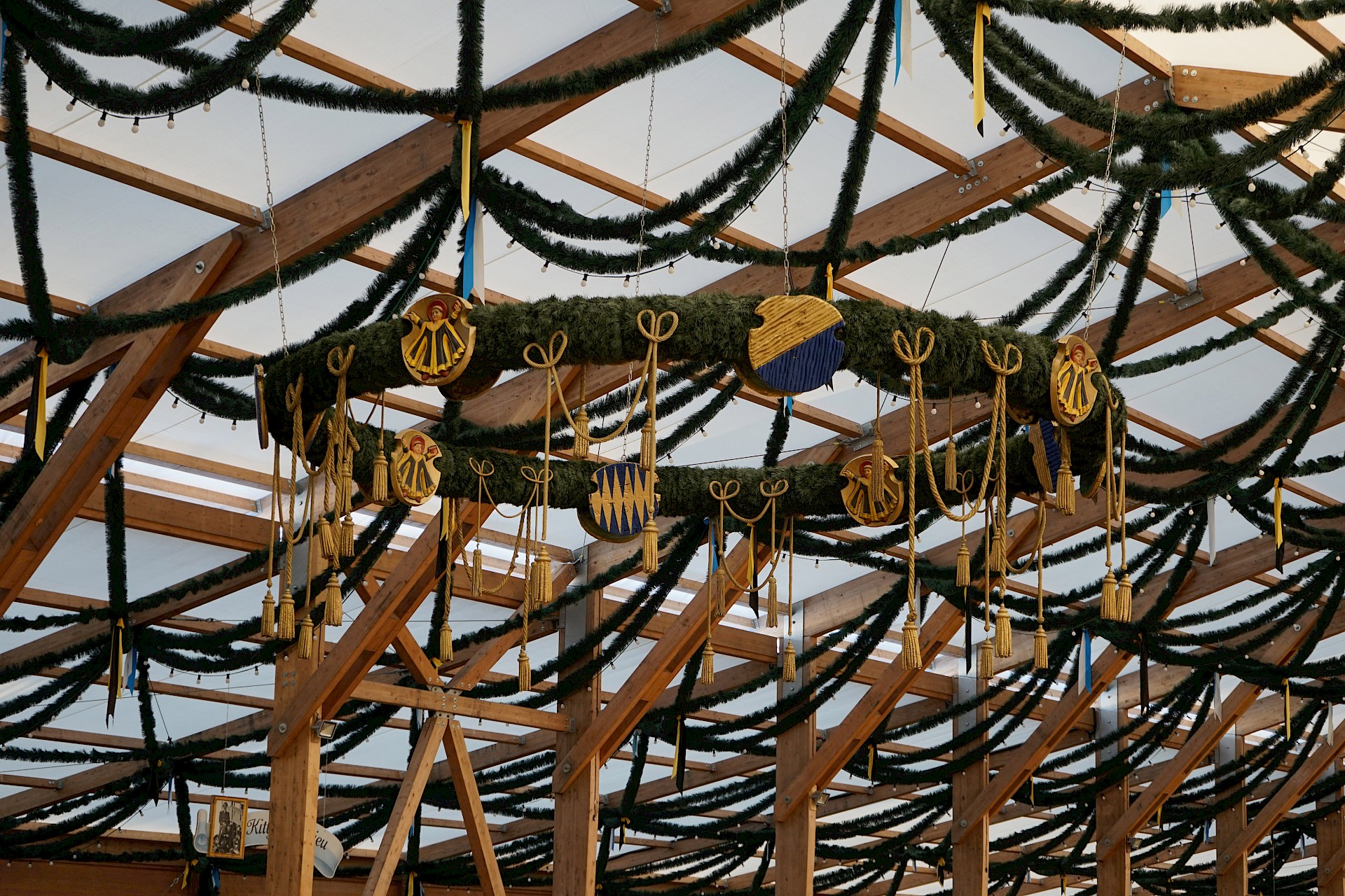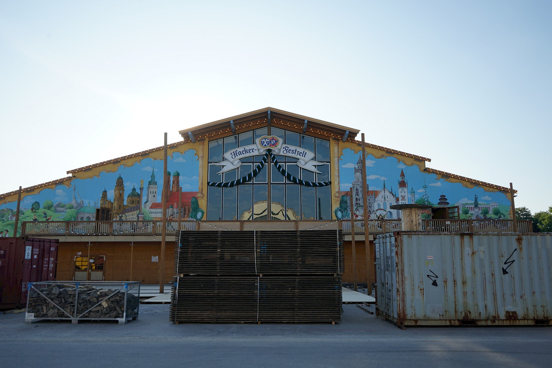 Auf der Oidn Wiesn sind alle vier Zelte im Aufbau, wobei noch nicht einmal die Böden vollständig sind. Im Traditionszelt sieht man immerhin schon ansehnliche neue Kränze.