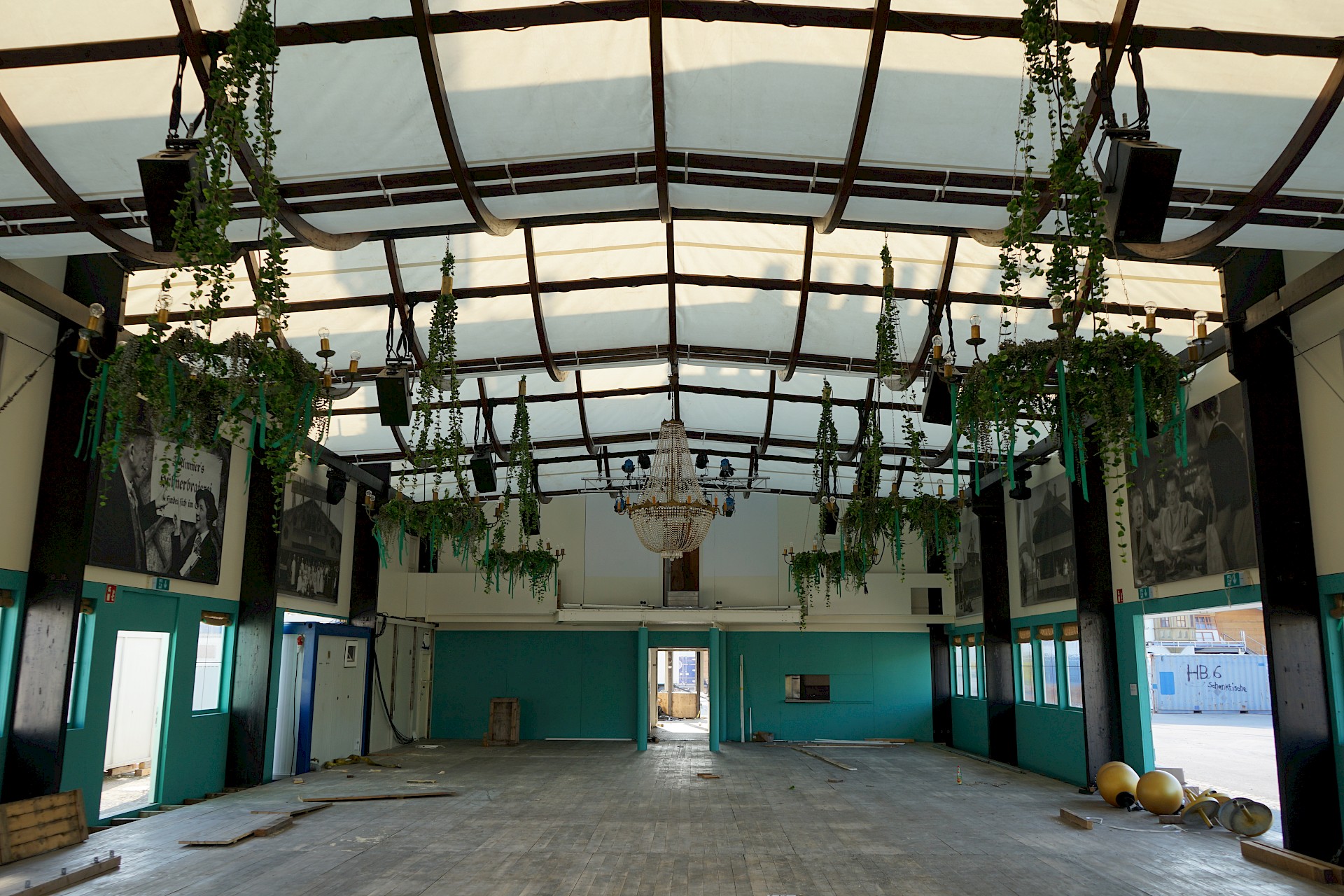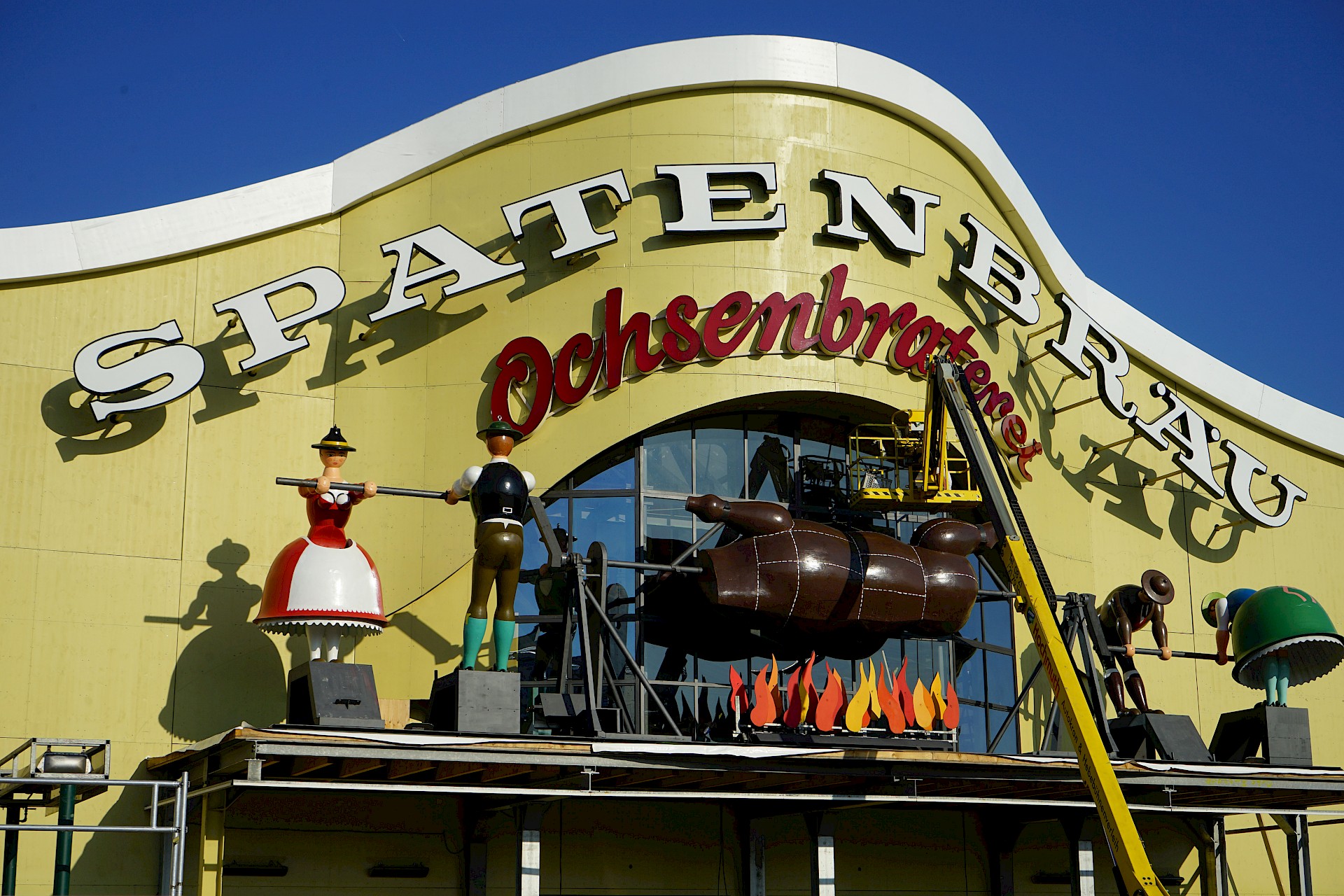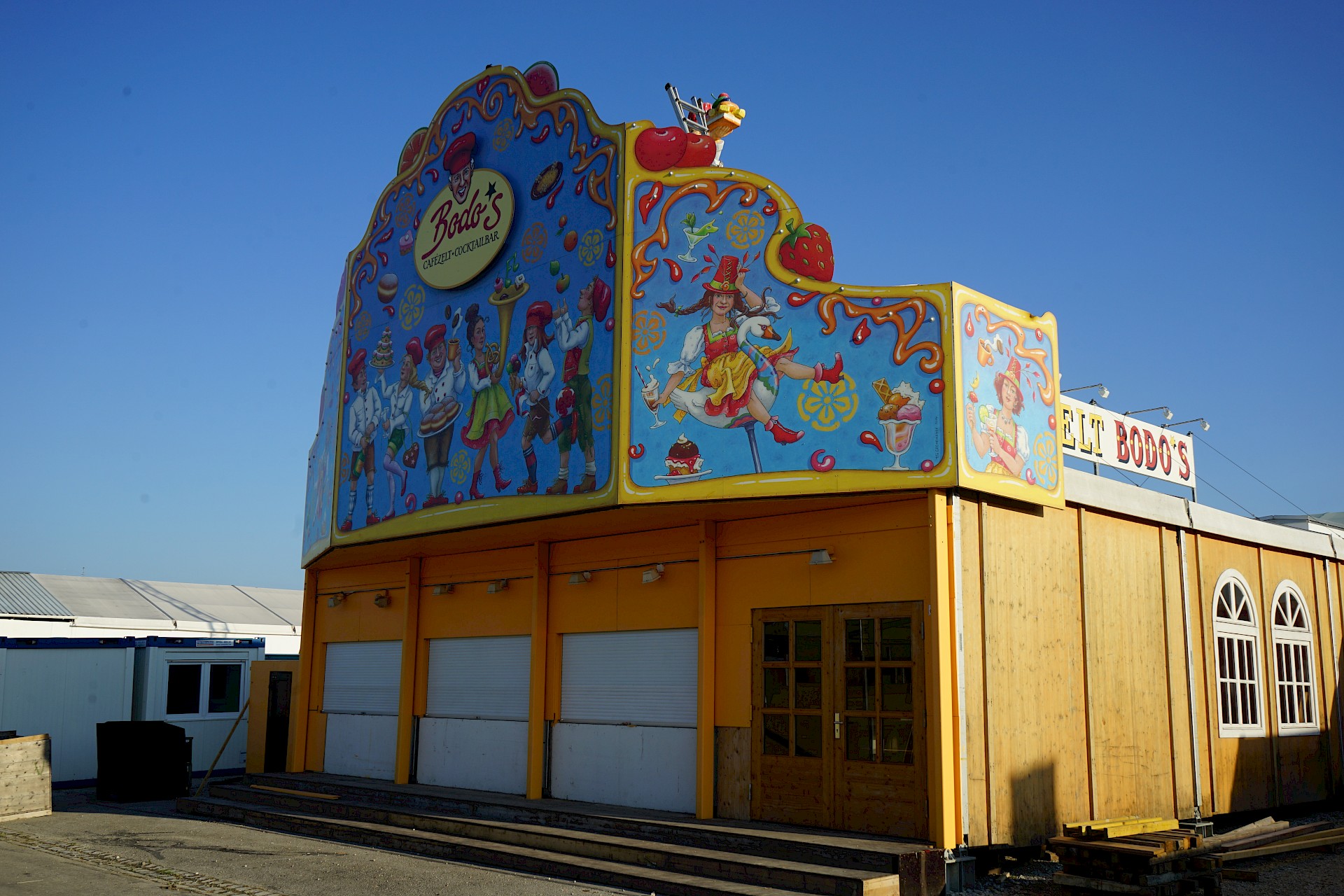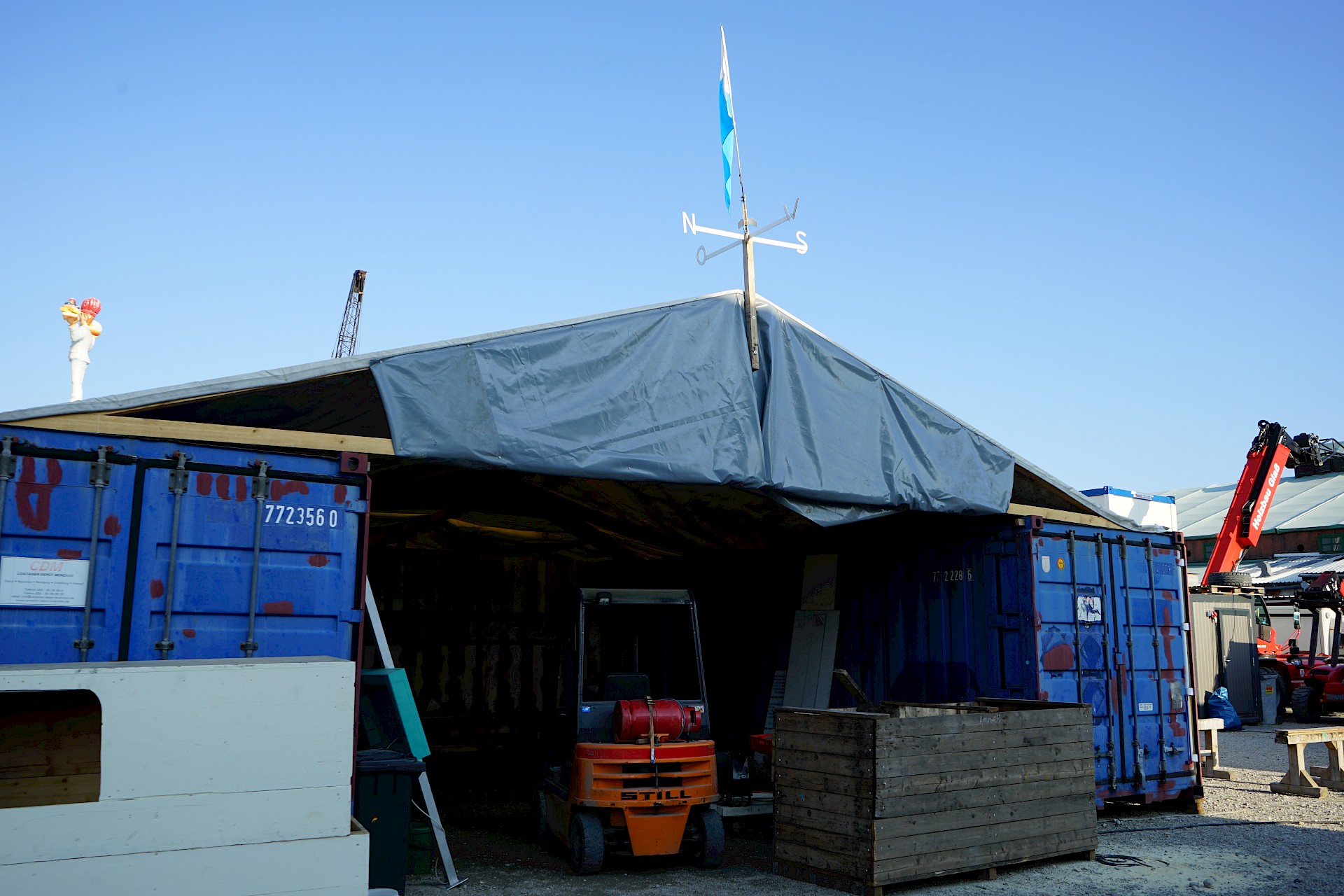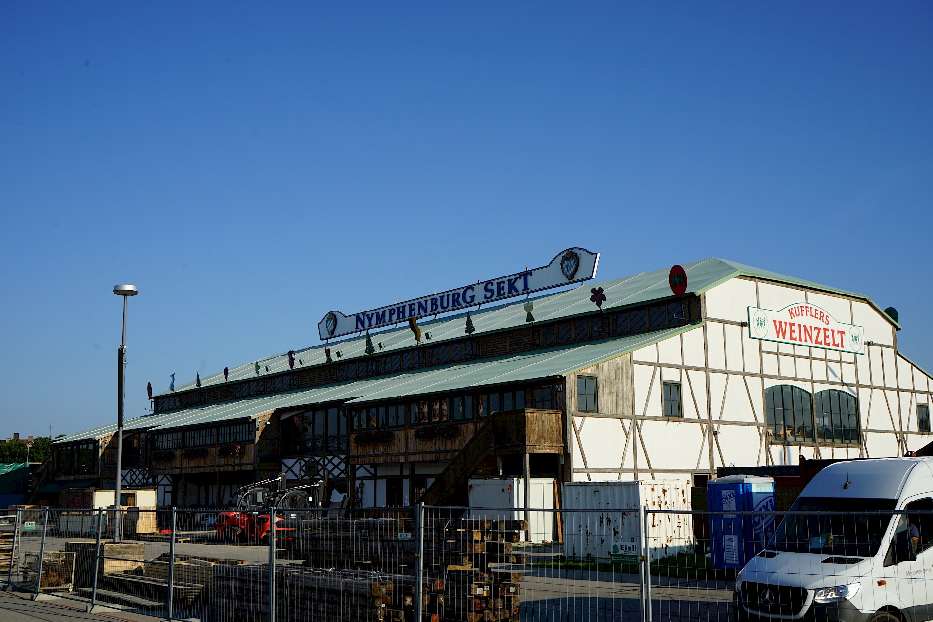 Auf der Oidn Wiesn sind alle vier Zelte im Aufbau, wobei noch nicht einmal die Böden vollständig sind. Im Traditionszelt sieht man immerhin schon ansehnliche neue Kränze.