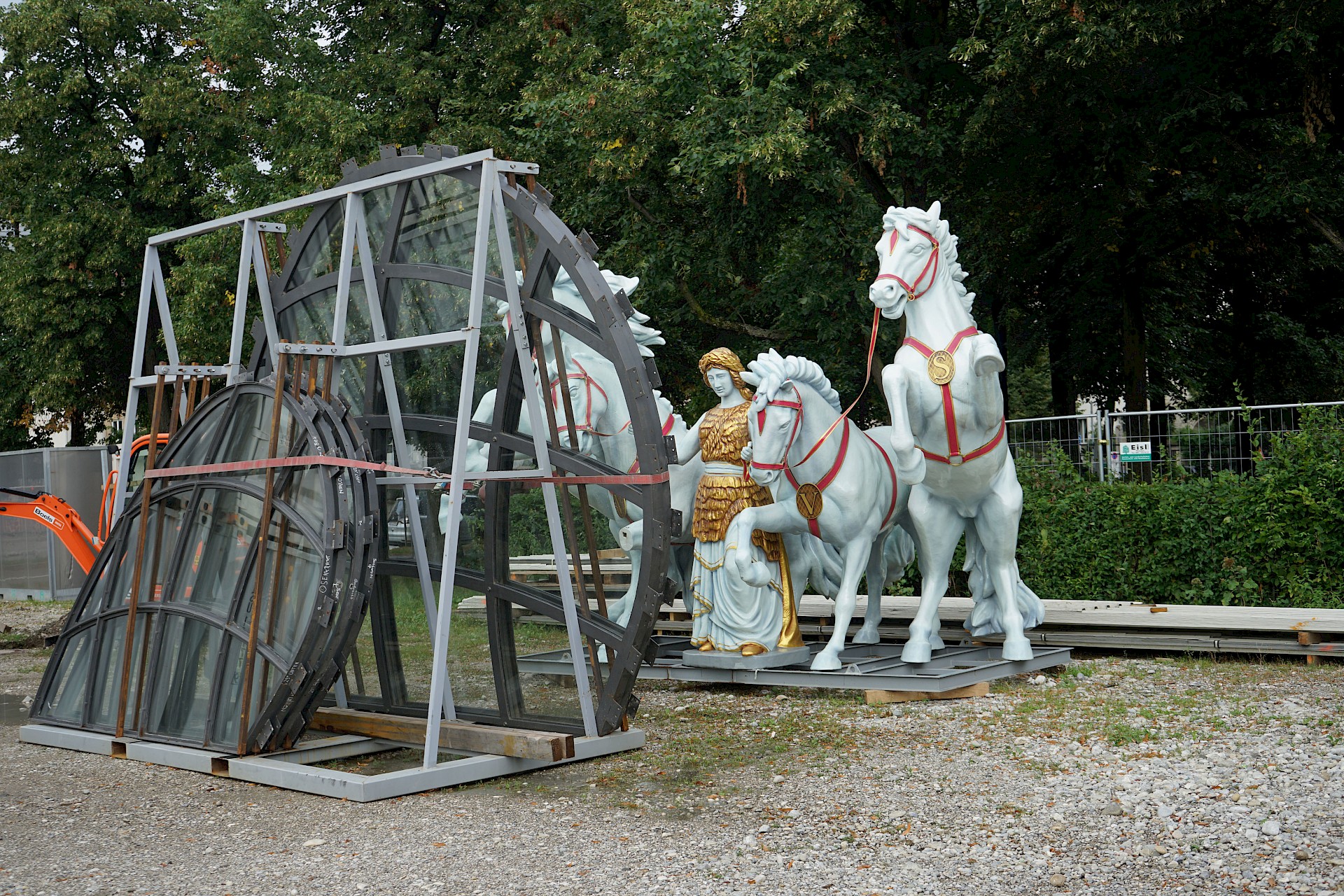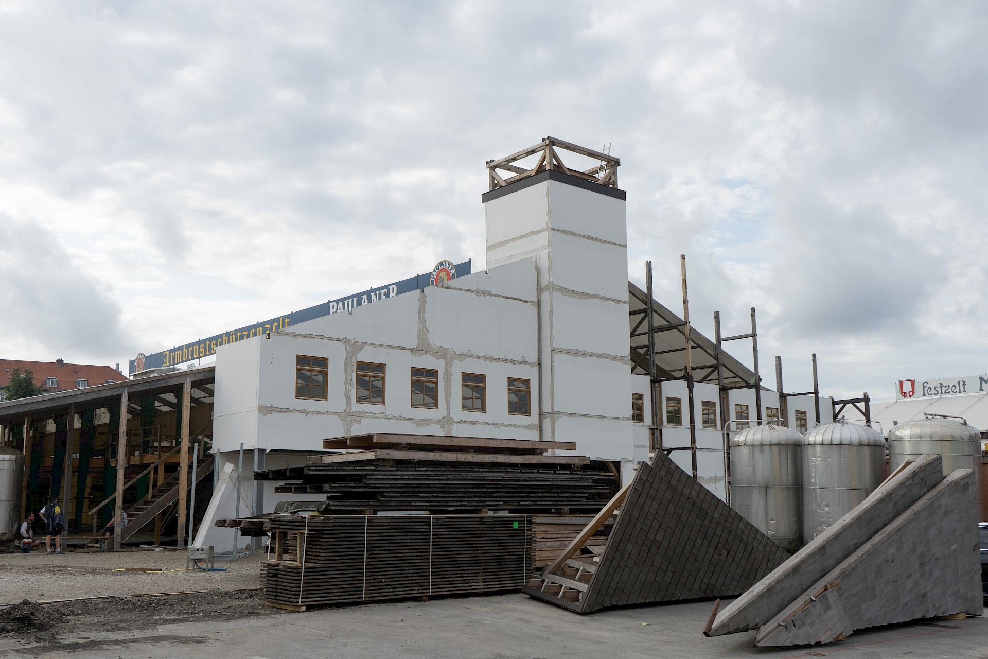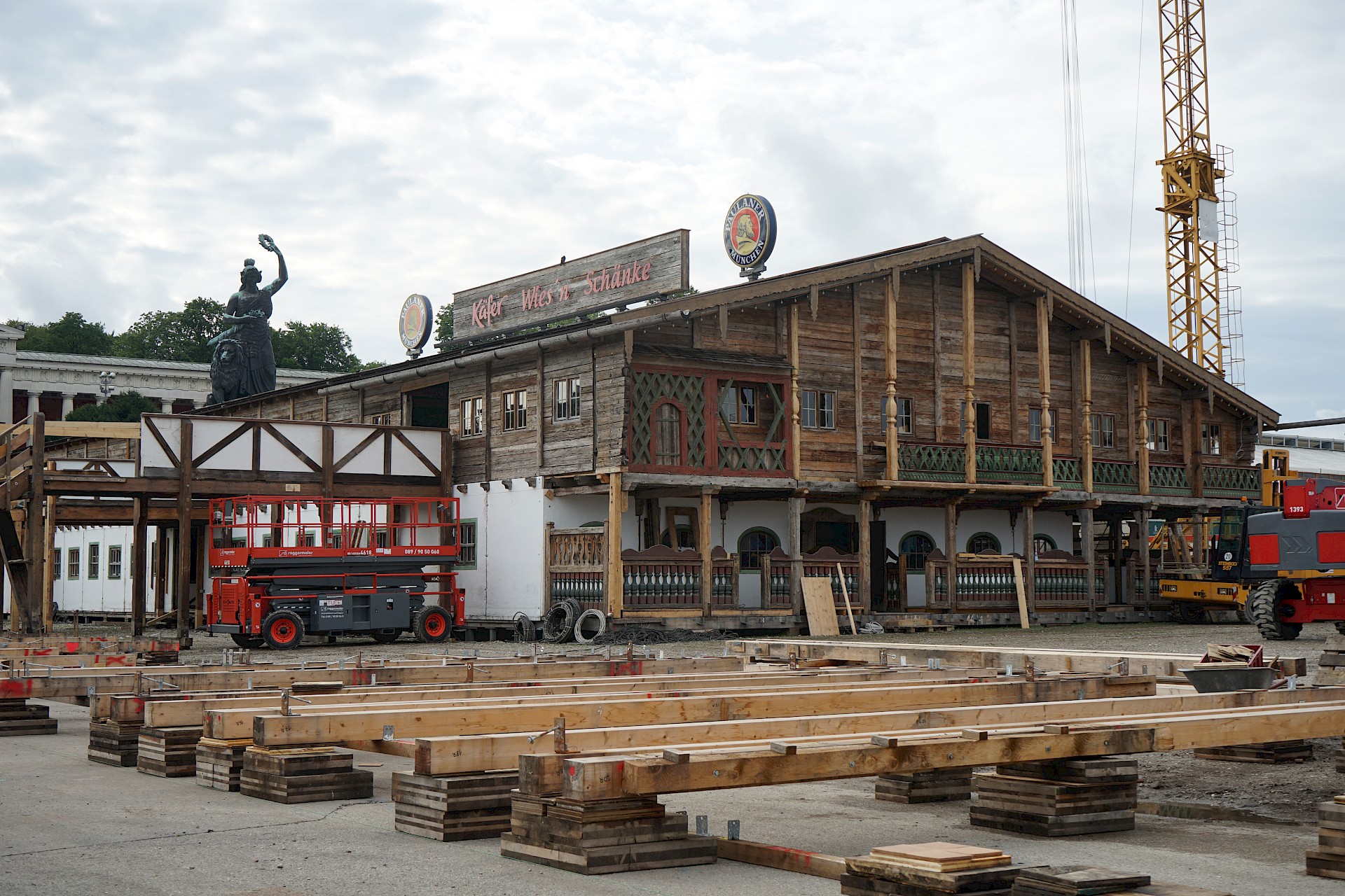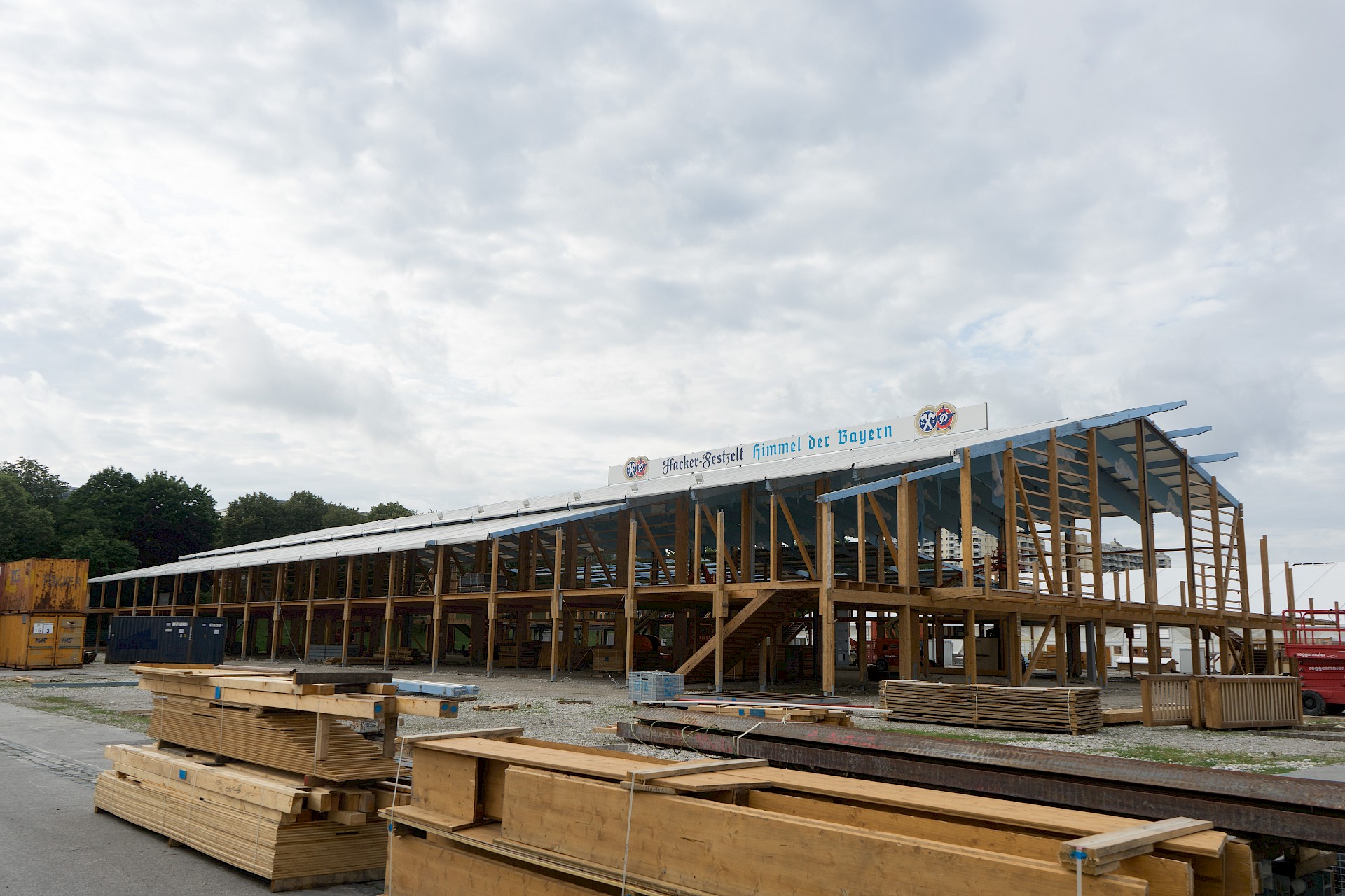 In der vierten Woche des Wiesnaufbaus 2019 sind die ersten Zelte nahezu vollständig eingehaust. Das Hackerzelt, das sonst allerdings noch recht nackert dasteht, verfügt bereits über erste Himmelsteile und der Turm des Augustinerzelts wird auch schön langsam zusammengesetzt. Auch auf der Oidn Wiesn tut sich inzwischen etwas. Das Traditionszelt ist jedoch das einzige Zelt, von dem bislang etwas aufgerichtet worden ist. Aufmerksame Beobachter bemerken dort, dass das Zelt nur teilweise über Fundamente verfügt.