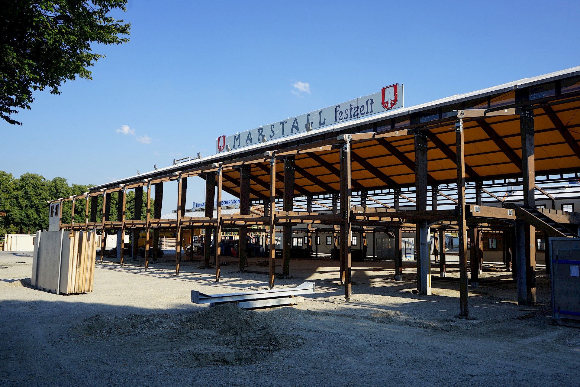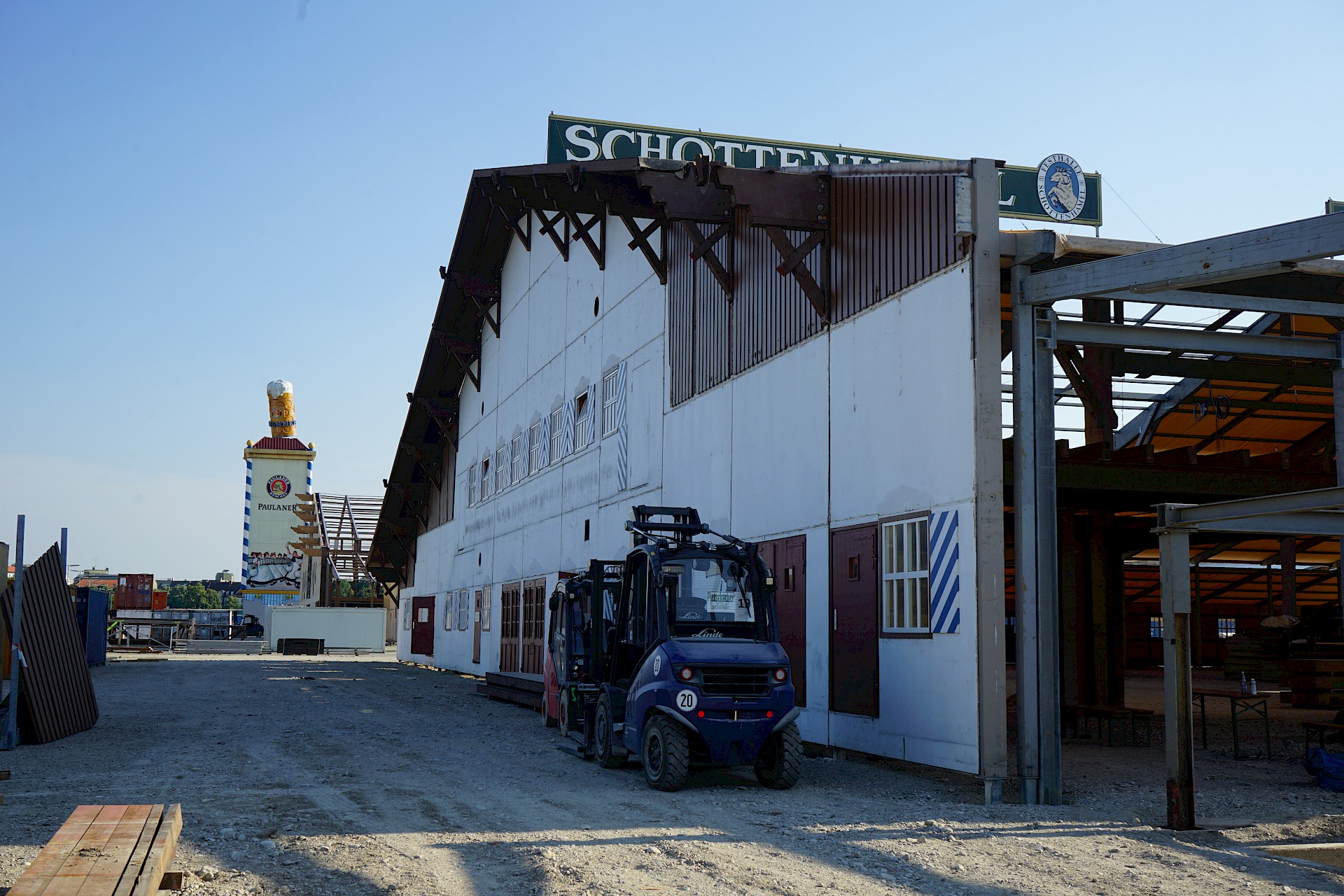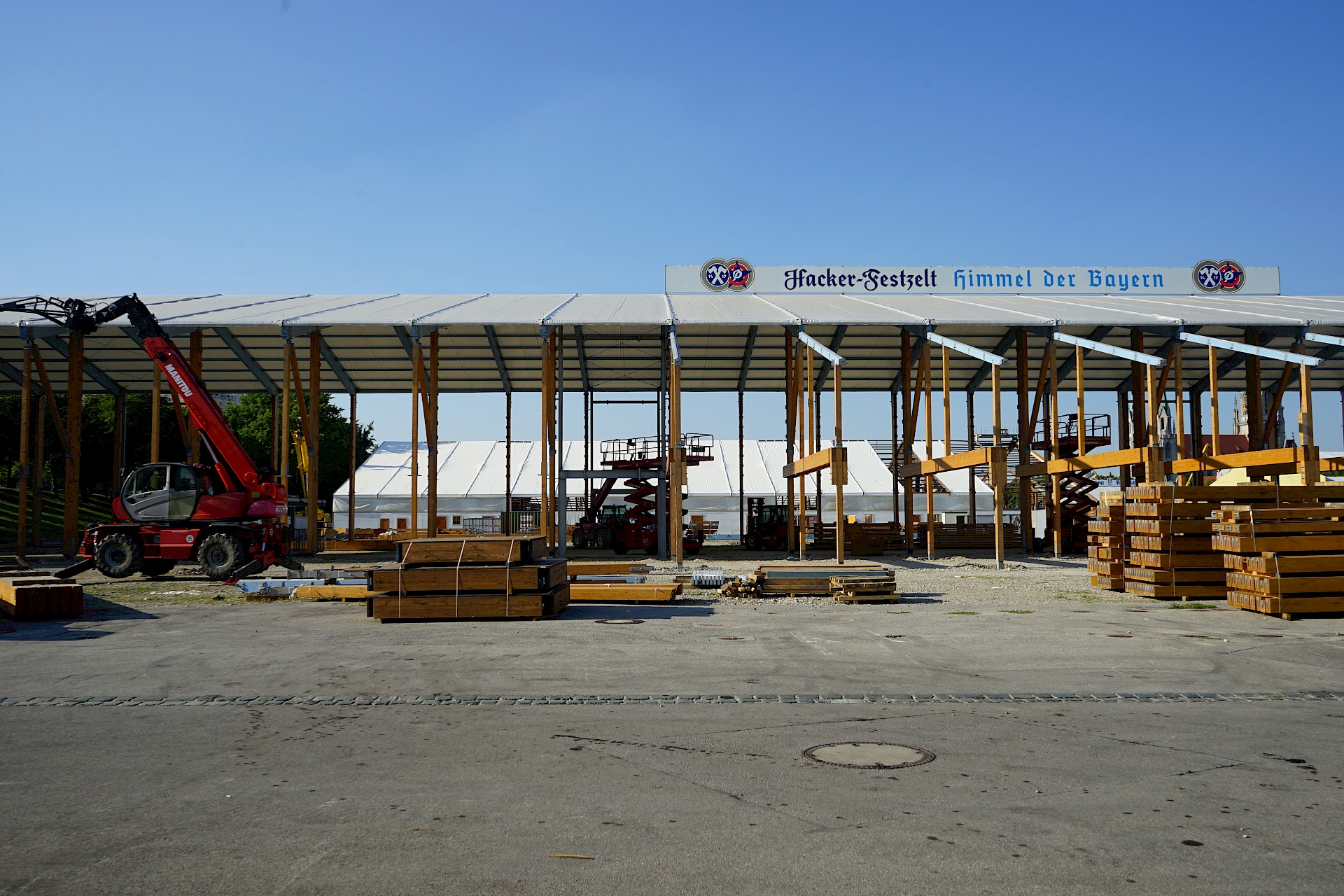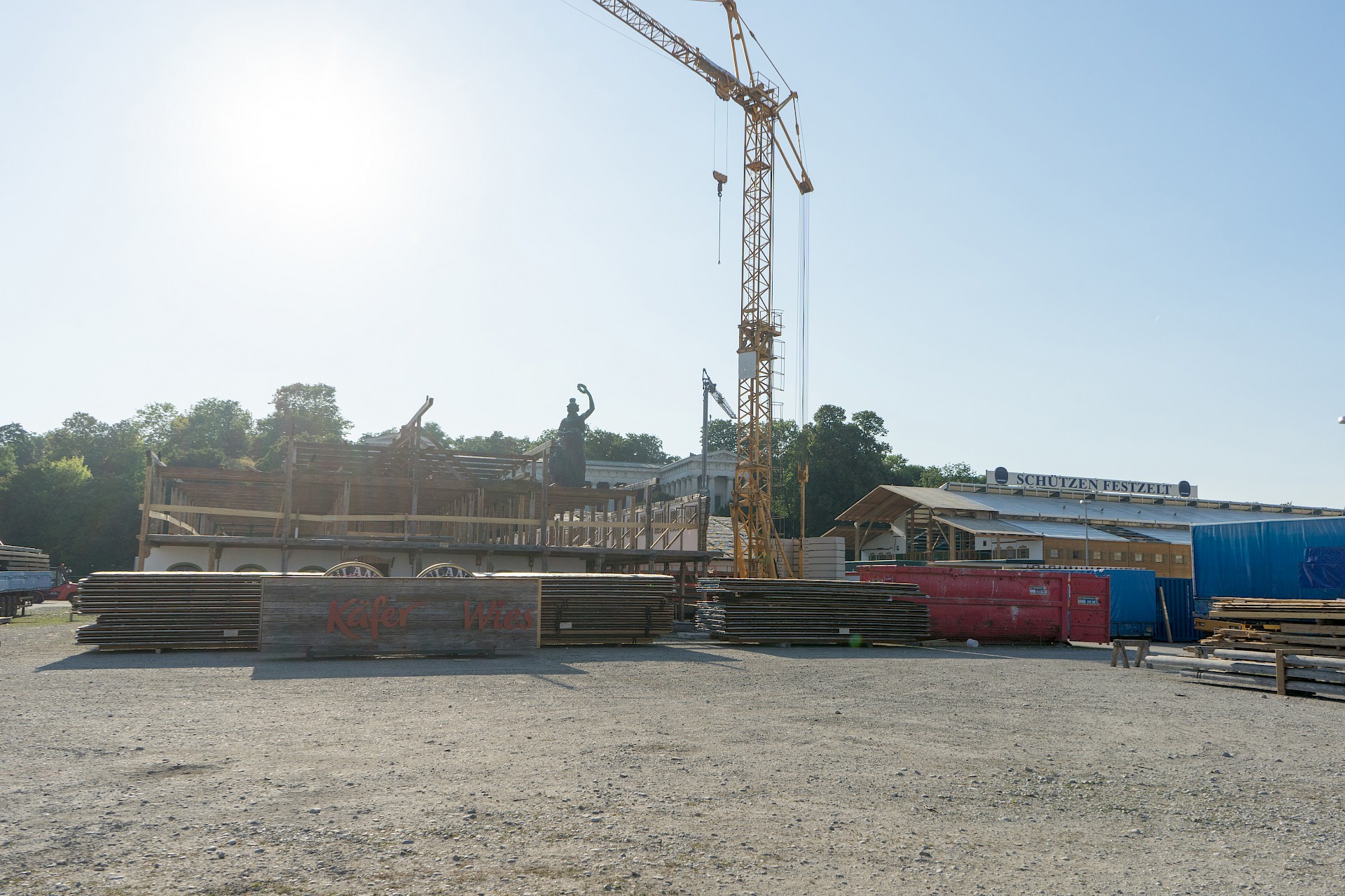 Der Oktoberfestaufbau 2019 ist in Woche weit vorangeschritten. Die Schottenhamel-Festhalle lässt ihr Aussehen immerhin bereits erahnen und auch die Gerüste Nachzügler sind jetzt Großteils aufgestellt, bei der Fischer-Vroni, dem Hackerzelt und für viele Galerien sind aber immer noch einige Fundamente freizulegen. Auch sind bereits die ersten Teile für das erste kleine Zelt, die Kalbsbraterei, aufgetaucht. Auf der Oidn Wiesn wird noch nicht aufgebaut.