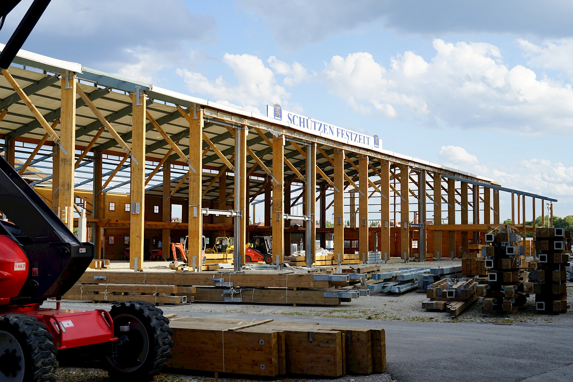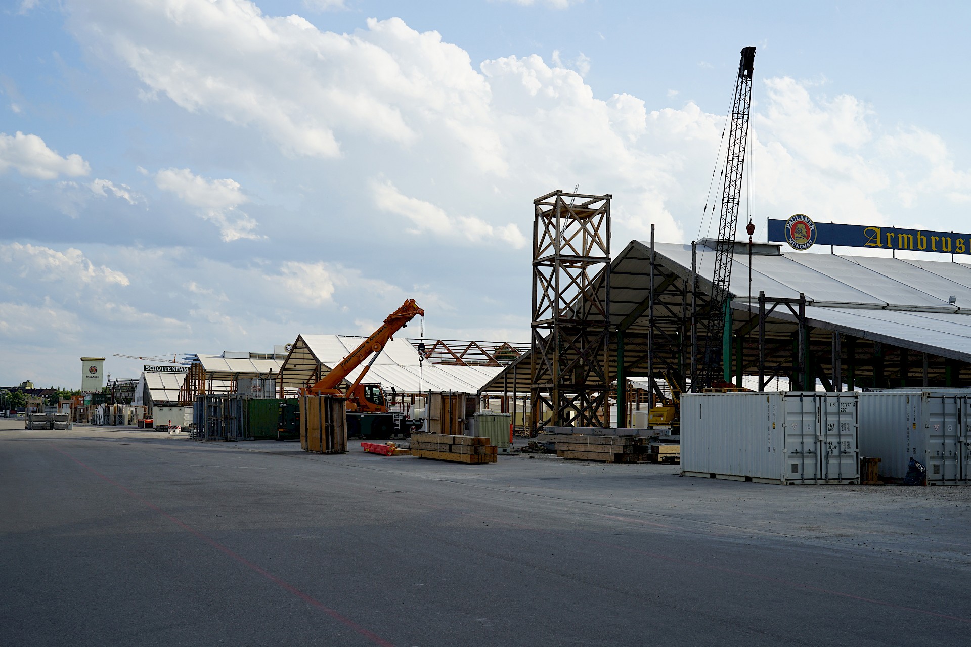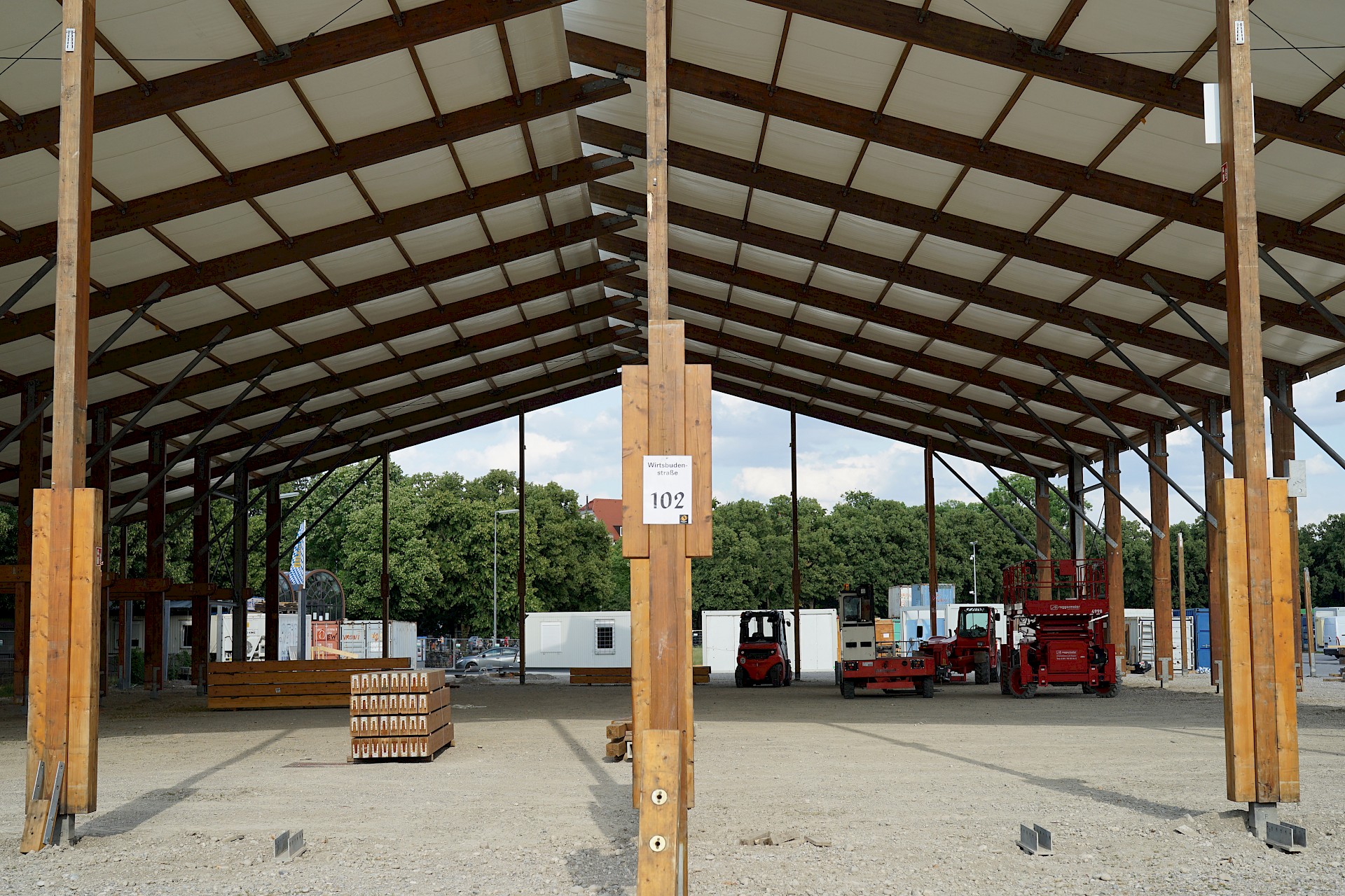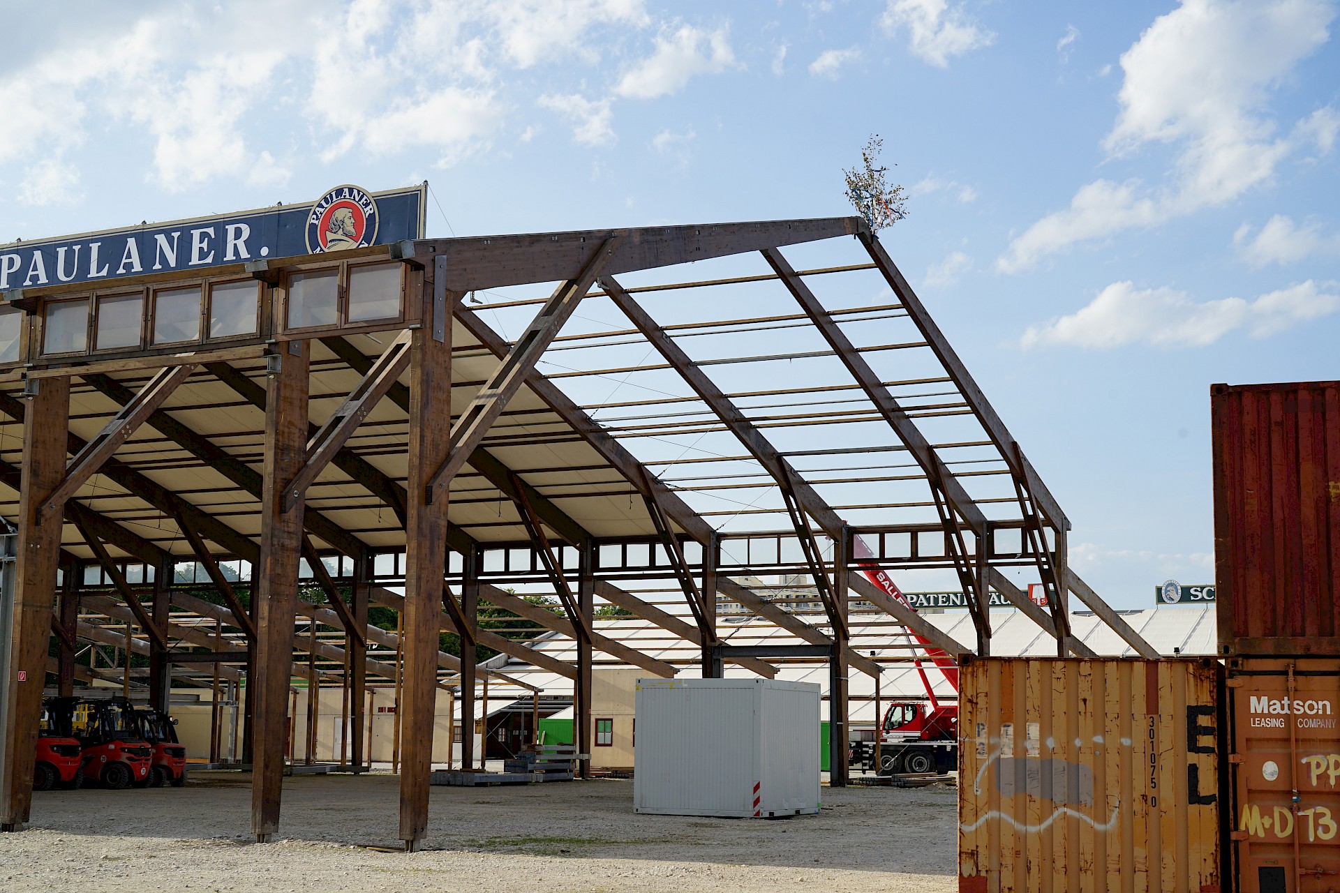 In der zweiten offiziellen Aufbauwoche des Wiesnaufbaus 2023 sind bereits einige Wand- und Deckenteile verbaut. Im Armbrustschützenzelt wurden gar schon die Schänken betoniert.