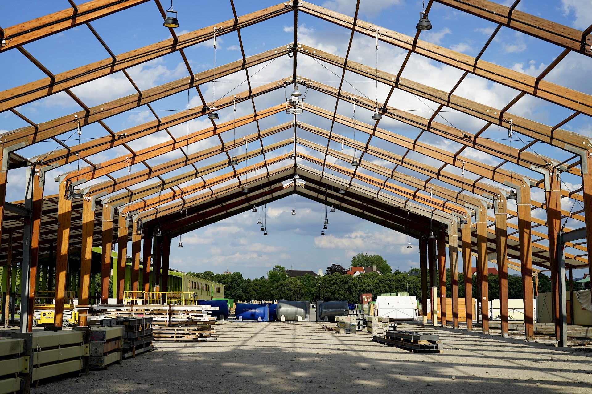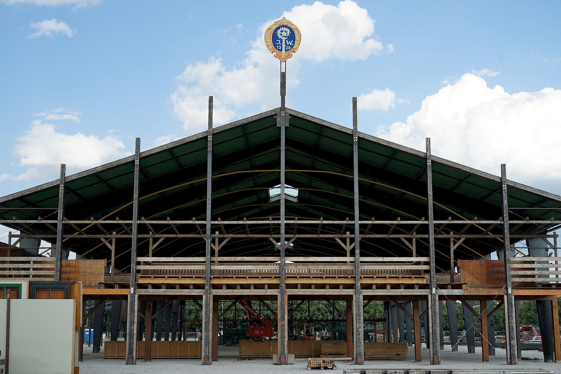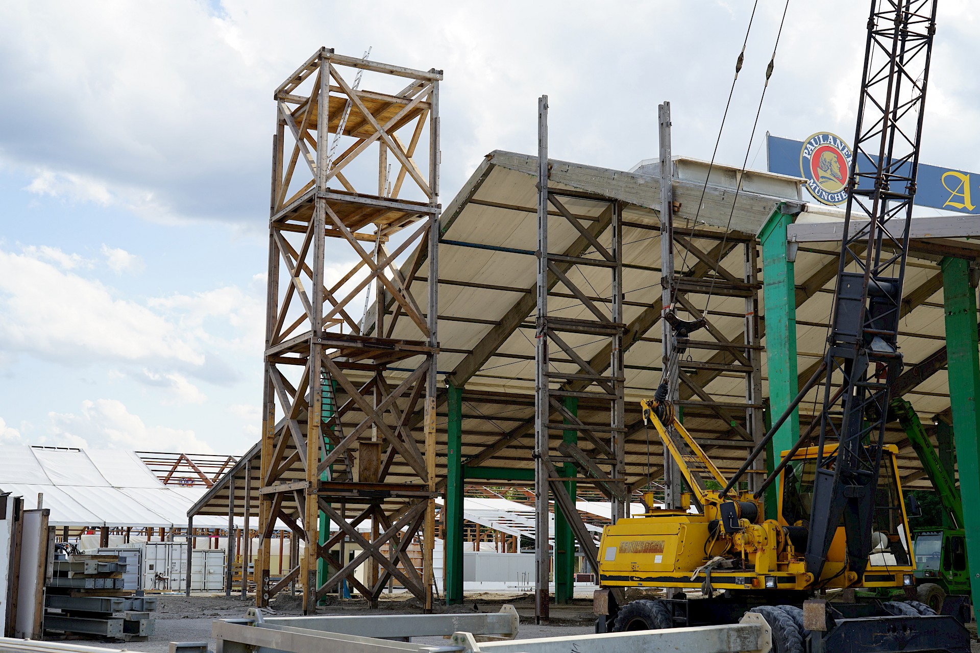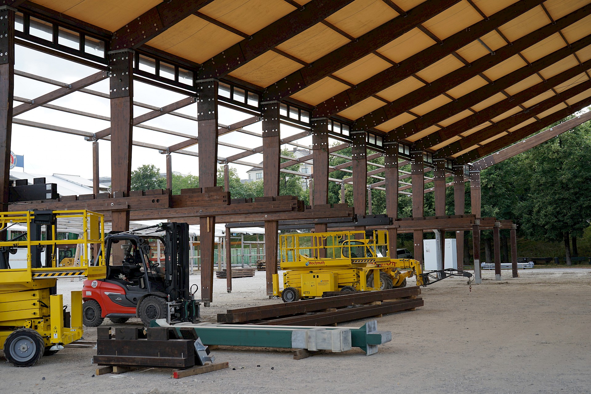 In der zweiten offiziellen Aufbauwoche des Wiesnaufbaus 2023 sind bereits einige Wand- und Deckenteile verbaut. Im Armbrustschützenzelt wurden gar schon die Schänken betoniert.
