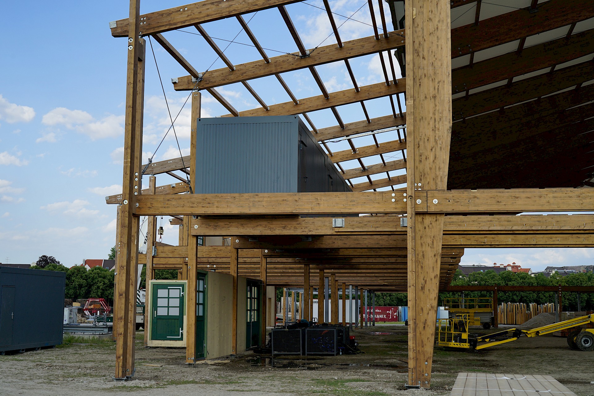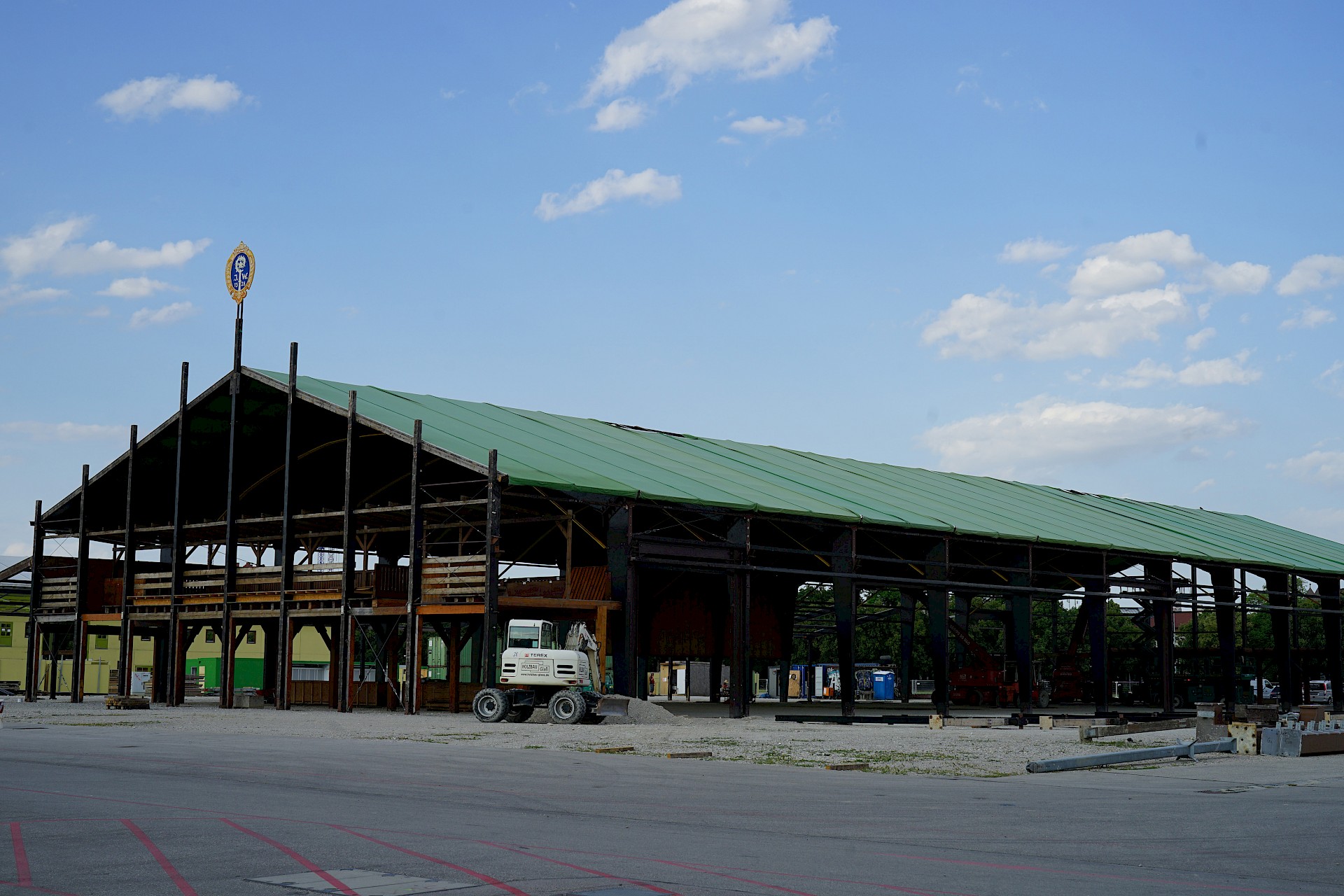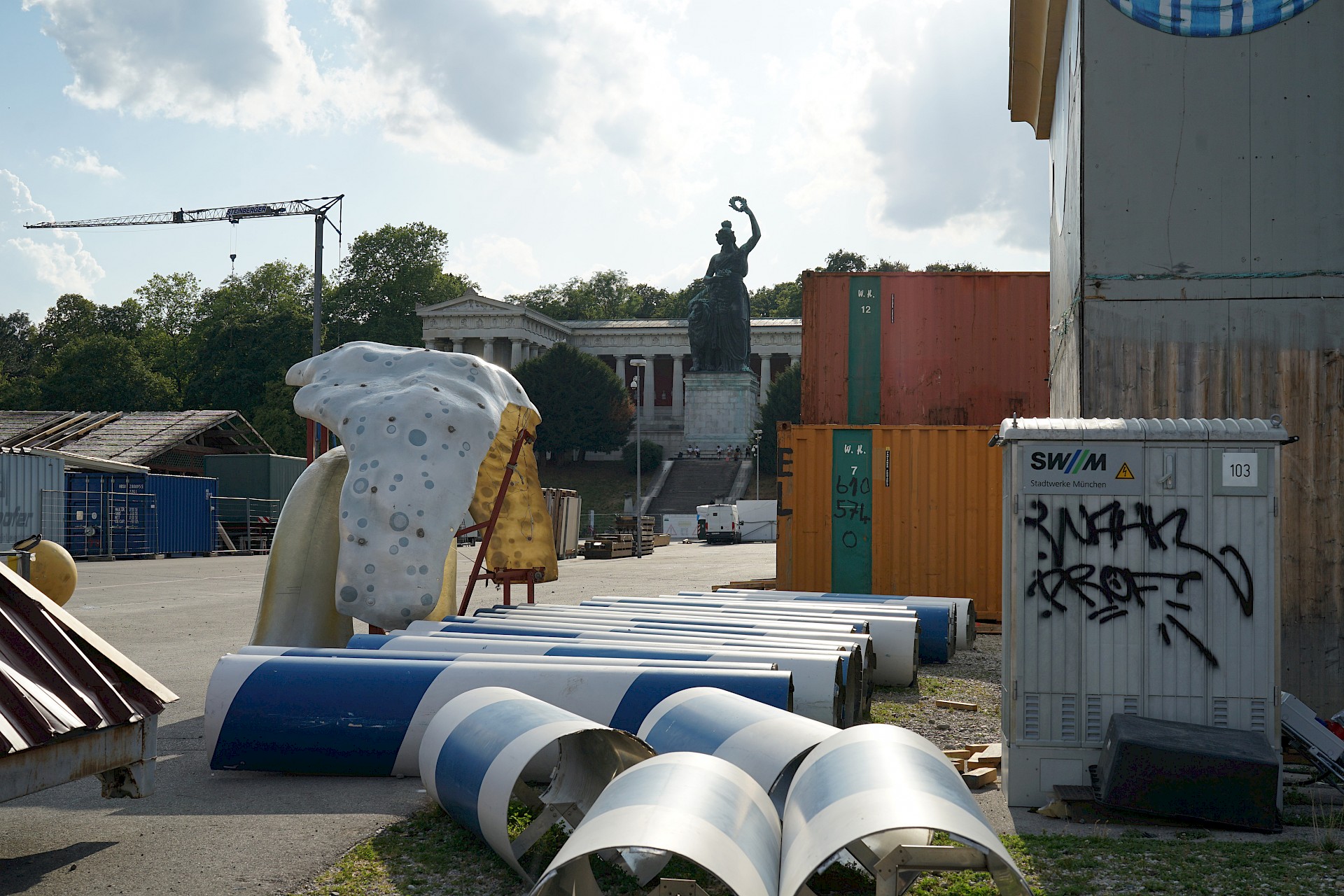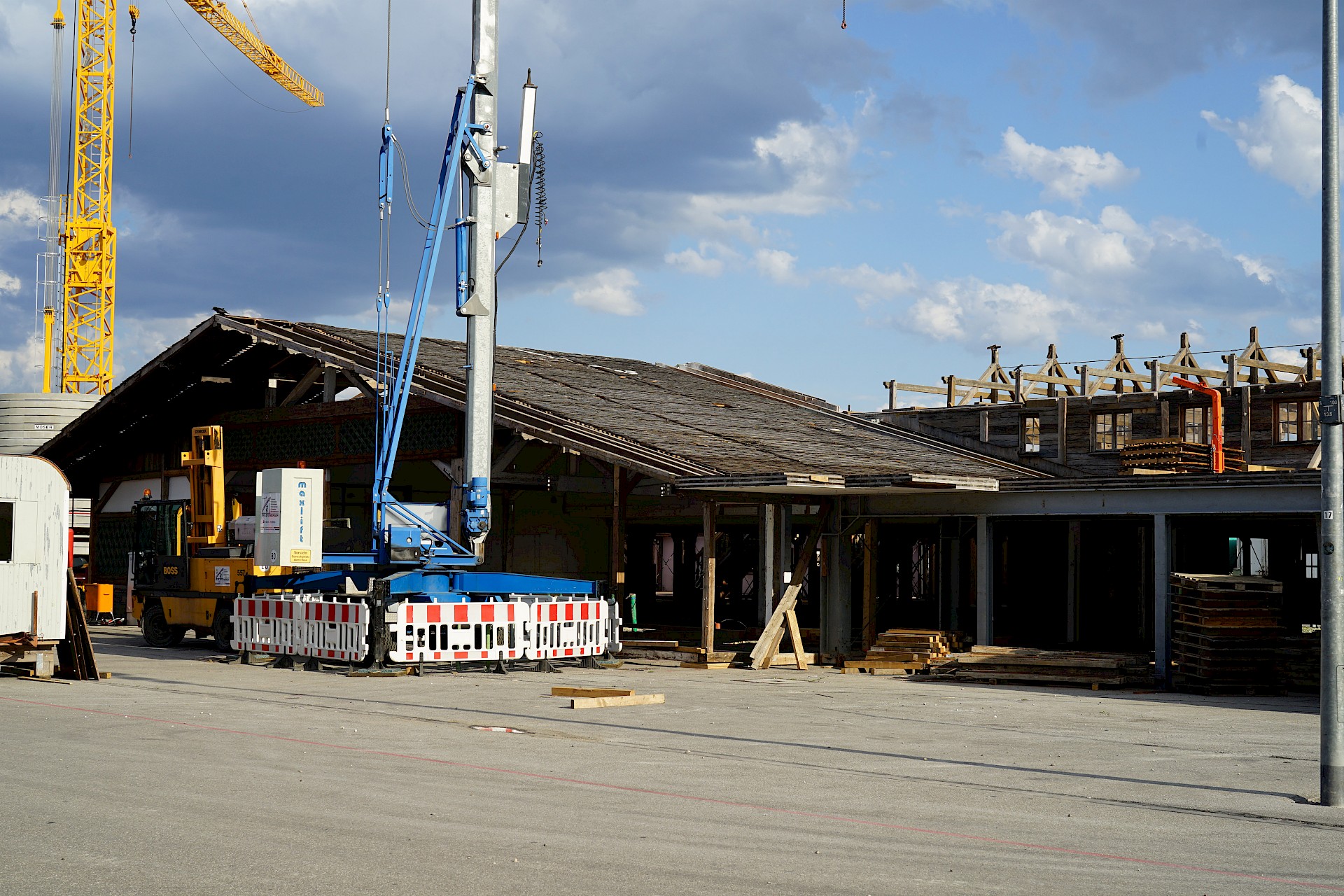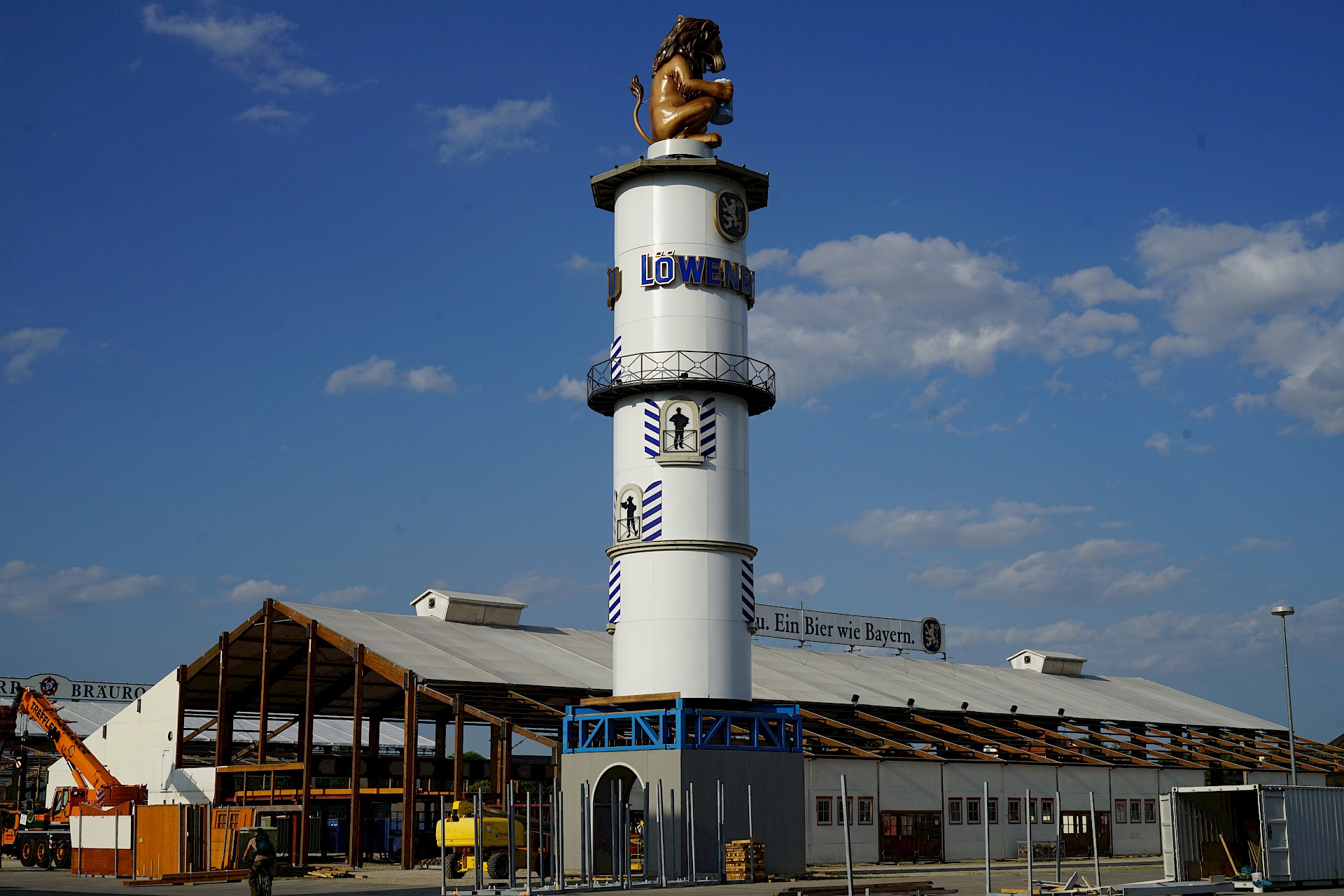 In der zweiten offiziellen Aufbauwoche des Wiesnaufbaus 2023 sind bereits einige Wand- und Deckenteile verbaut. Im Armbrustschützenzelt wurden gar schon die Schänken betoniert.