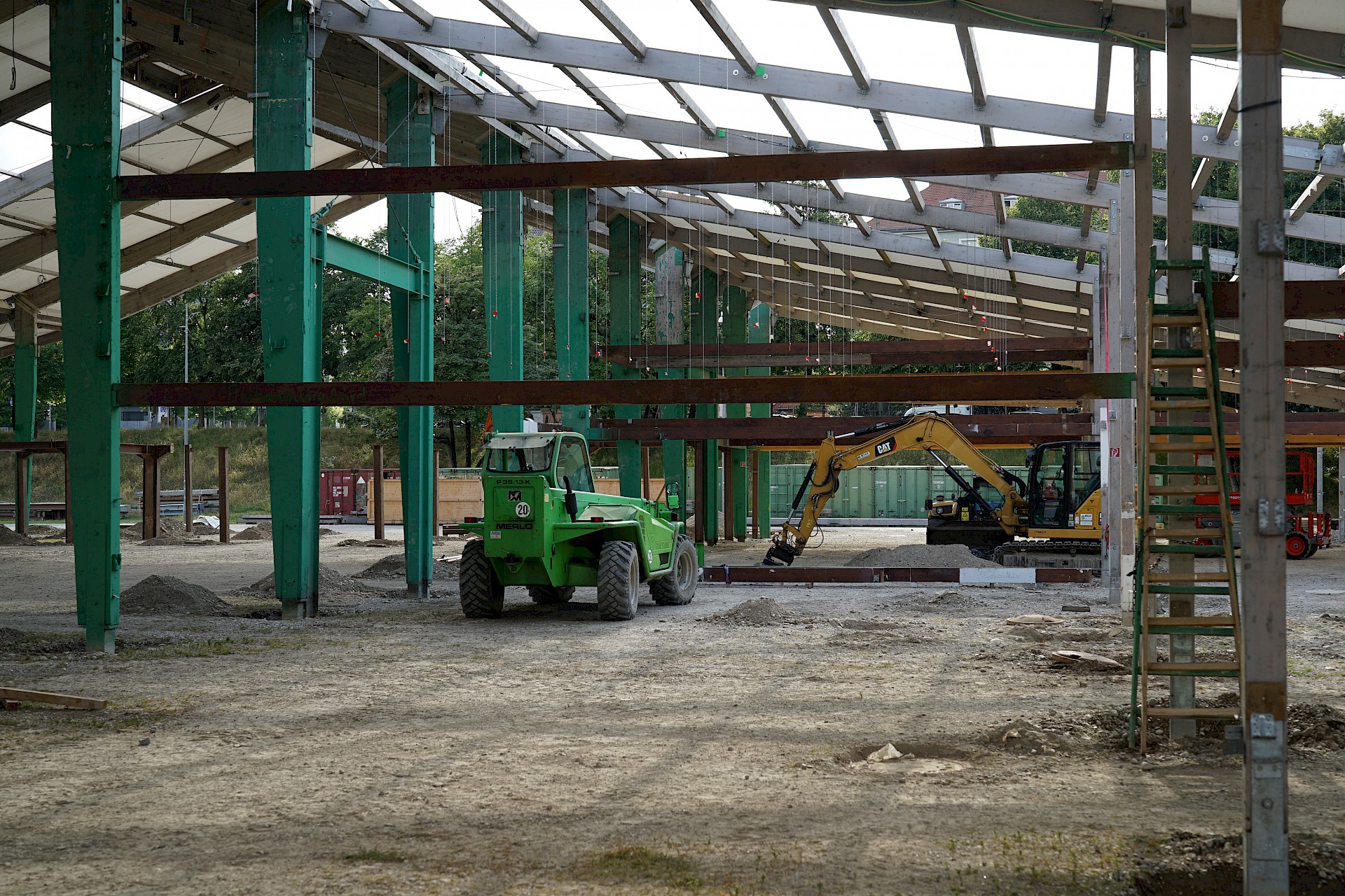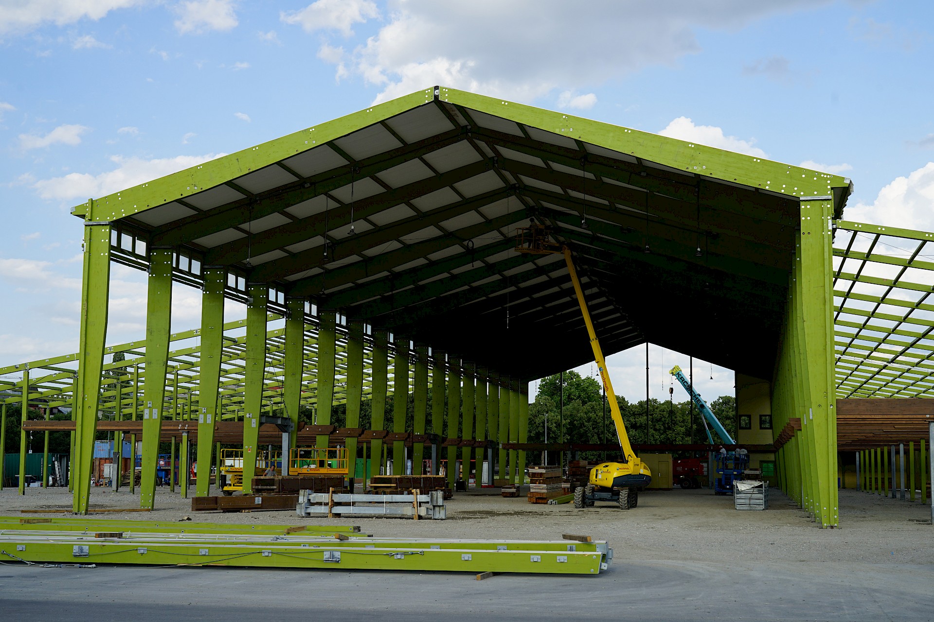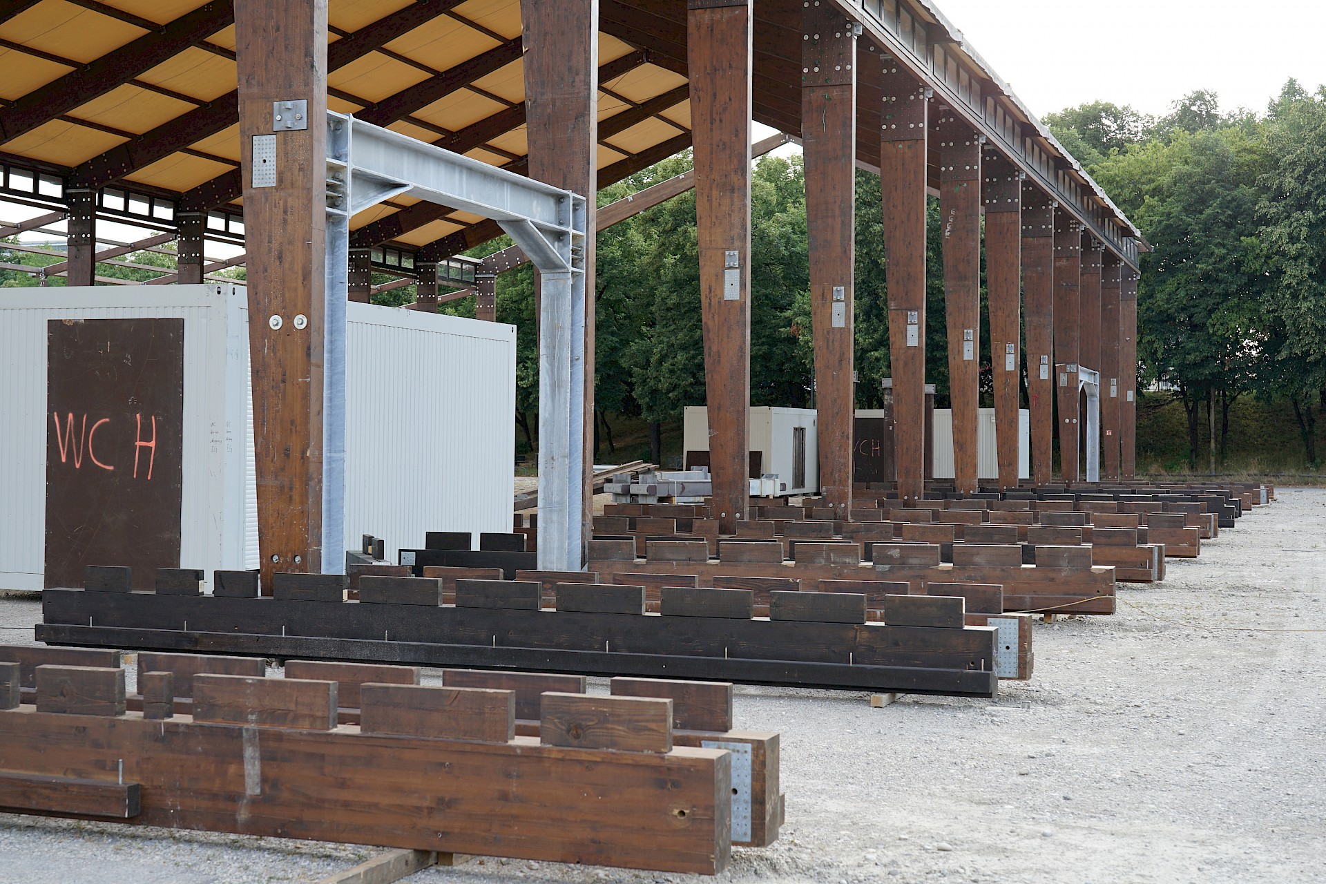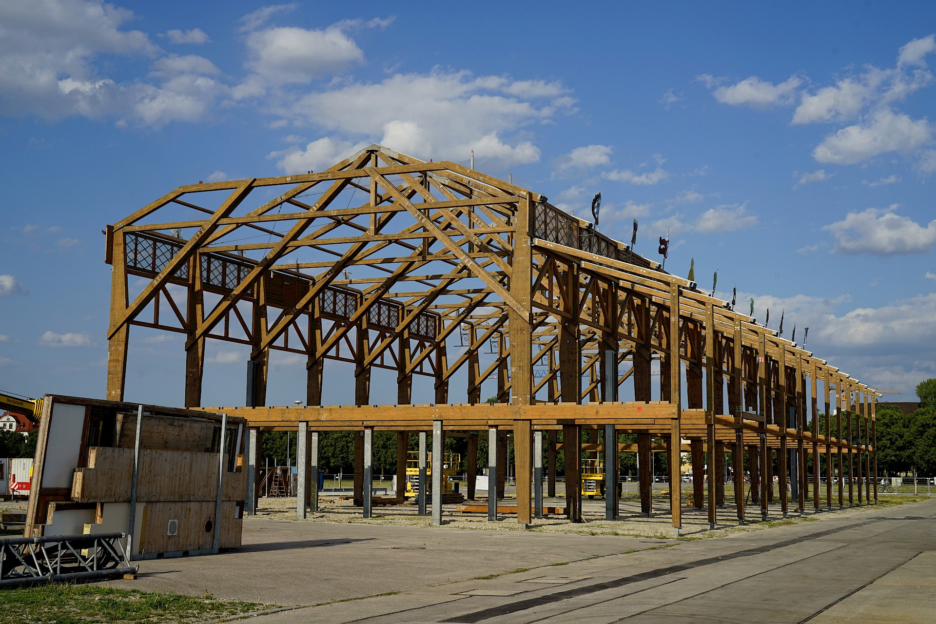 In der zweiten offiziellen Aufbauwoche des Wiesnaufbaus 2023 sind bereits einige Wand- und Deckenteile verbaut. Im Armbrustschützenzelt wurden gar schon die Schänken betoniert.