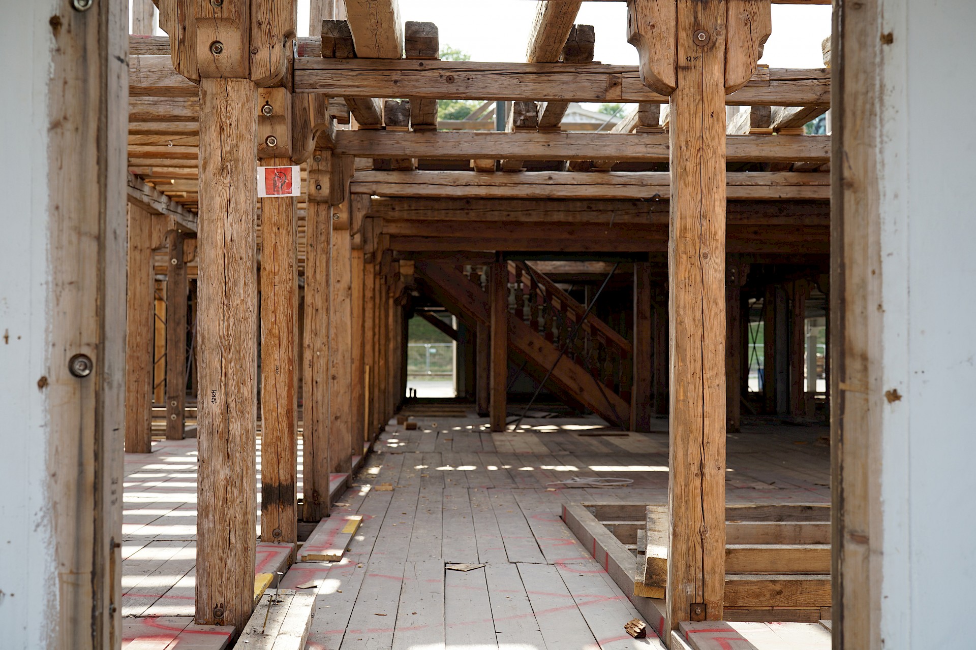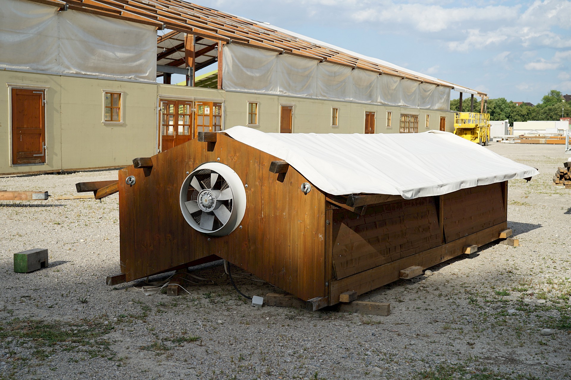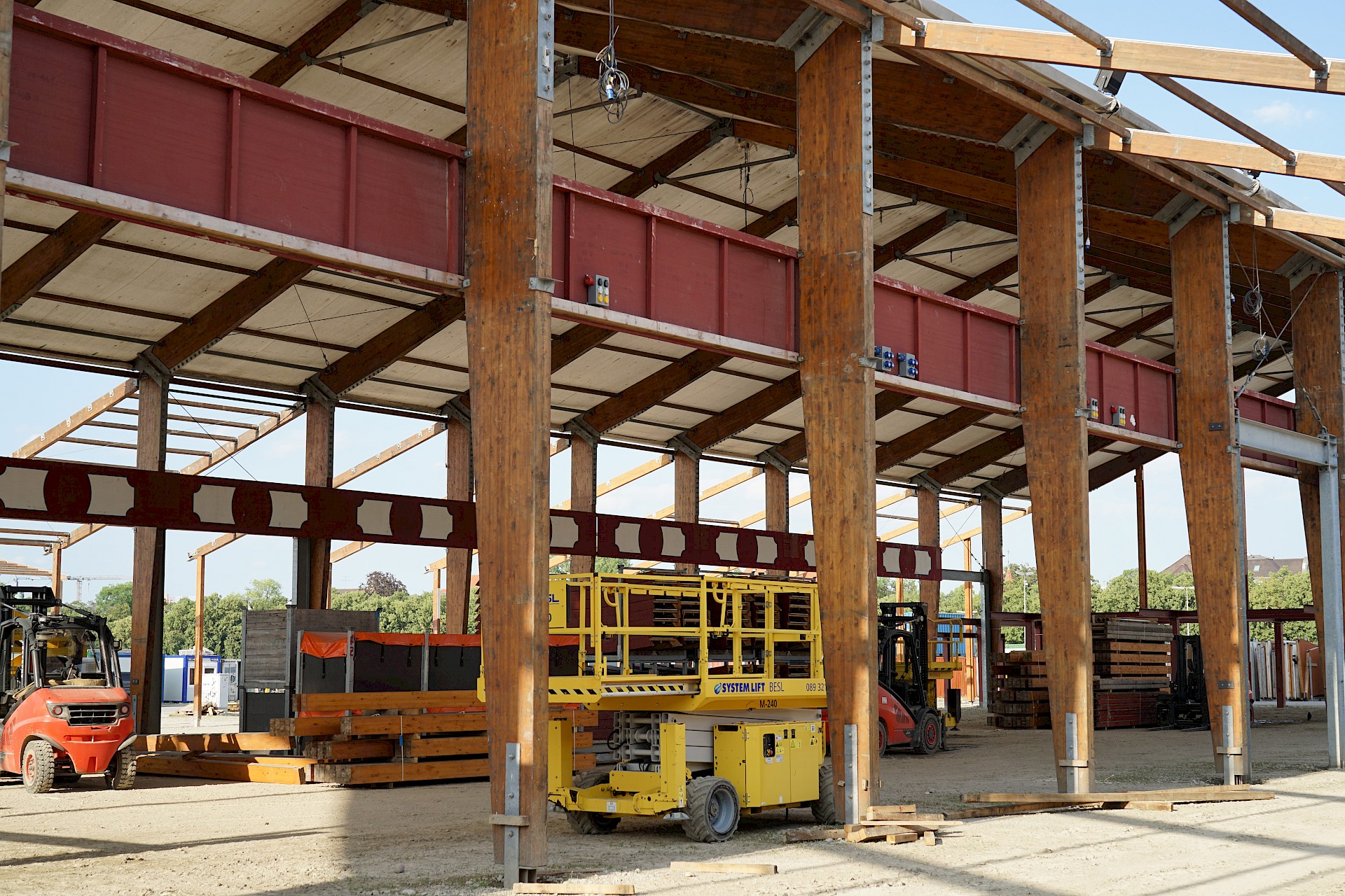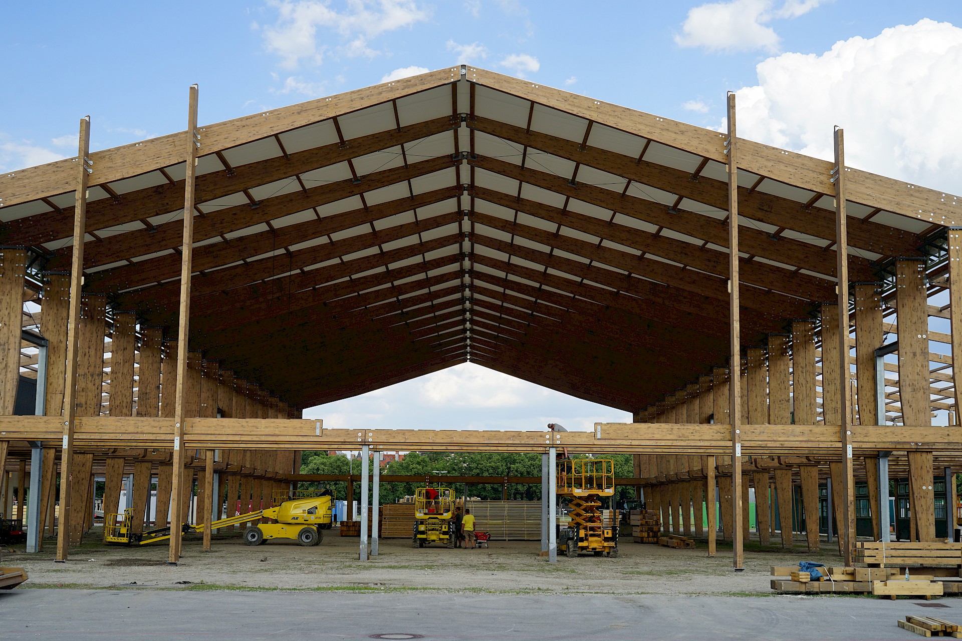 In der zweiten offiziellen Aufbauwoche des Wiesnaufbaus 2023 sind bereits einige Wand- und Deckenteile verbaut. Im Armbrustschützenzelt wurden gar schon die Schänken betoniert.