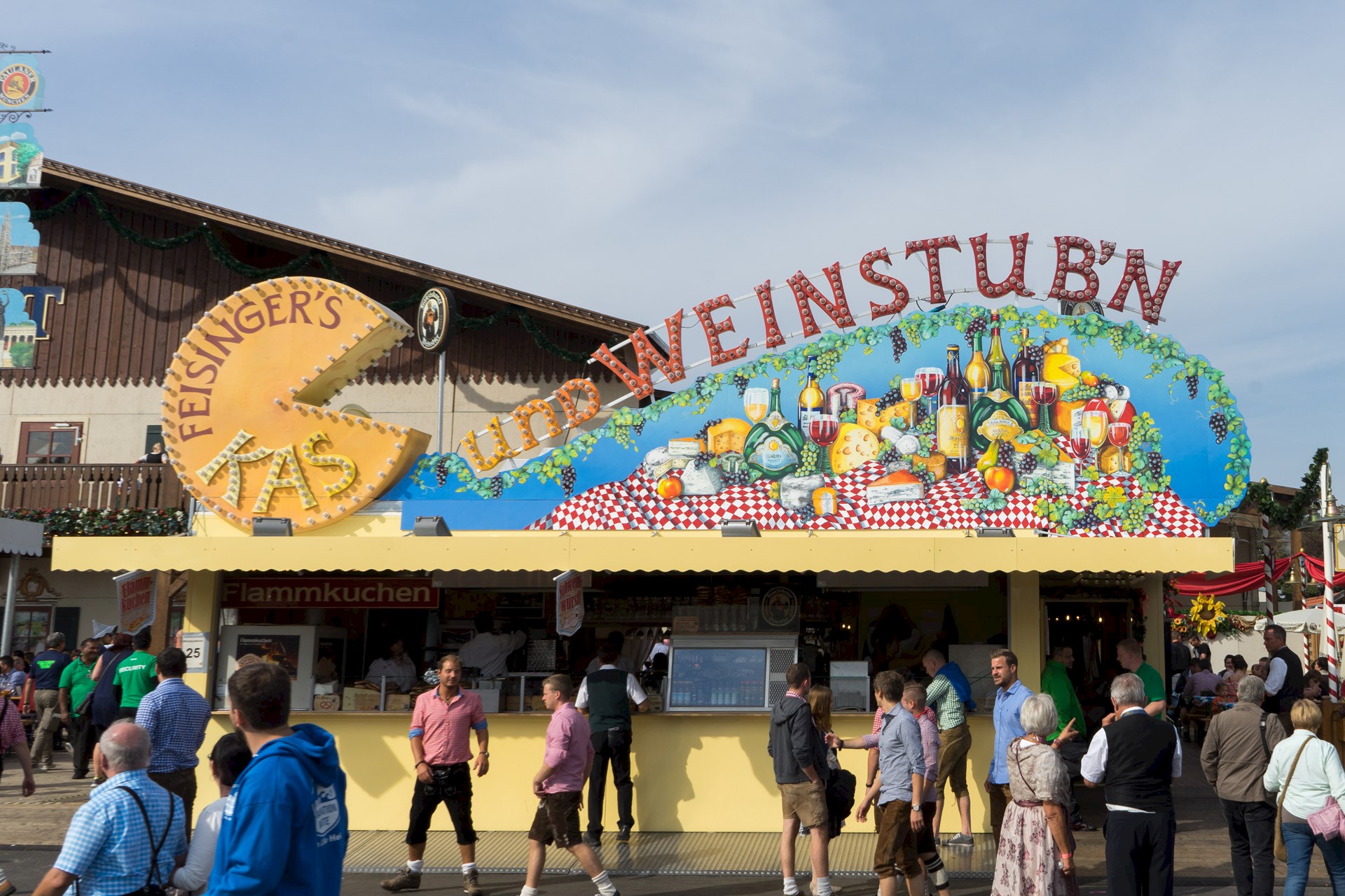 Auch wenn sich die Wiesn in den letzten gut 200 Jahren immer mehr als Bierfest etabliert hat, wird dort ebenso nach wie vor Wein ausgeschenkt. Und dies nicht nur im Weinzelt, das einem beim Thema Wein wenig überraschend als Erstes einfallen dürfte, sondern schon seit 1983 auch in der Kas- und Weinstubn der Familie Feisinger. Und ungewöhnlich ist bei den Feisingers nicht nur der Weinausschank, sondern neben der geringen Größe und der Existenz eines Weißbiergartens auch der Rest der Speisenkarte. Freilich gibt es allerlei verschiedene Käsesorten, dazu aber auch Raclette, Flammkuchen, heiße Kartoffeln und Aufläufe. Wer es lieber klassisch möchte, wird bei Schupfnudeln und Schweinswürstln glücklich.