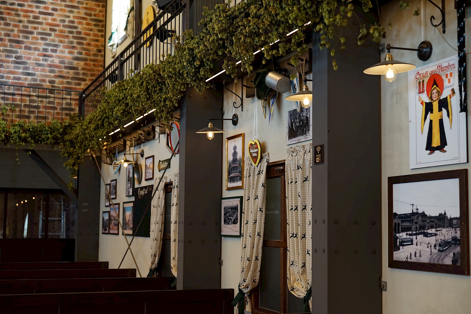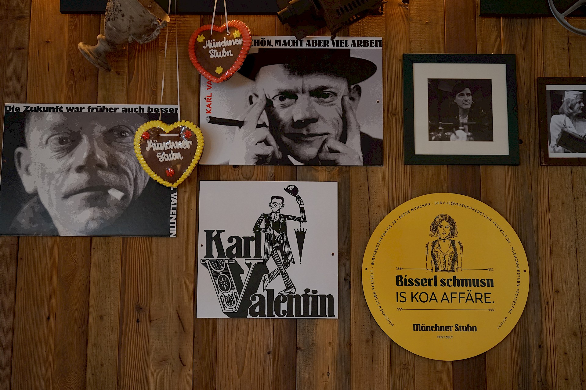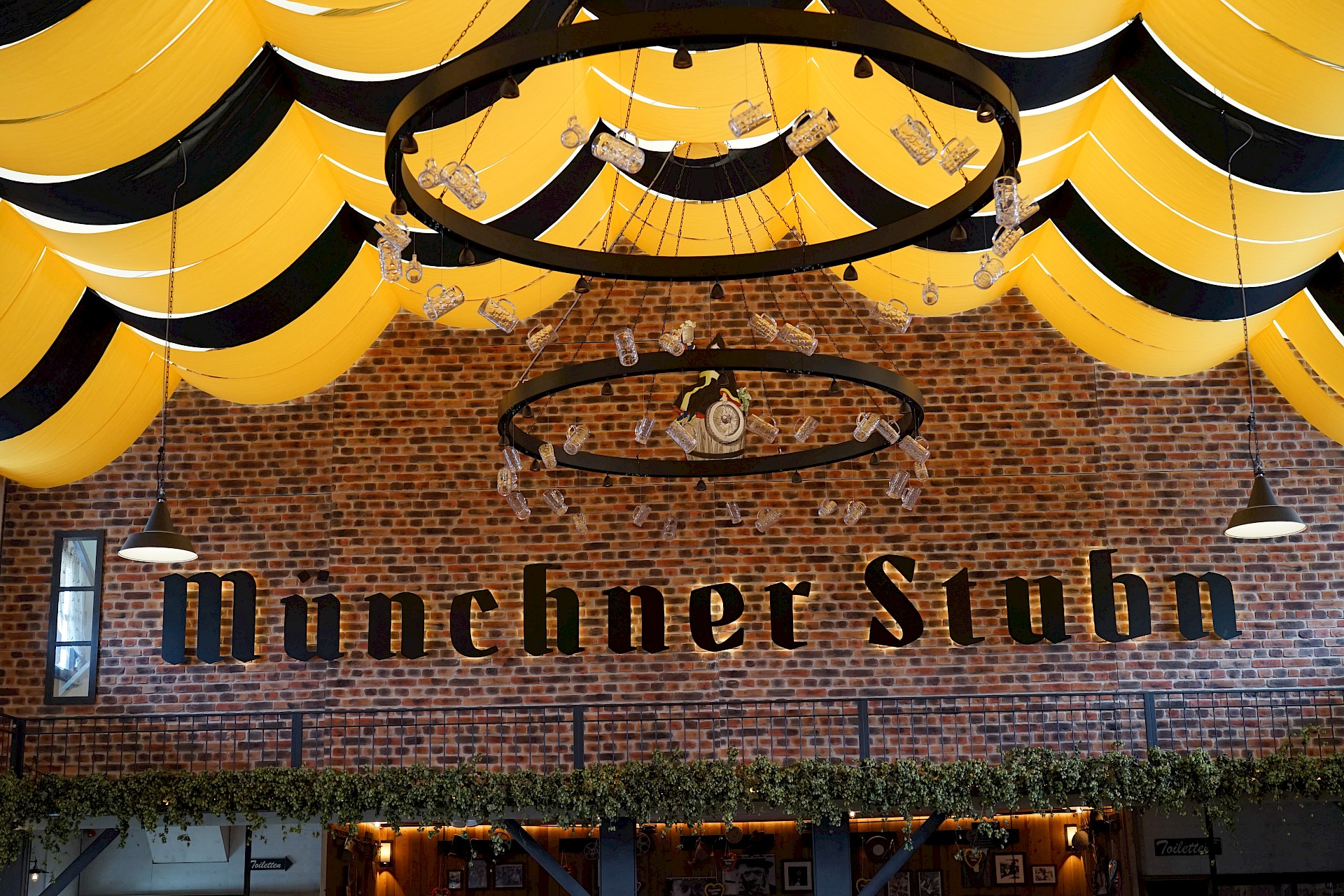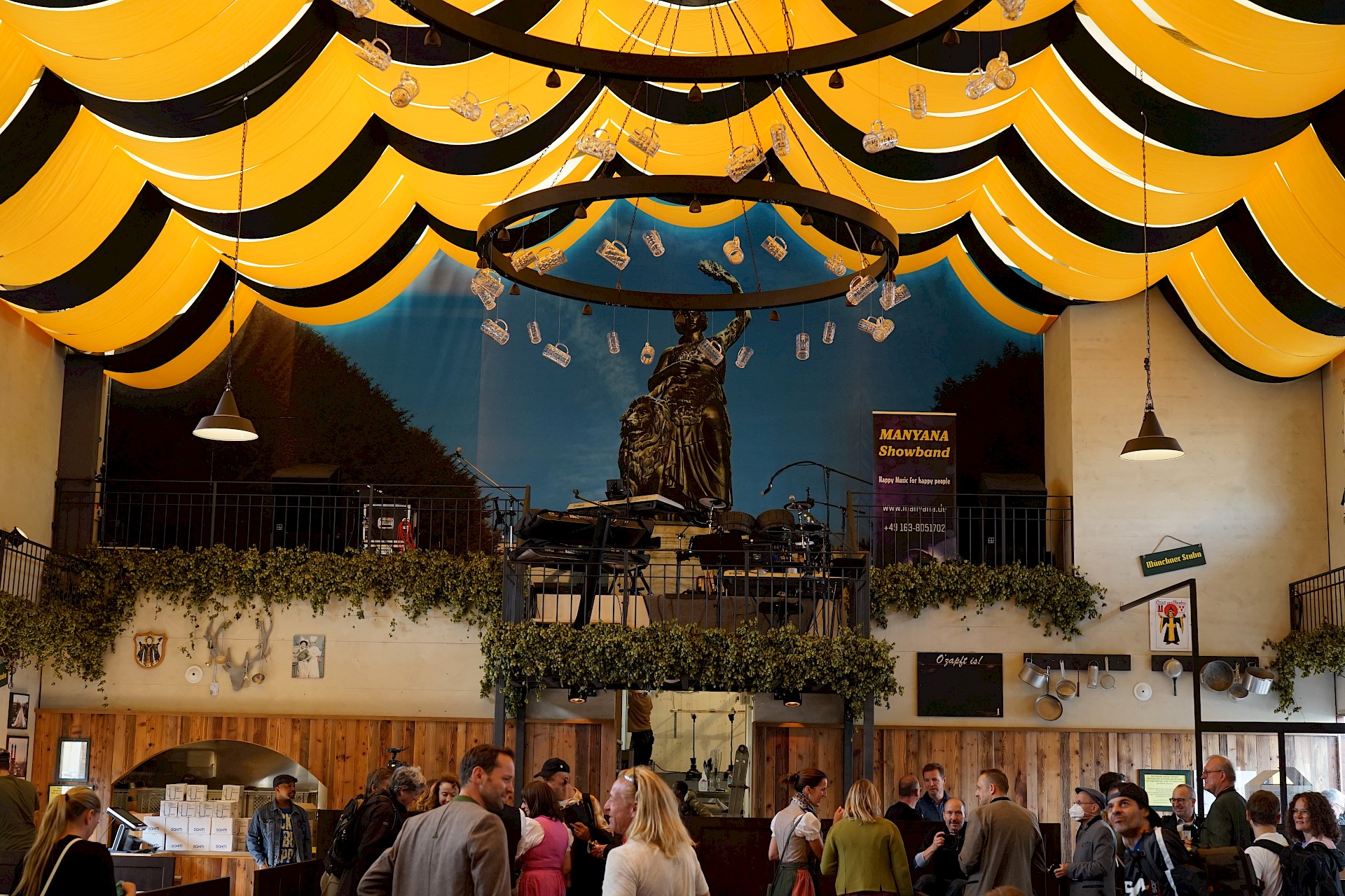 Die Münchner Stubn will ihrem Namen alle Ehren machen und platziert seine Gäste und schwarz-gelben Tuchbahnen. Von der Rückwand des Musikpodiums schaut die Bavaria auf die Besucher herab. Das andere Zeltende gibt sich sehr zeitgenössisch, mit dem großen, von hinten beleuchteten Schriftzug an der Backsteinwand. Diese ist eine Referenz auf das Stammhaus der Wirtsleute, die Münchner Stubn am Hauptbahnhof, die ebenfalls recht modern daherkommt.